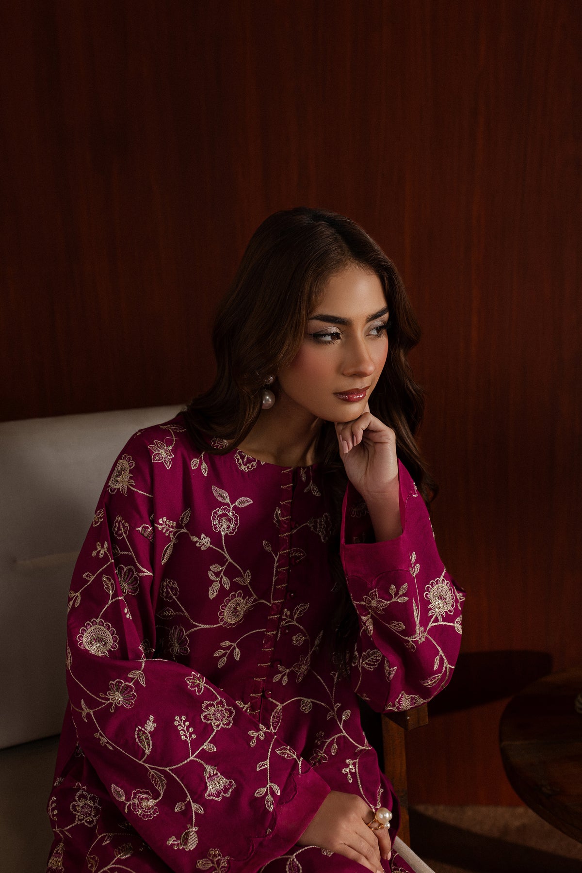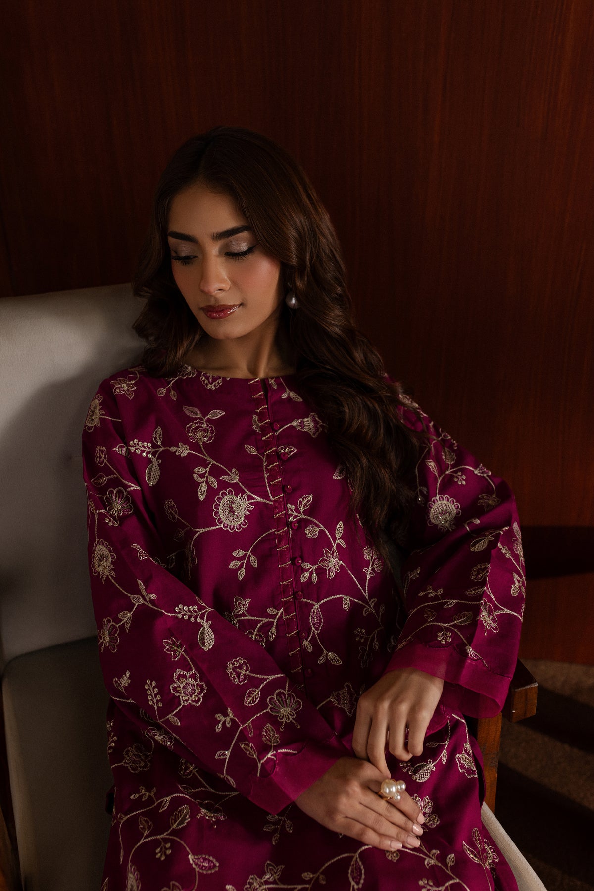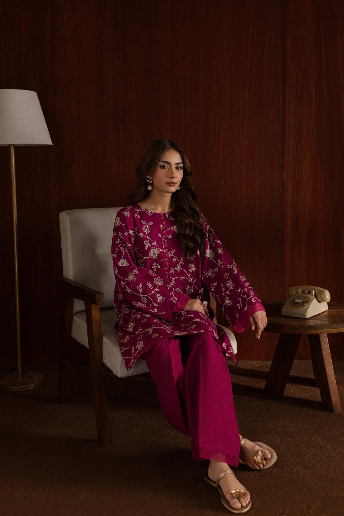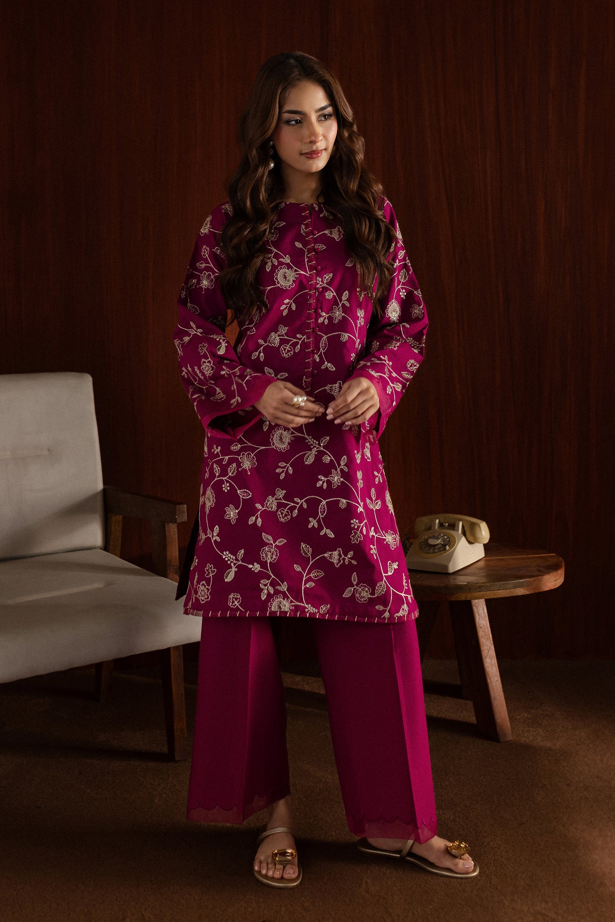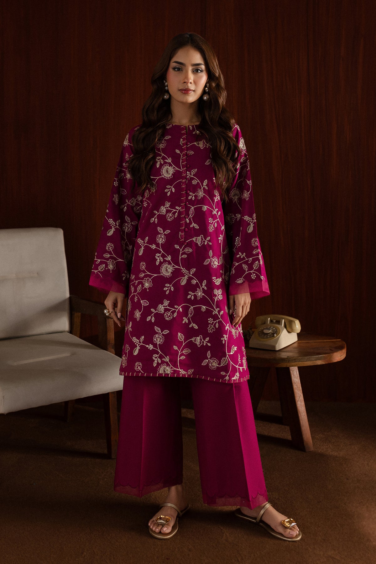 The loose flared culottes, also crafted from pink khaddar, are designed for a relaxed fit. Their flowy silhouette and subtle detailing make them an ideal pairing for the intricate shirt, balancing comfort and grace.