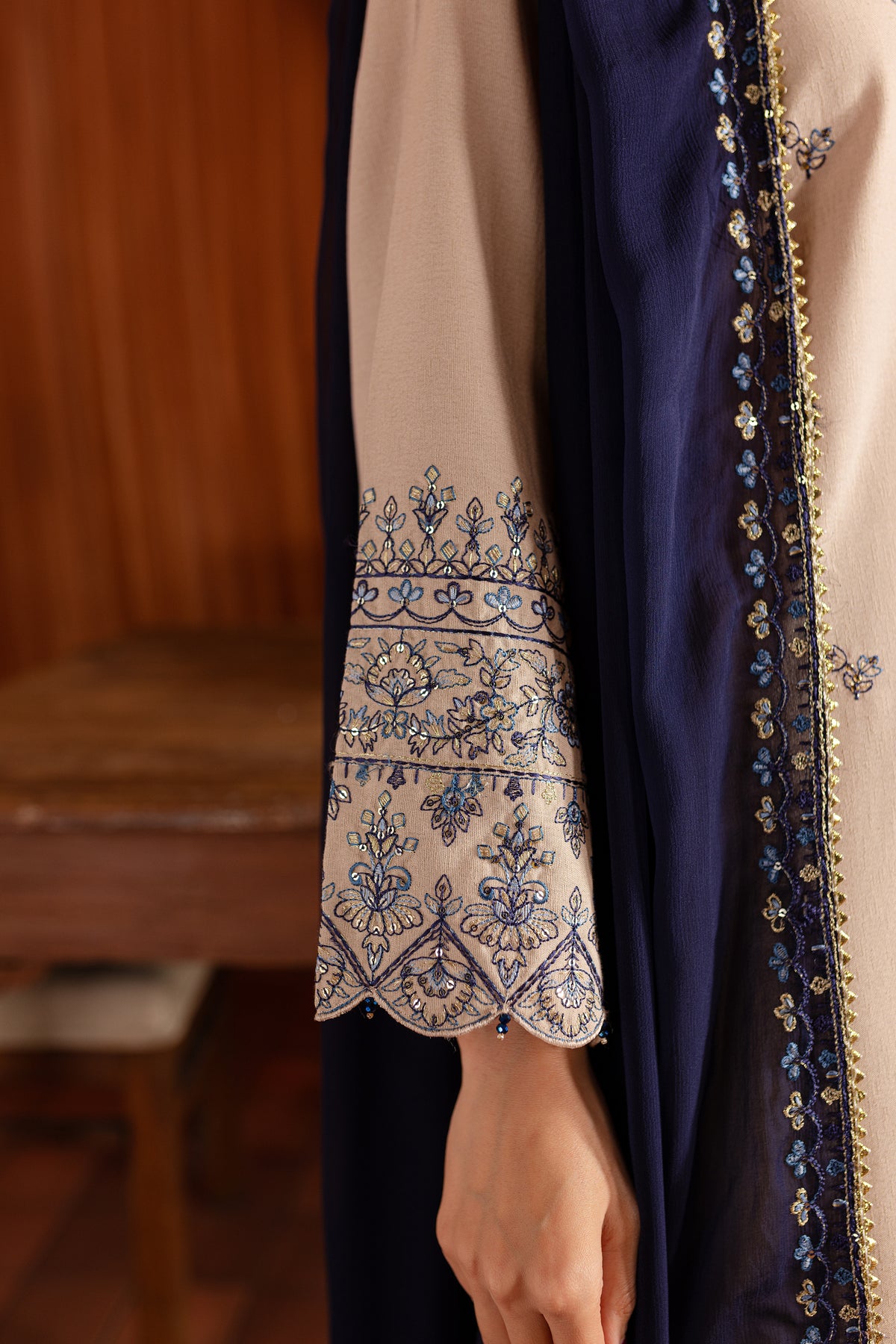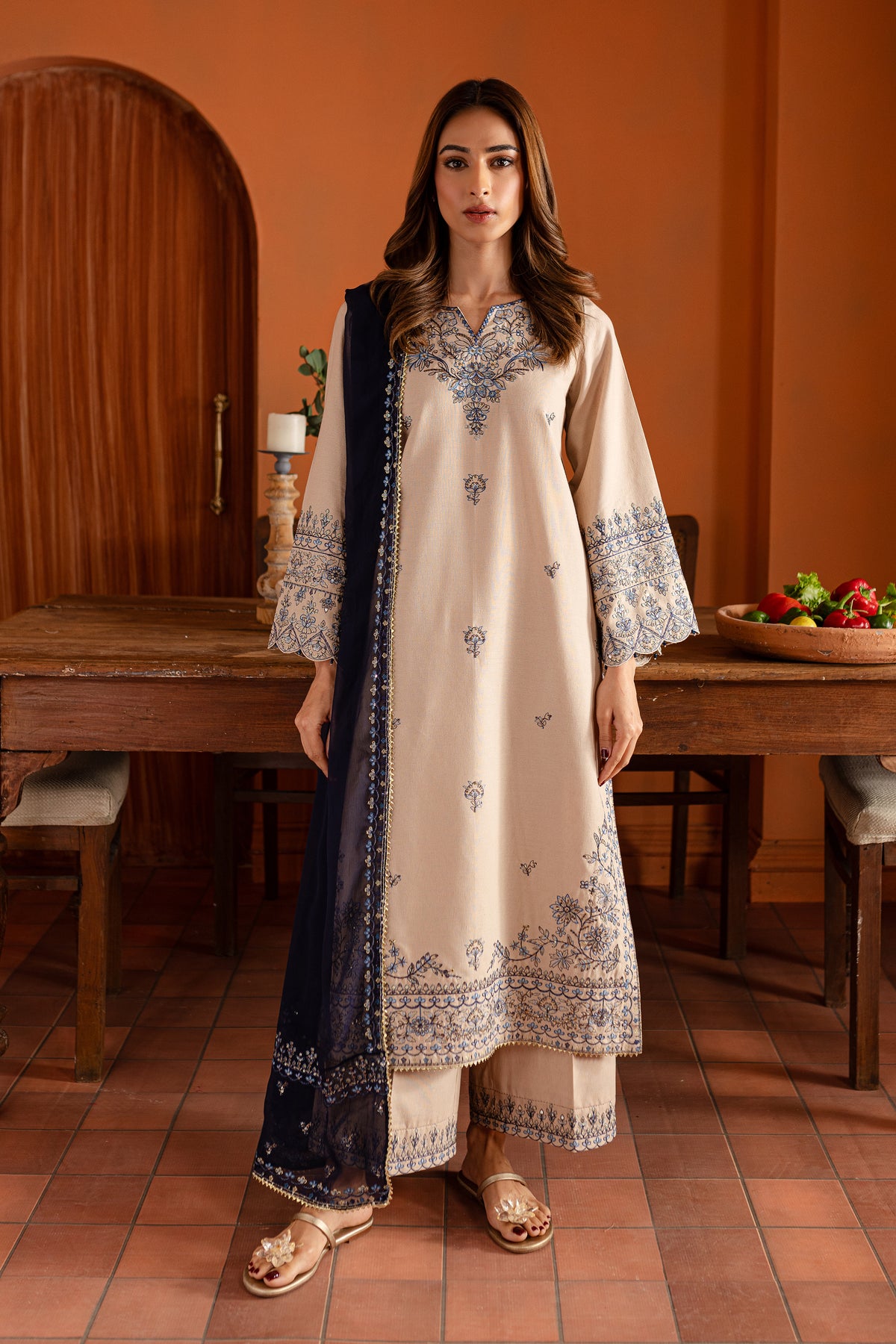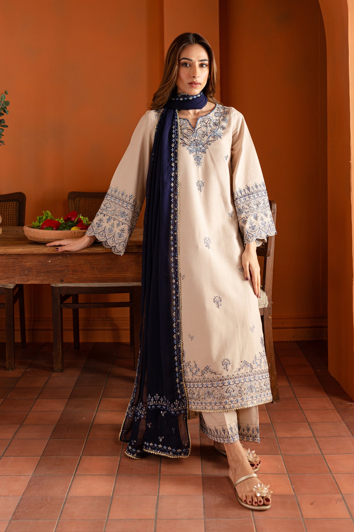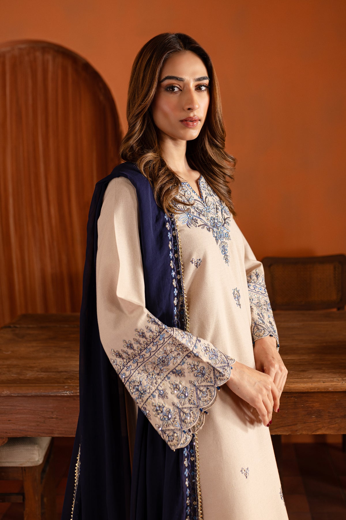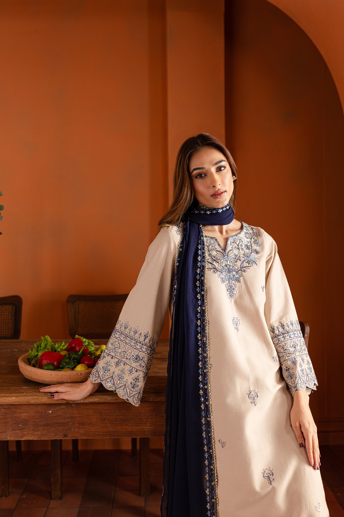 The shirt in off-white karandi is adorned with heavy embroidery on the chaak, neckline and hem. Borders on the hem and sleeves feature intricate detailing showcasing a mix of traditional patterns and modern refinement. The shirt’s composed embroidery highlights its luxurious appeal.
