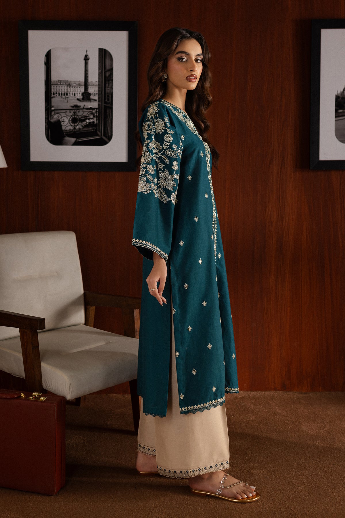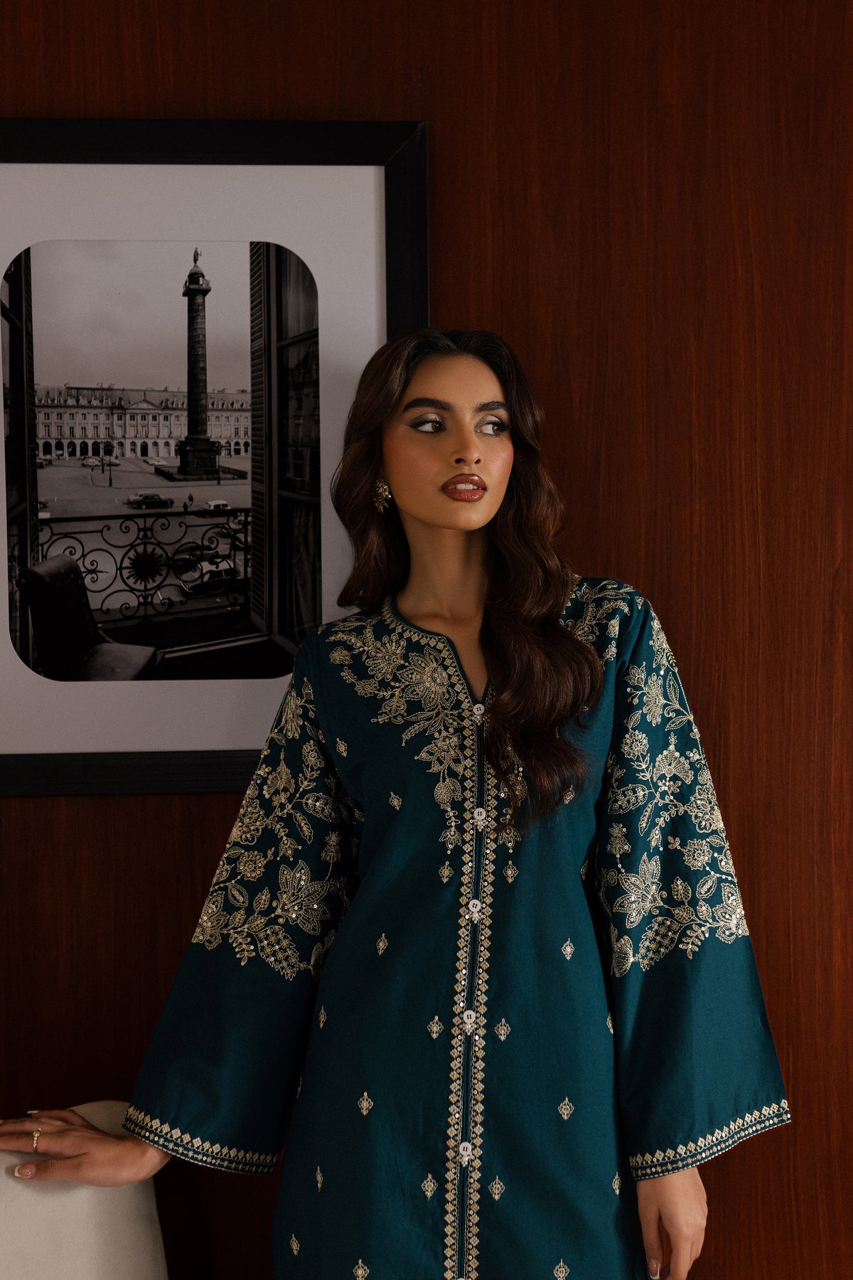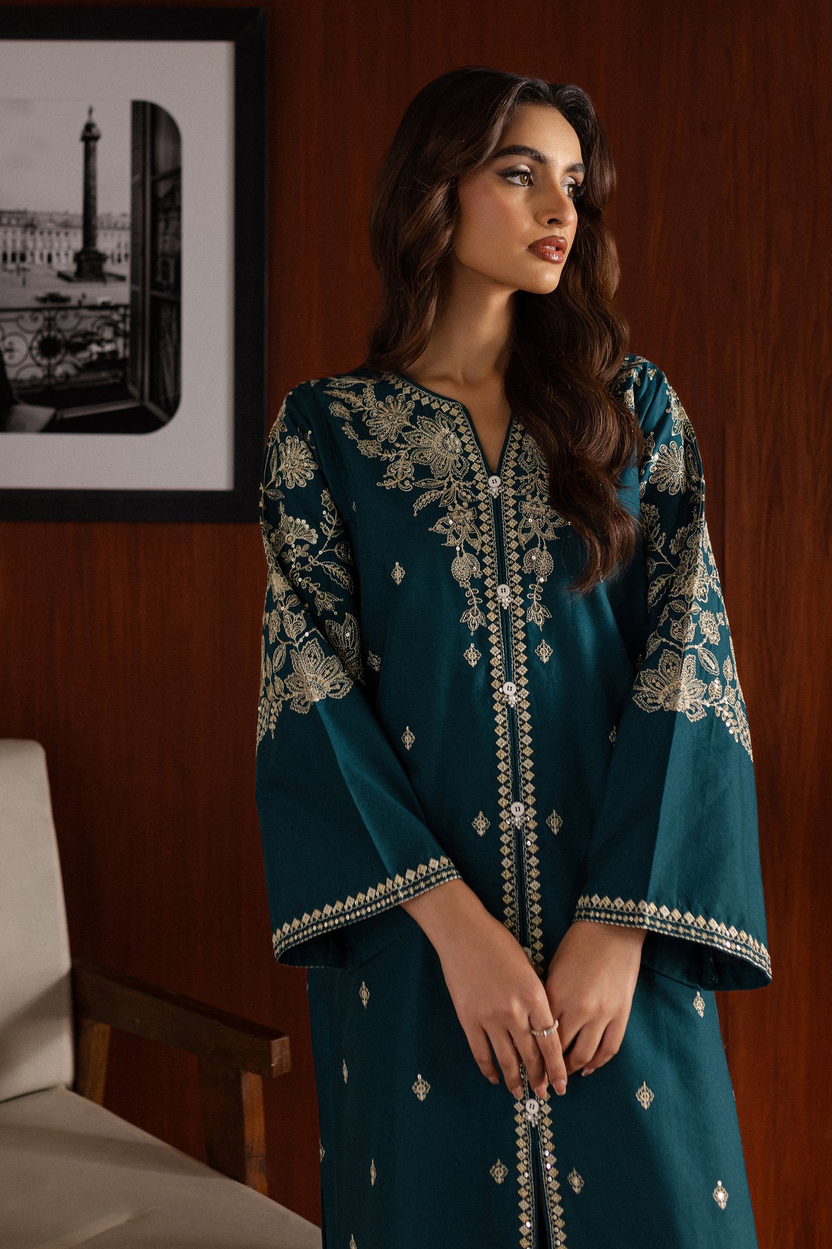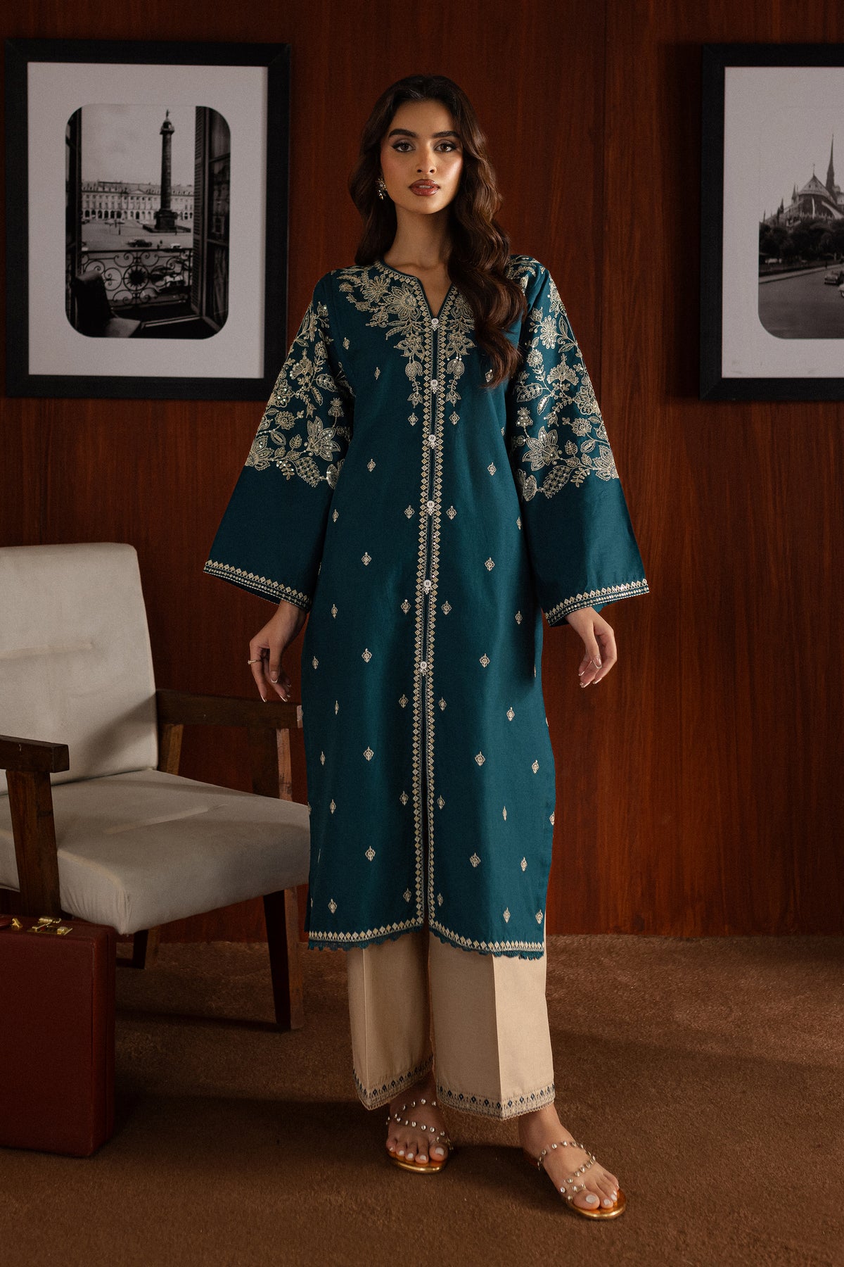 The contrast trousers feature embroidered borders at the hem, pairing beautifully with the intricate details of the shirt.