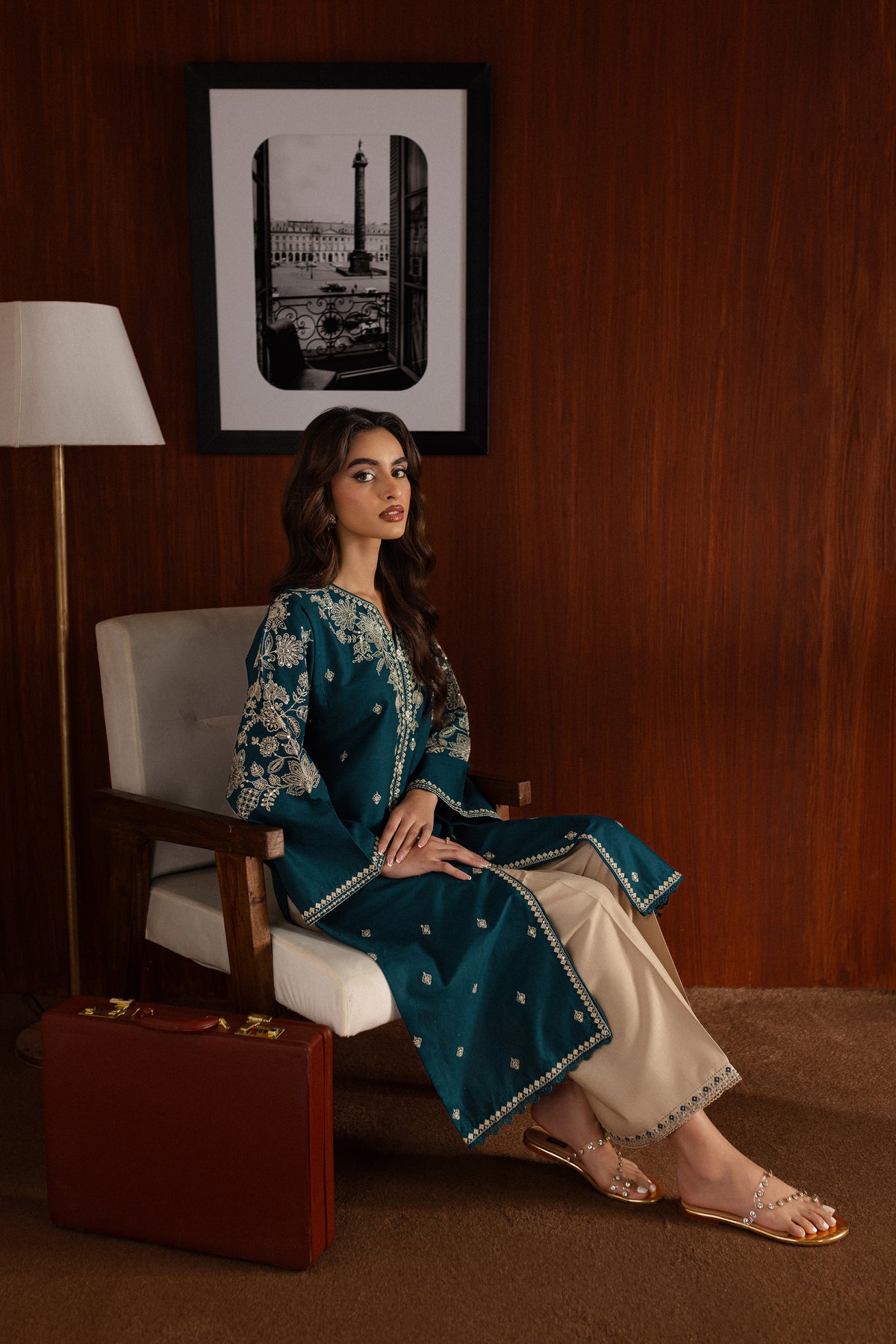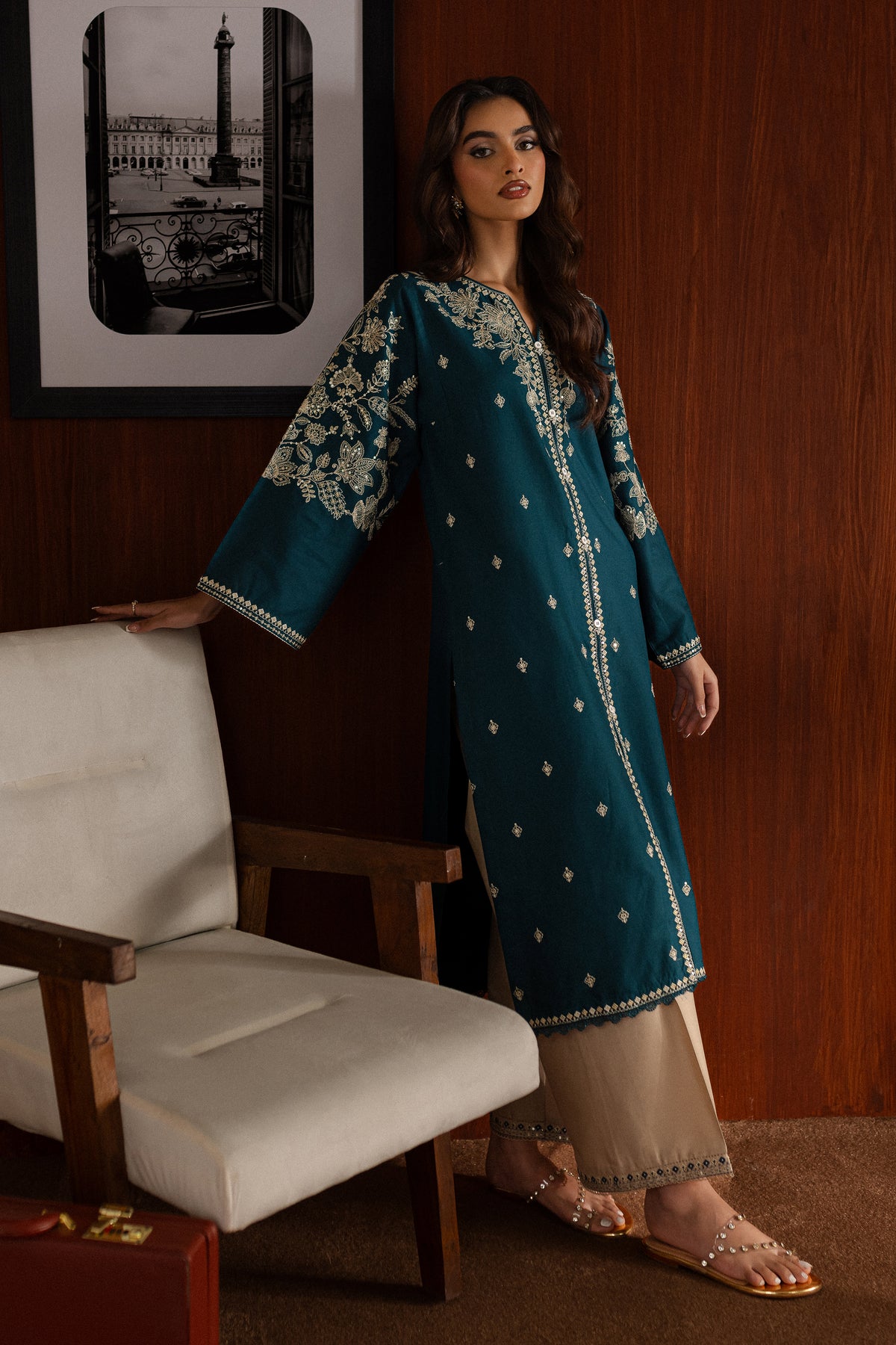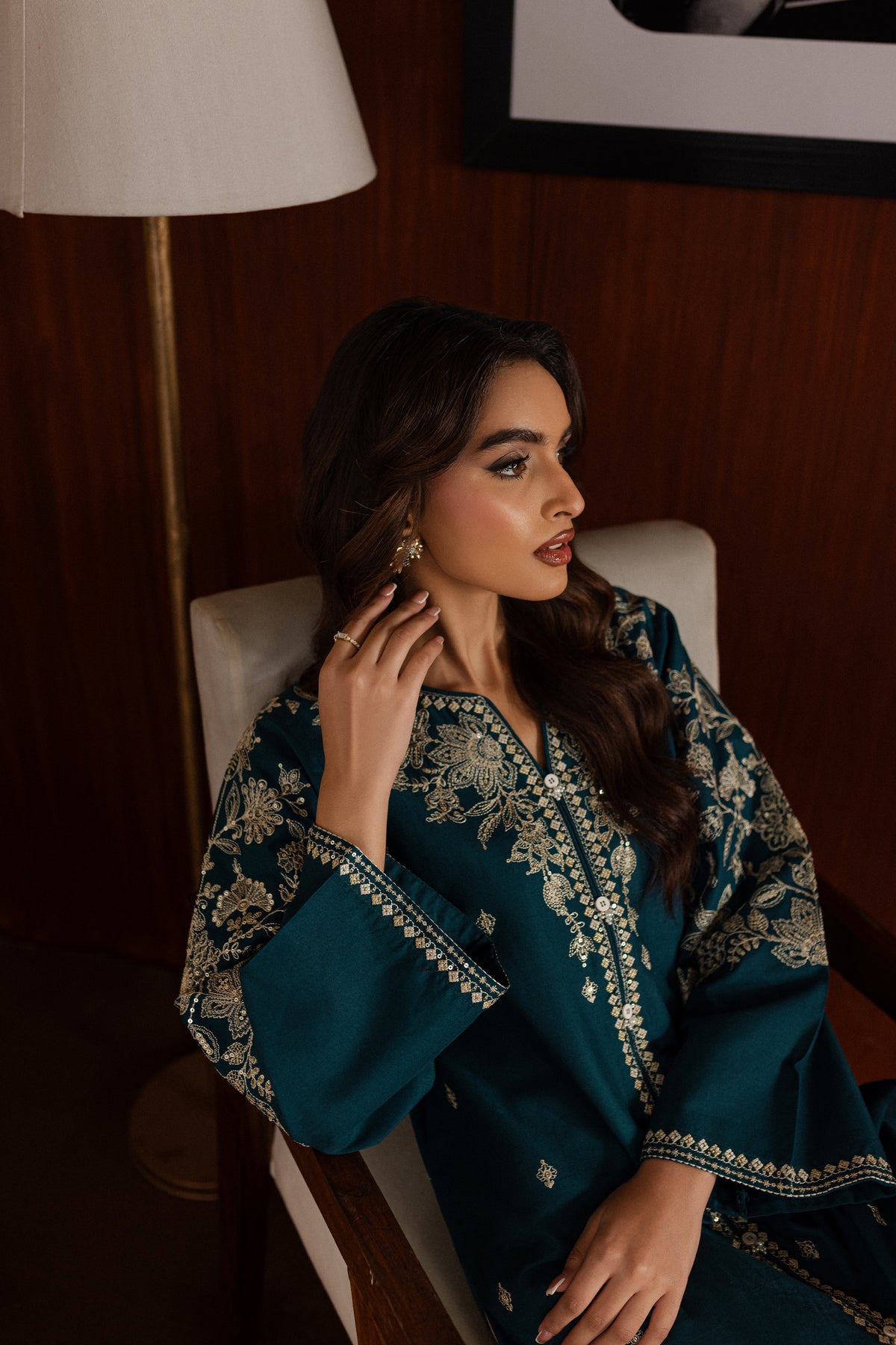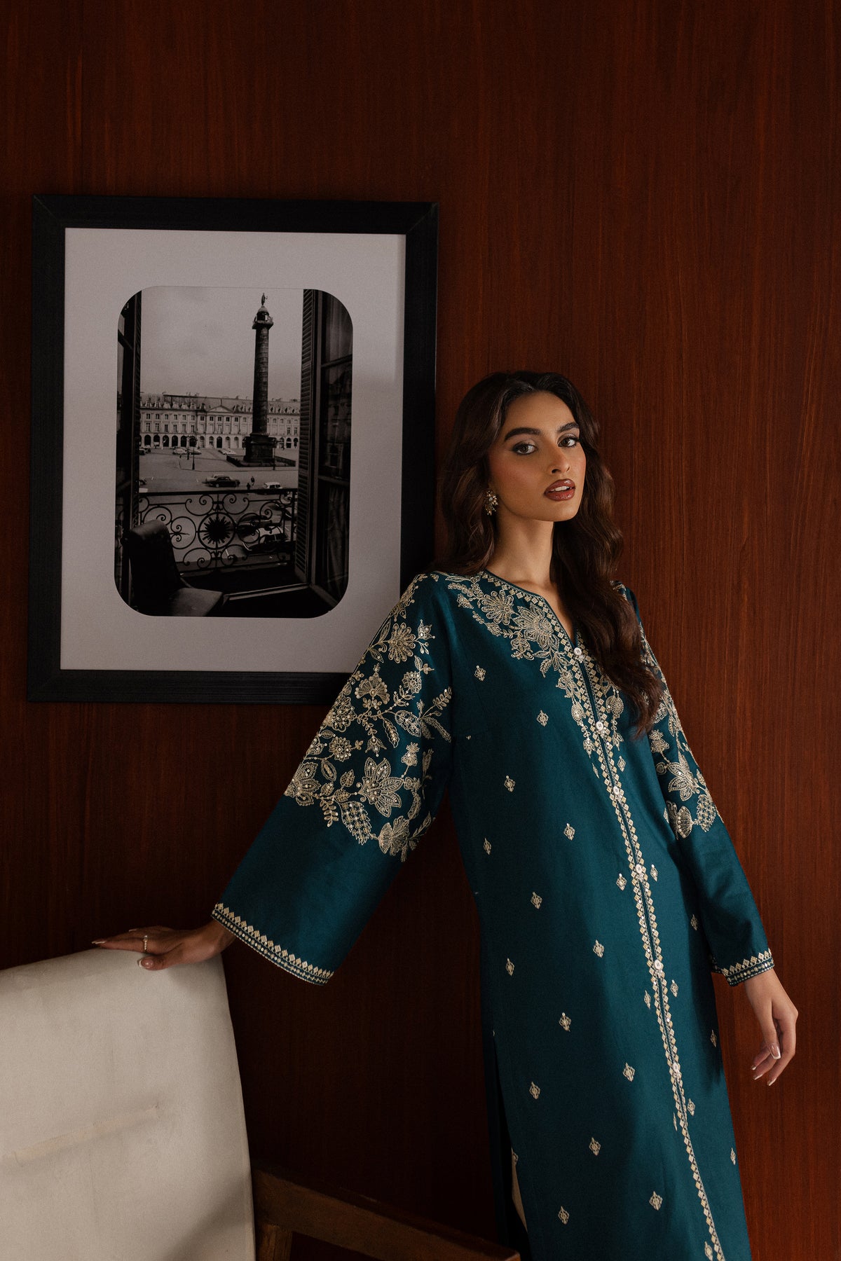 The contrast trousers feature embroidered borders at the hem, pairing beautifully with the intricate details of the shirt.