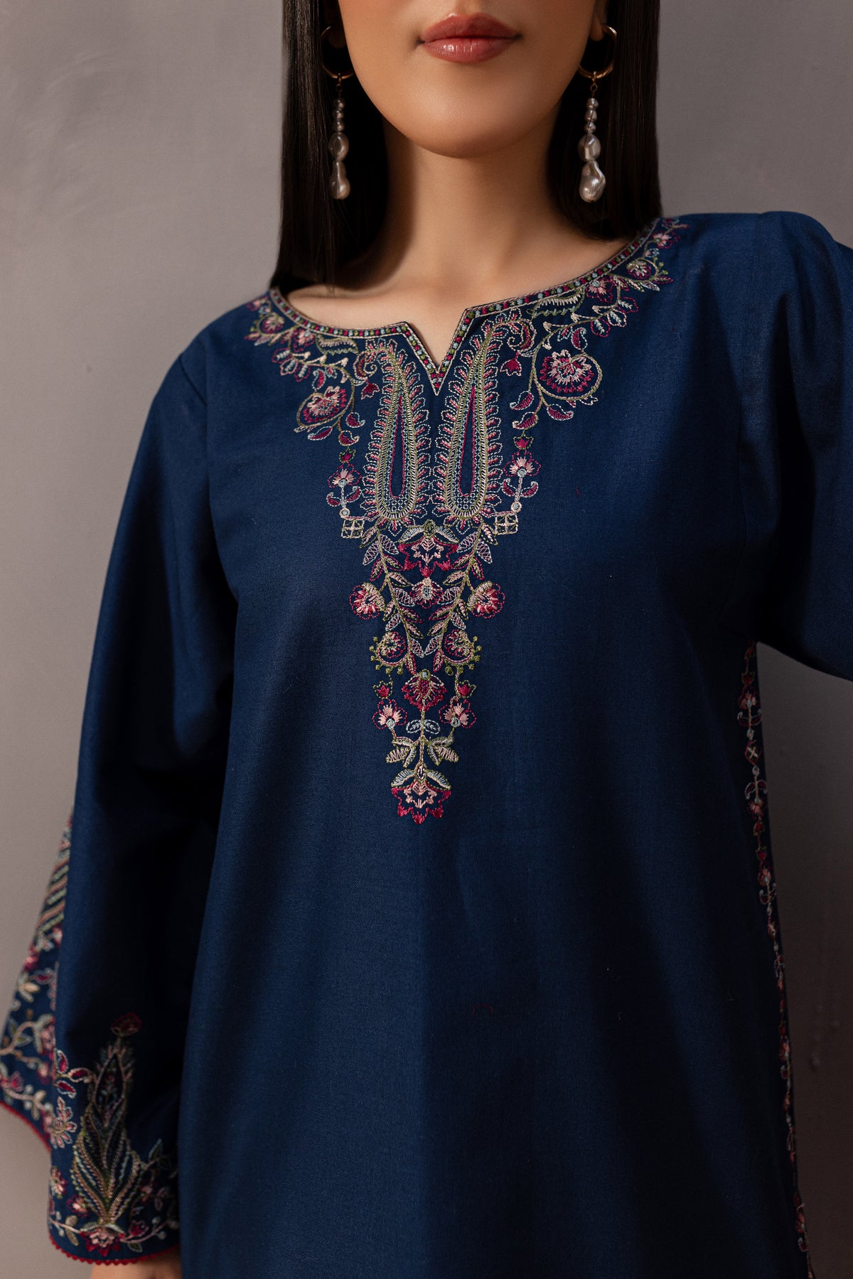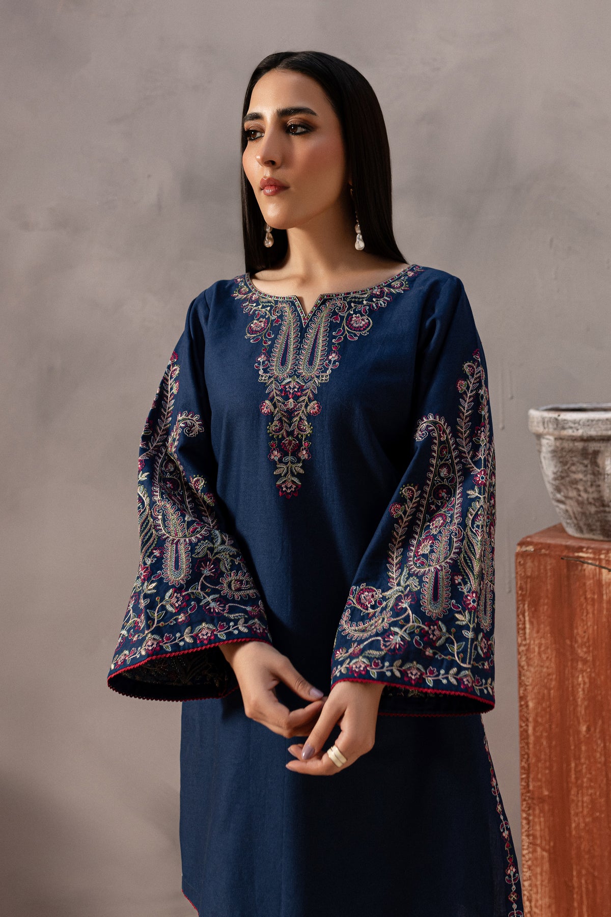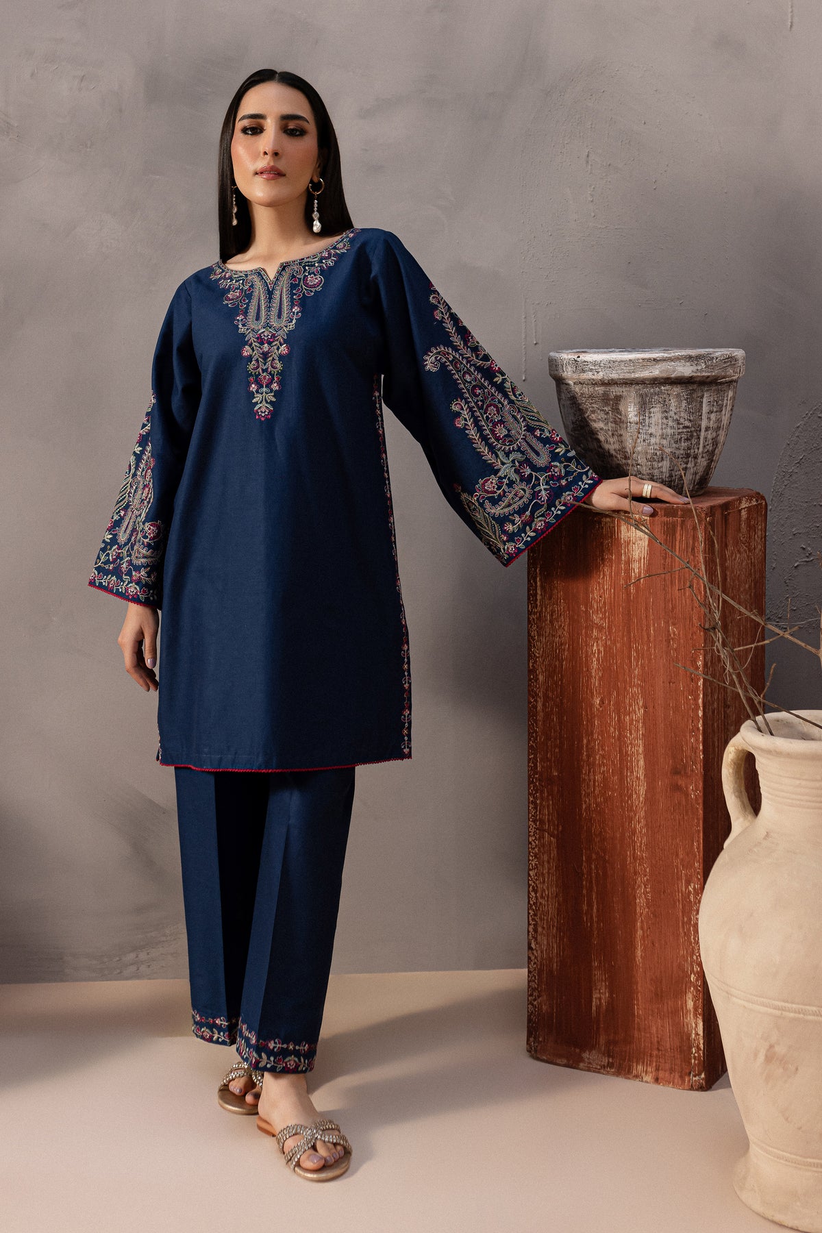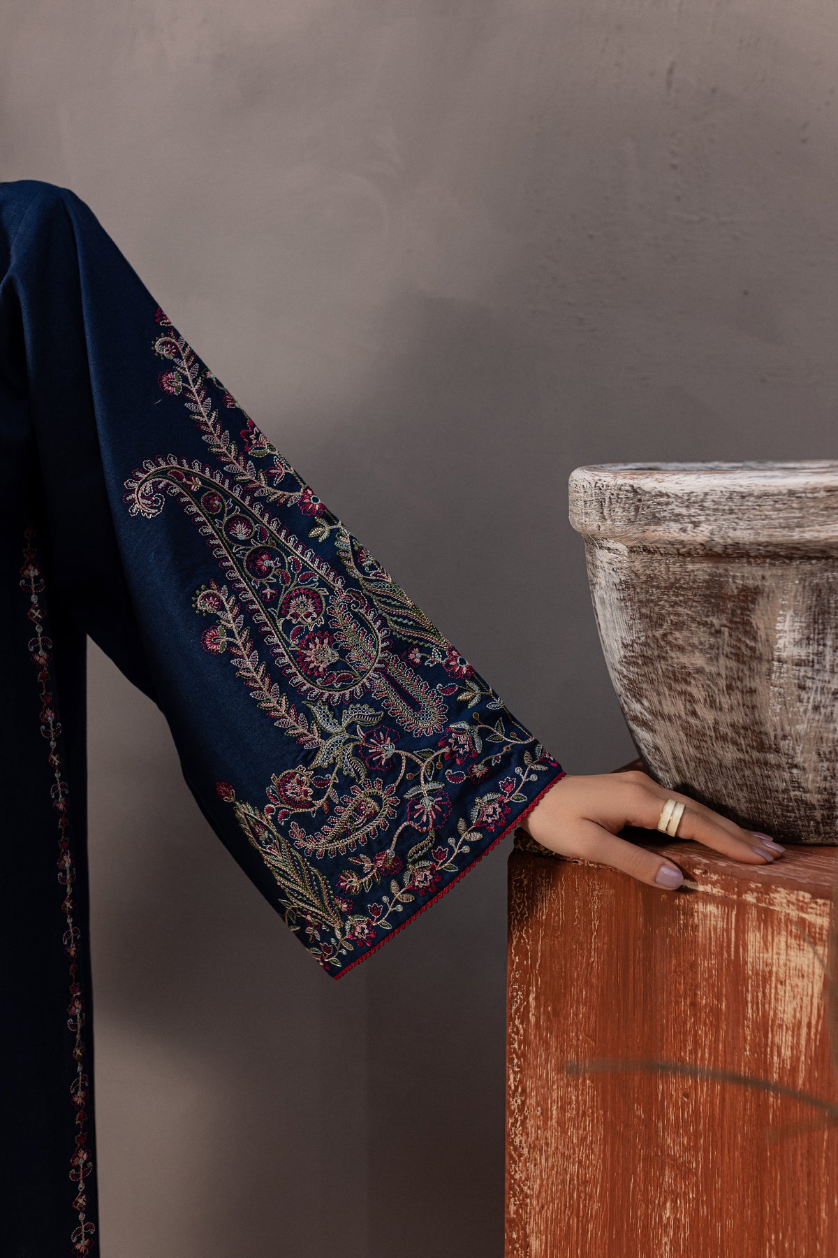 This elegant 2-piece blue khaddar shirt features fully embroidered sleeves, exuding intricate detailing and charm. The shirt is designed with a minimalistic, yet sophisticated neckline, perfectly complemented by embroidered chaaks at the shirt for added depth and texture.