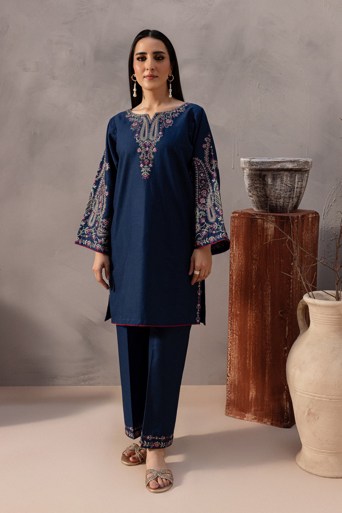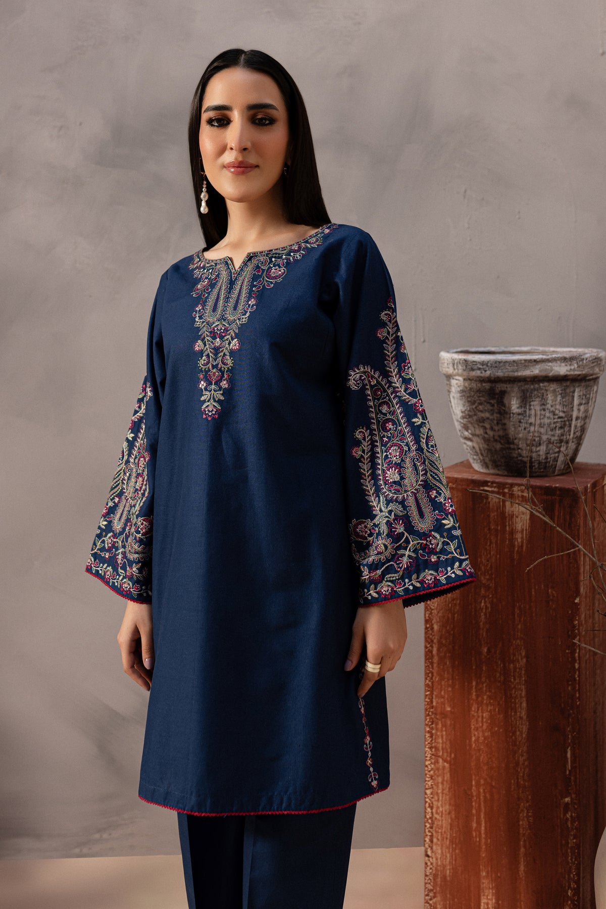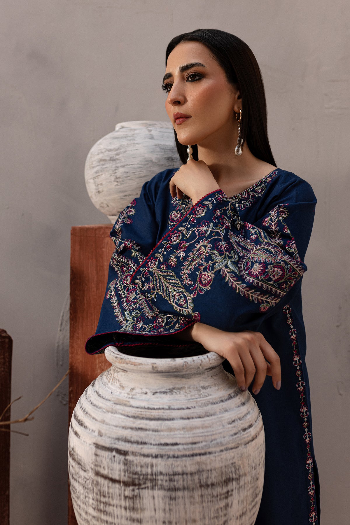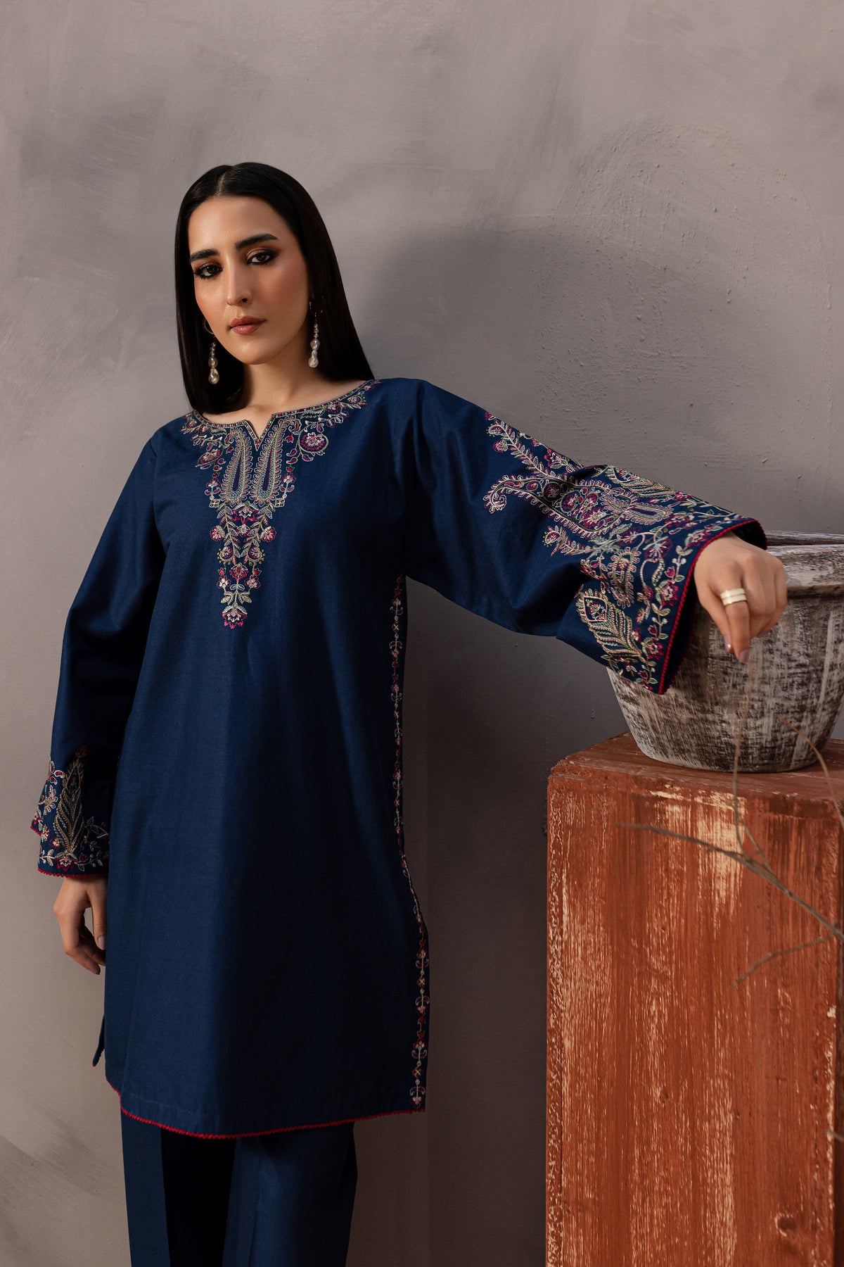 This elegant 2-piece blue khaddar shirt features fully embroidered sleeves, exuding intricate detailing and charm. The shirt is designed with a minimalistic, yet sophisticated neckline, perfectly complemented by embroidered chaaks at the shirt for added depth and texture.