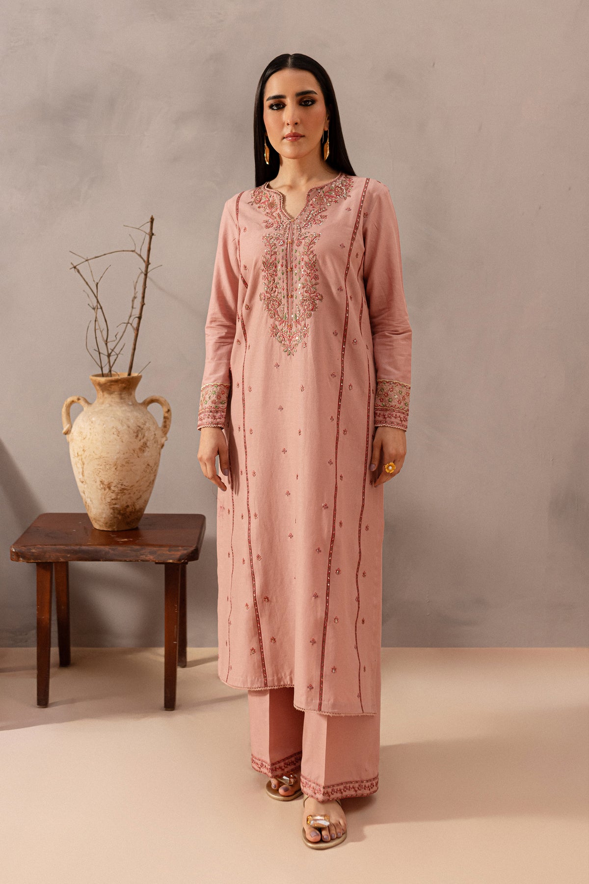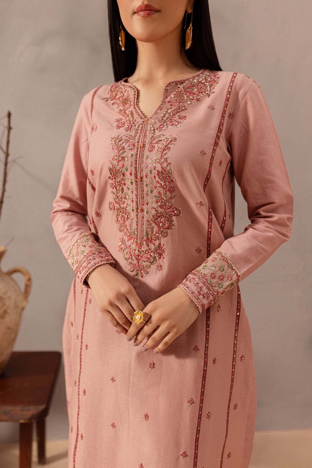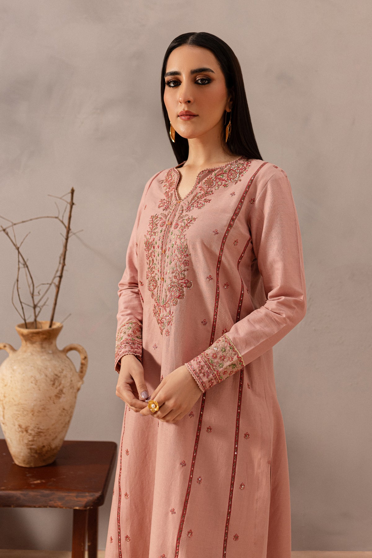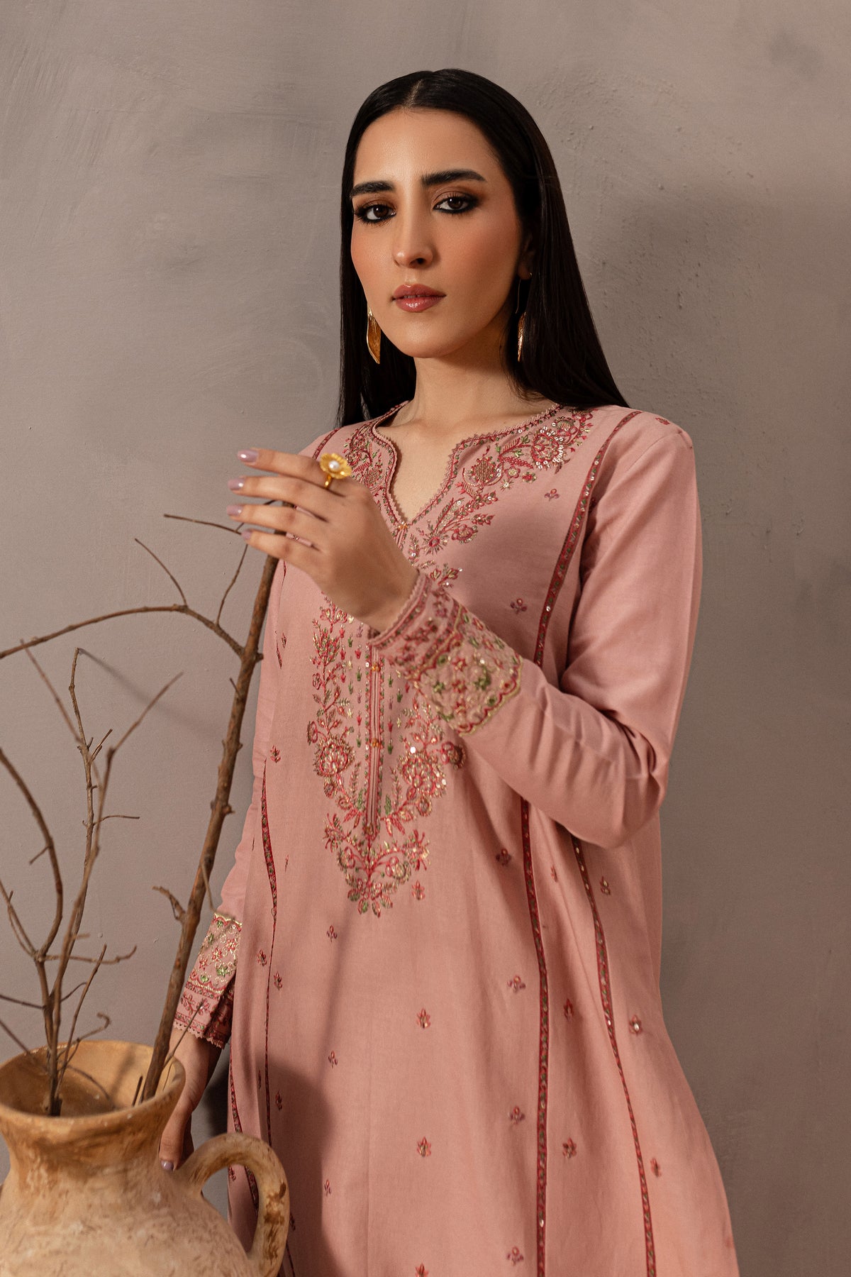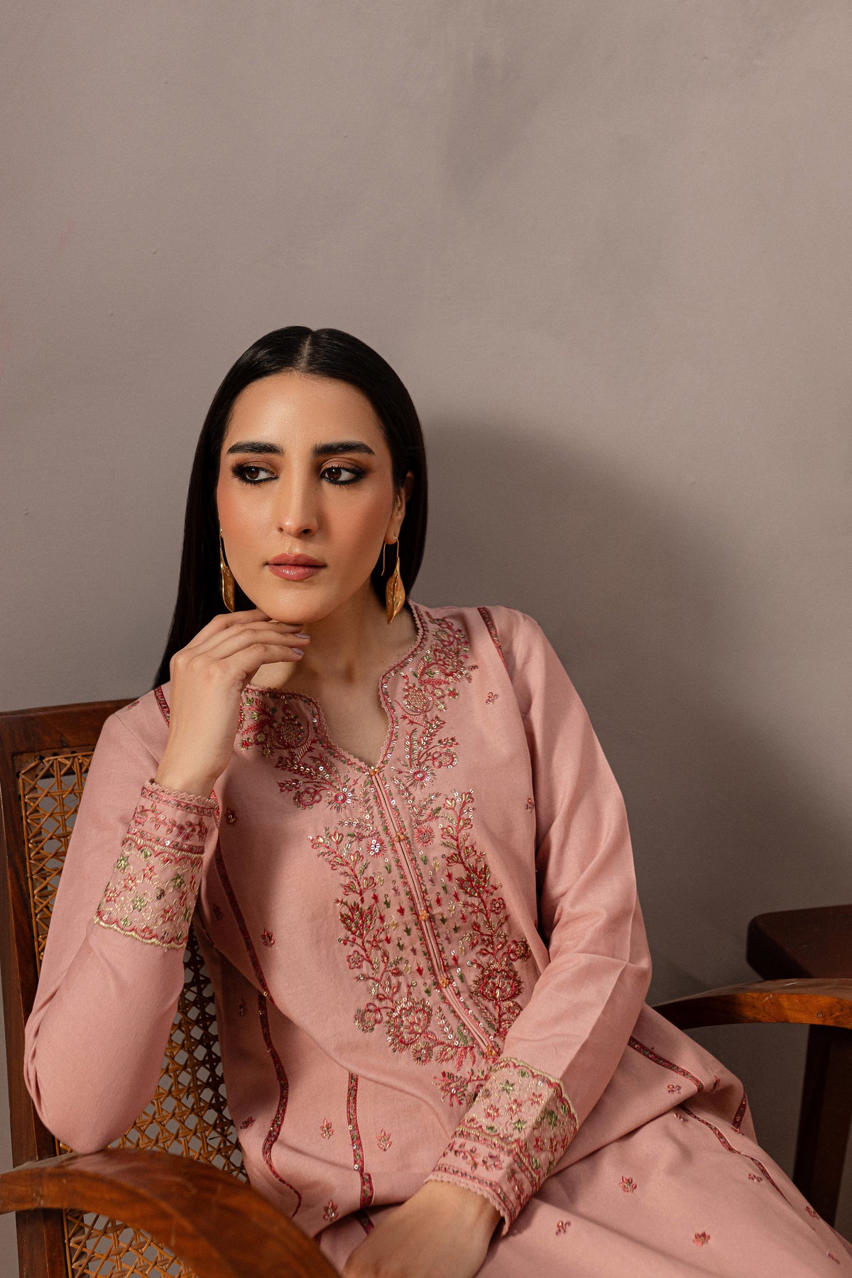 This elegant 2-piece taffy pink khaddar dress features a five-panelled long shirt that showcases a composed embroidered neckline for a refined and graceful look. The panels are separated by intricate embroidered patti, adding a layer of delicate detailing. The shirt is beautifully adorned with all-over embroidery spread. The sleeves are designed with embroidered borders, bringing a cohesive and striking finish to the ensemble.