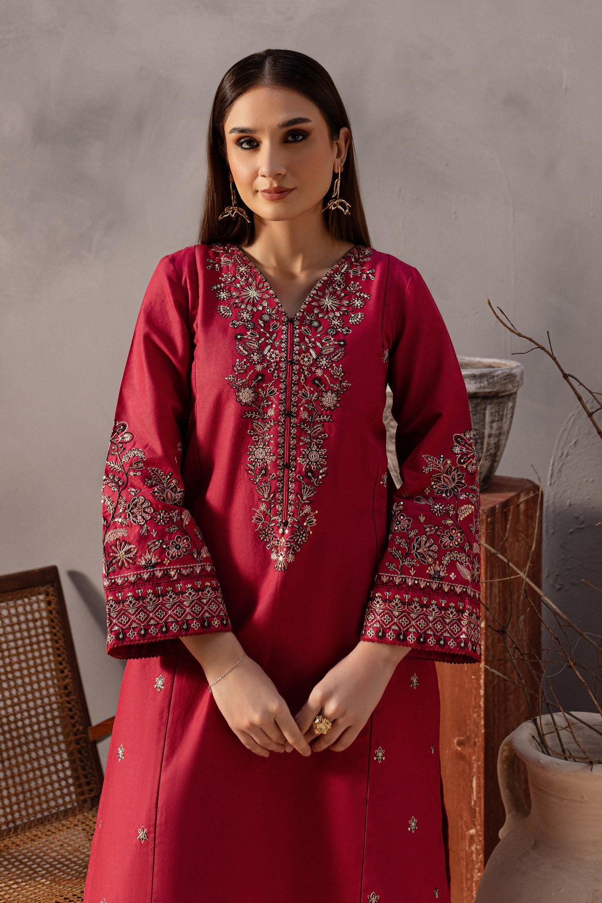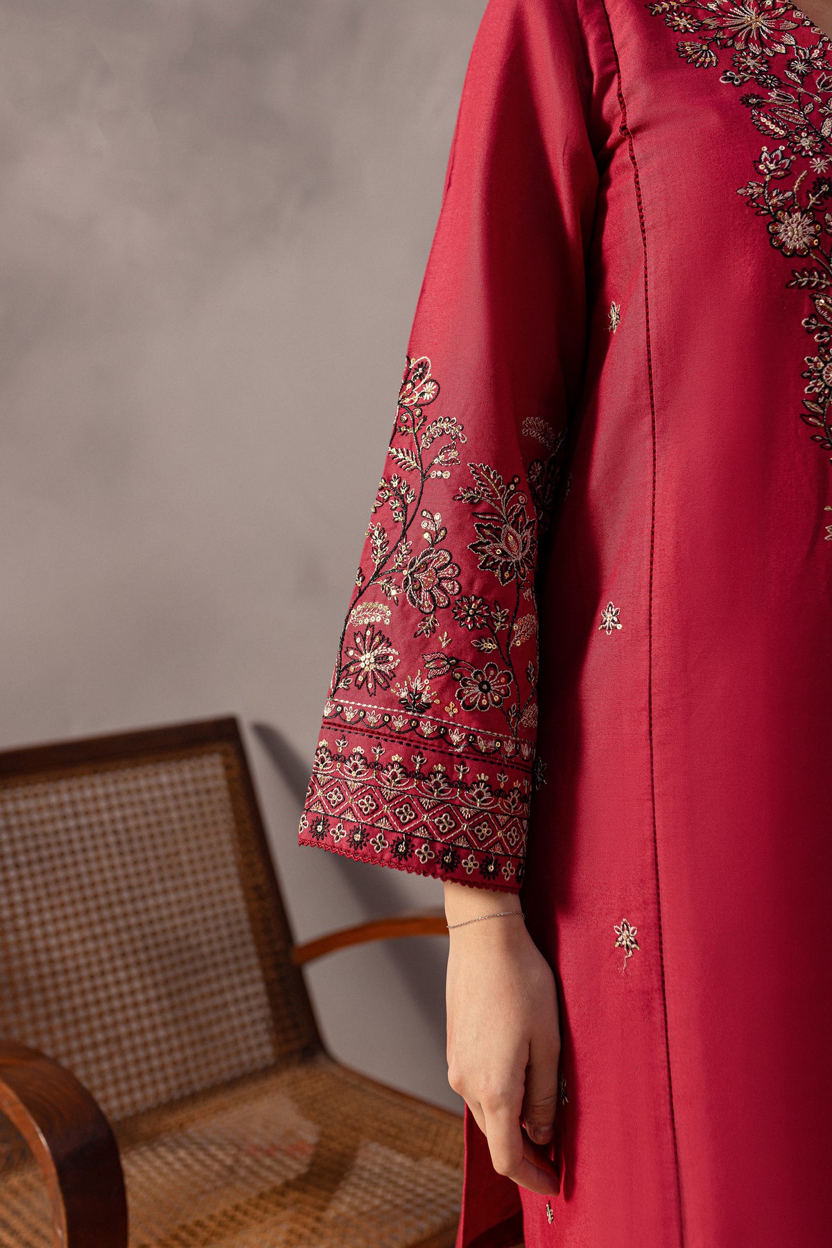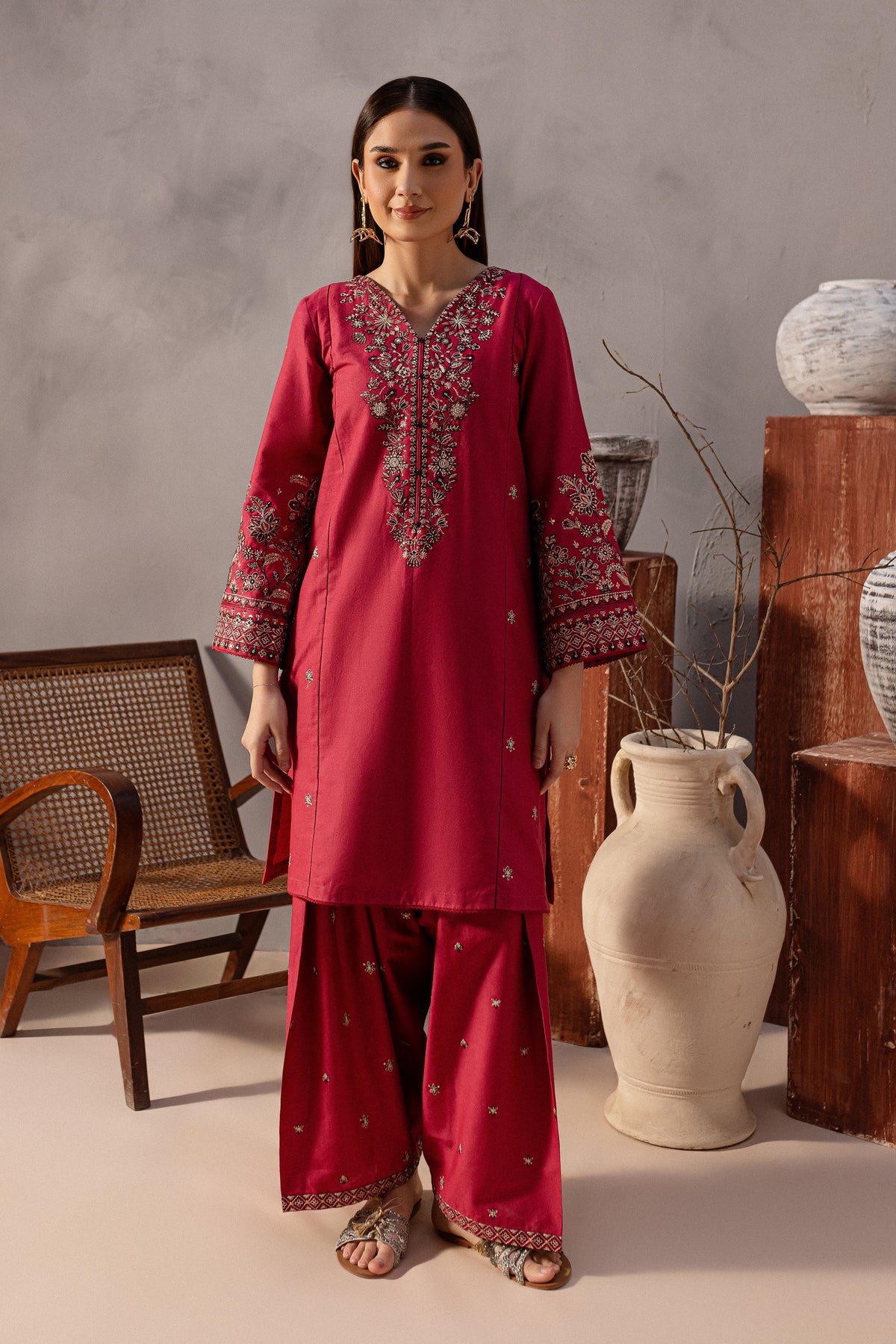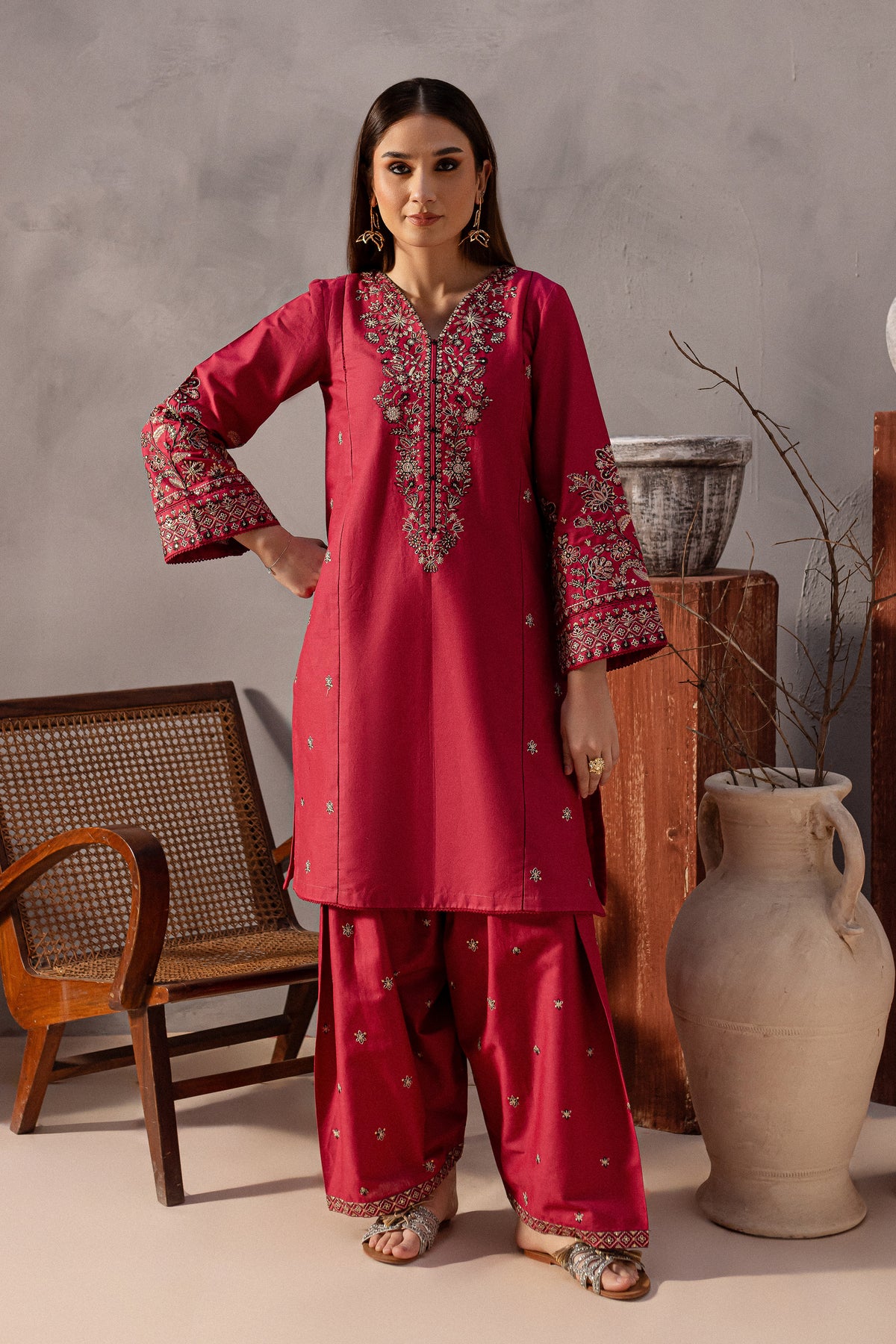 This elegant khaddar 2-piece set in pink features a short shirt with distinct panels and a composed heavy neckline, adorned with button embellishments that add a sophisticated touch. The side panels are beautifully embroidered with intricate spread detailing, enhancing the shirt’s timeless charm.The loose-fit embroidered sleeves are finished with delicate borders, attached with seeri lace for an added touch of elegance.