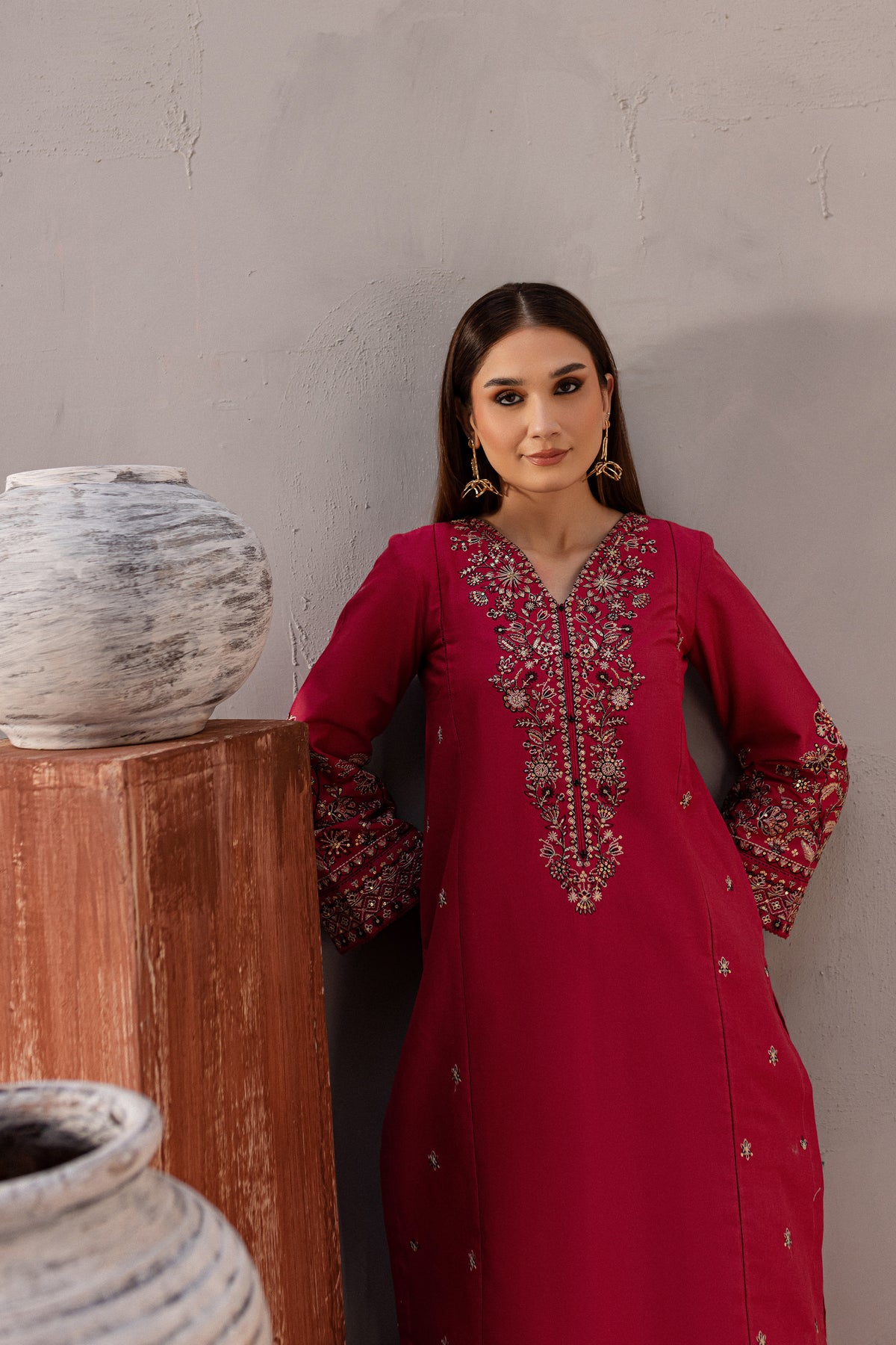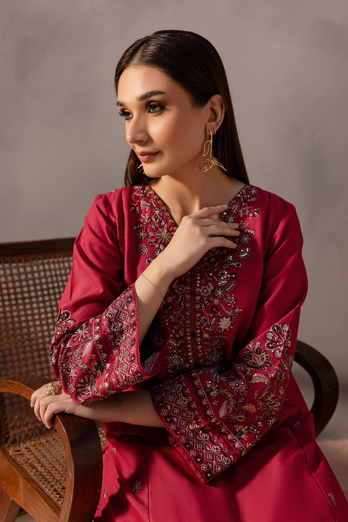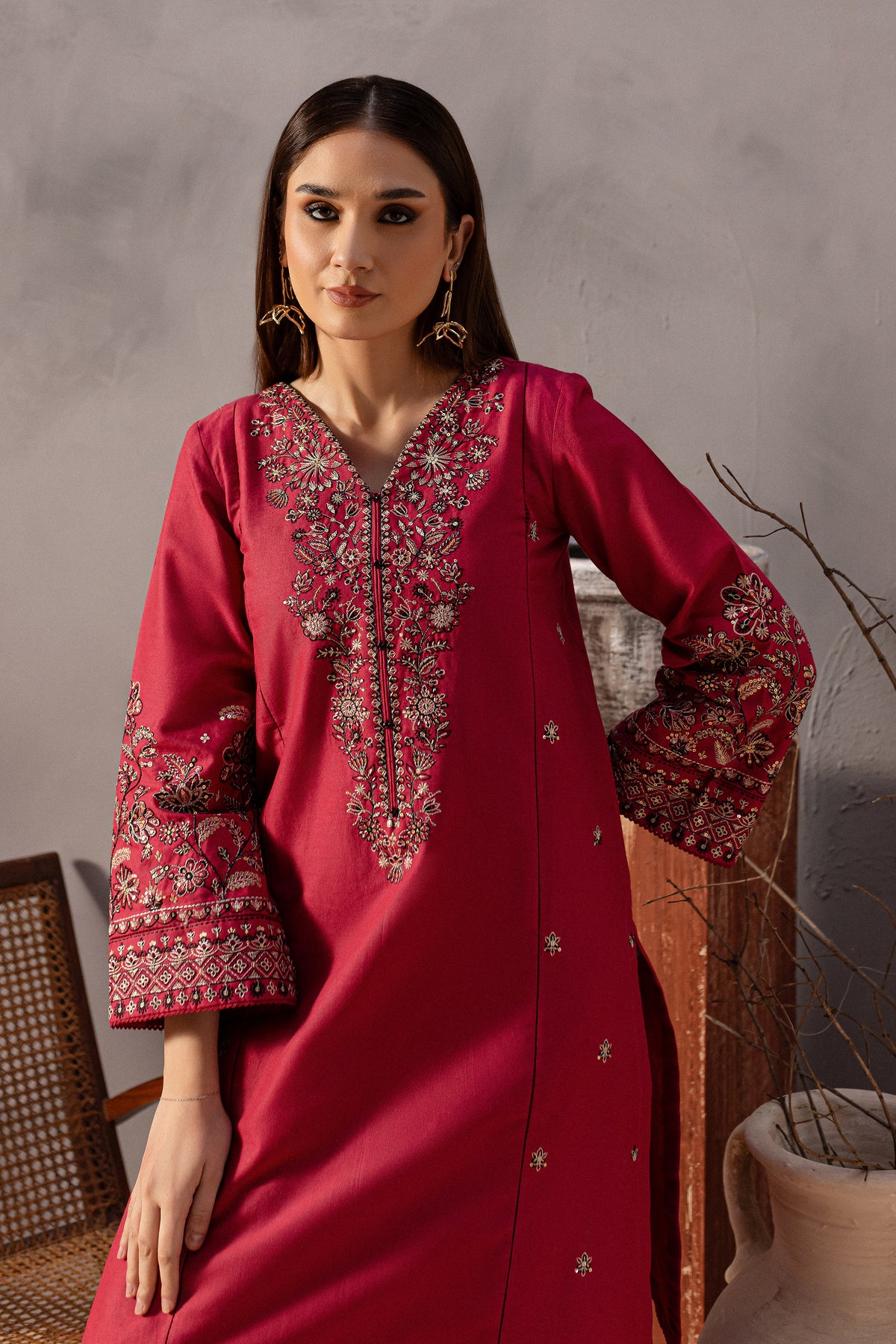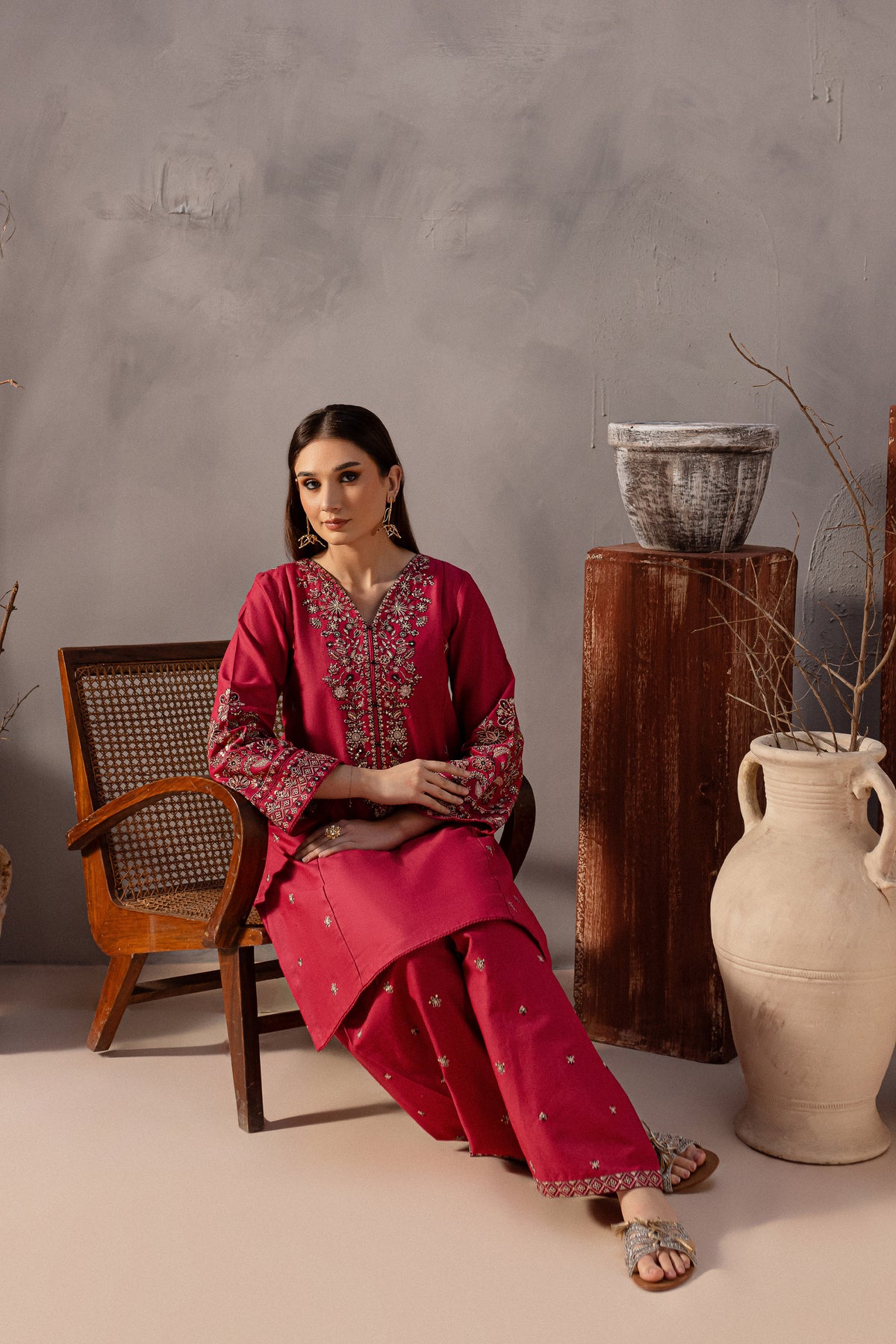 This elegant khaddar 2-piece set in pink features a short shirt with distinct panels and a composed heavy neckline, adorned with button embellishments that add a sophisticated touch. The side panels are beautifully embroidered with intricate spread detailing, enhancing the shirt’s timeless charm.The loose-fit embroidered sleeves are finished with delicate borders, attached with seeri lace for an added touch of elegance.