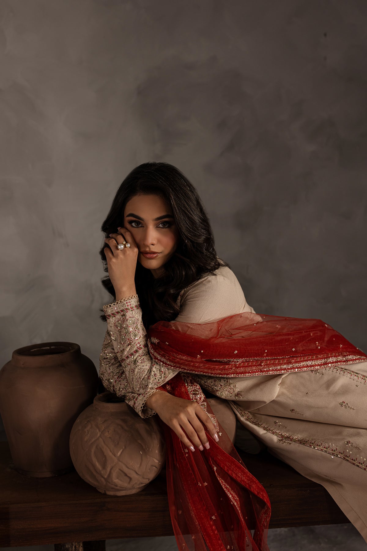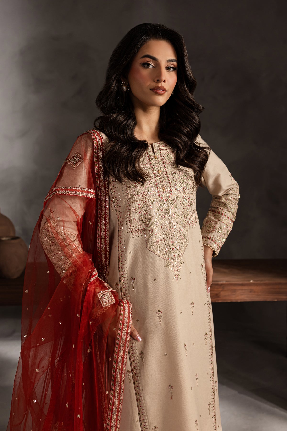 This long-panelled off-white Karandi shirt exudes sophistication with a heavily composed embroidery neckline, adding intricate detail and texture to the design. The shirt features a V-slit neckline, which enhances its modern, flattering silhouette. The fitted sleeves perfectly complement the structured design, showcasing fine craftsmanship and refined elegance.