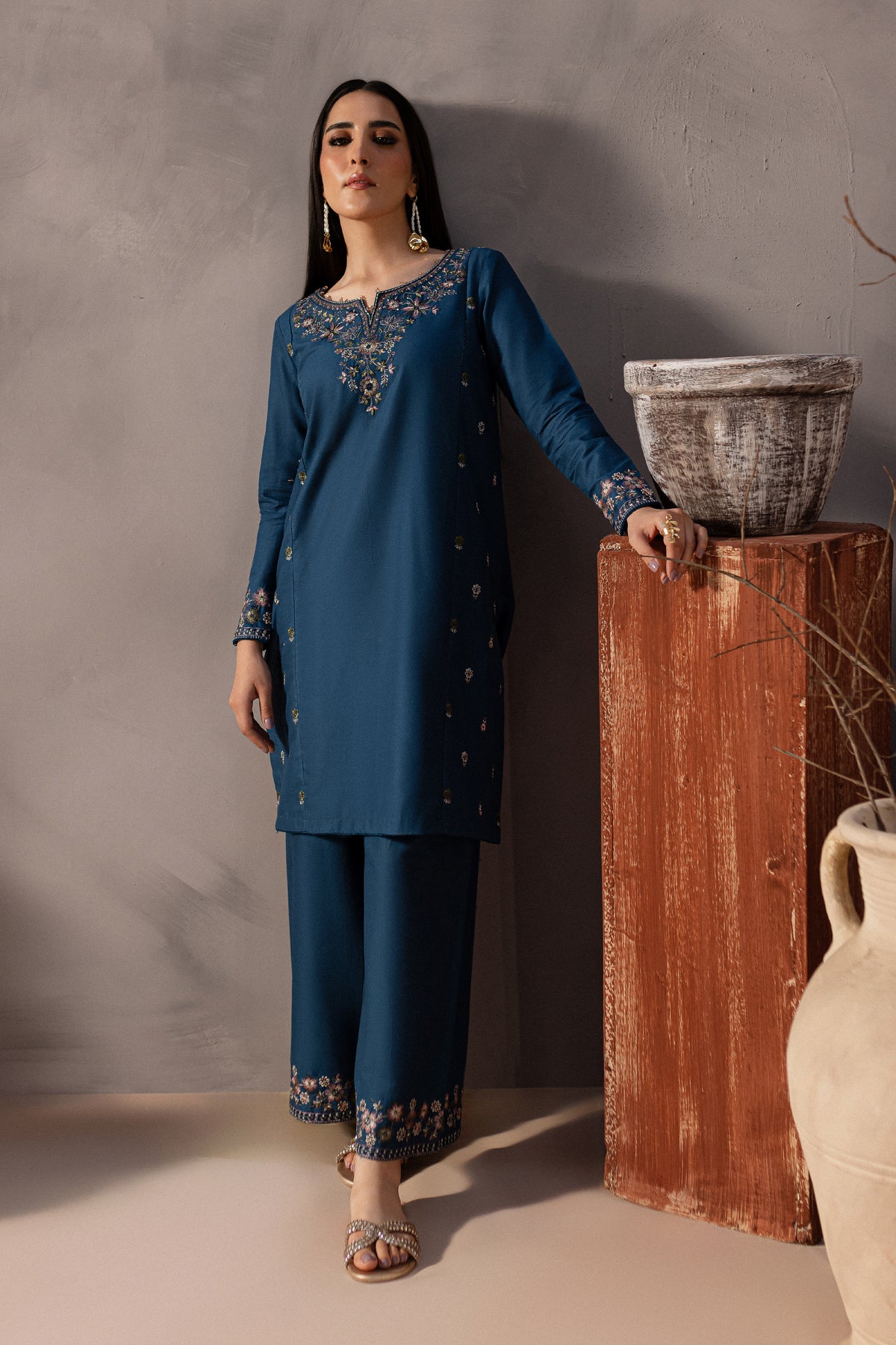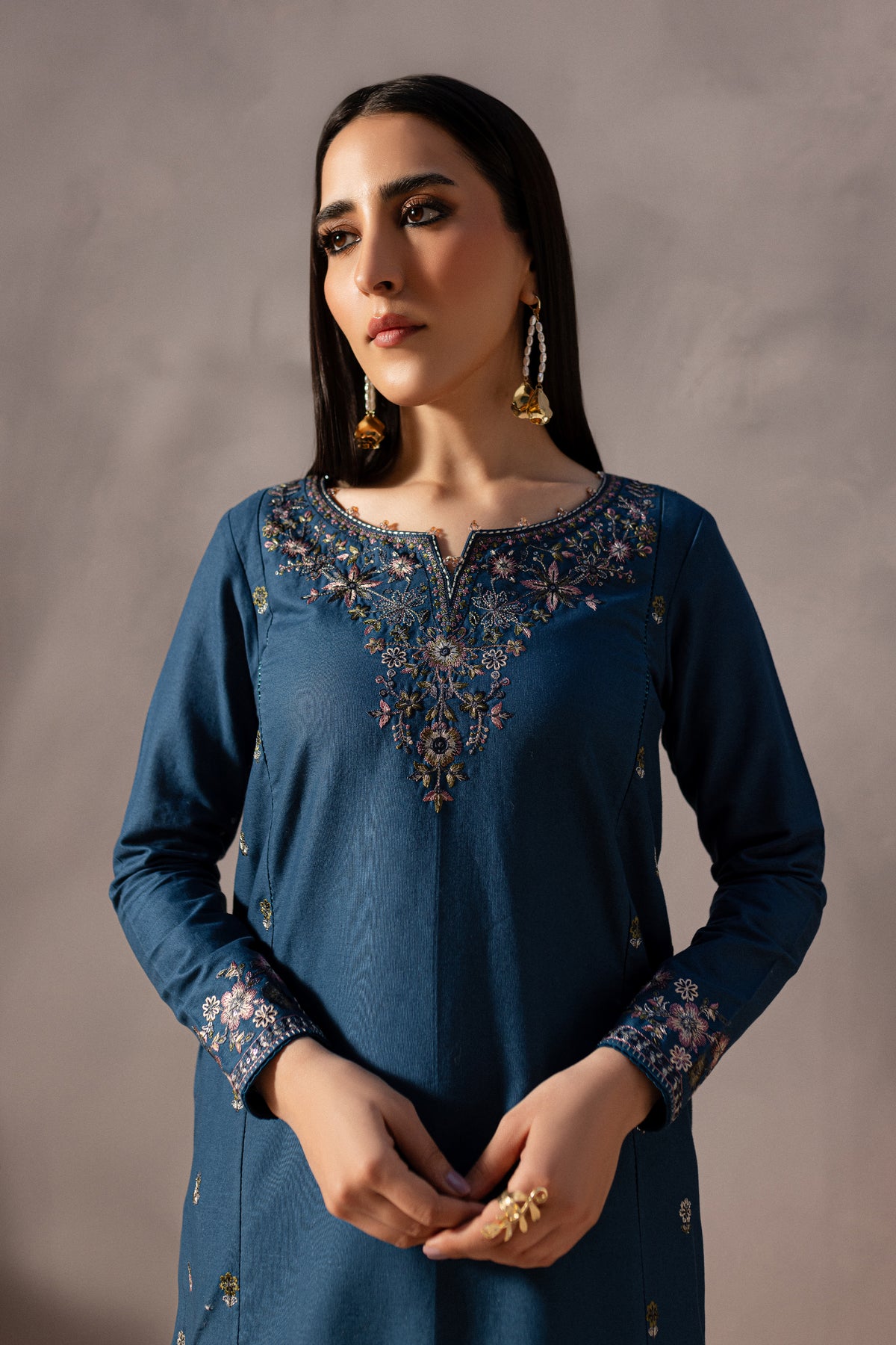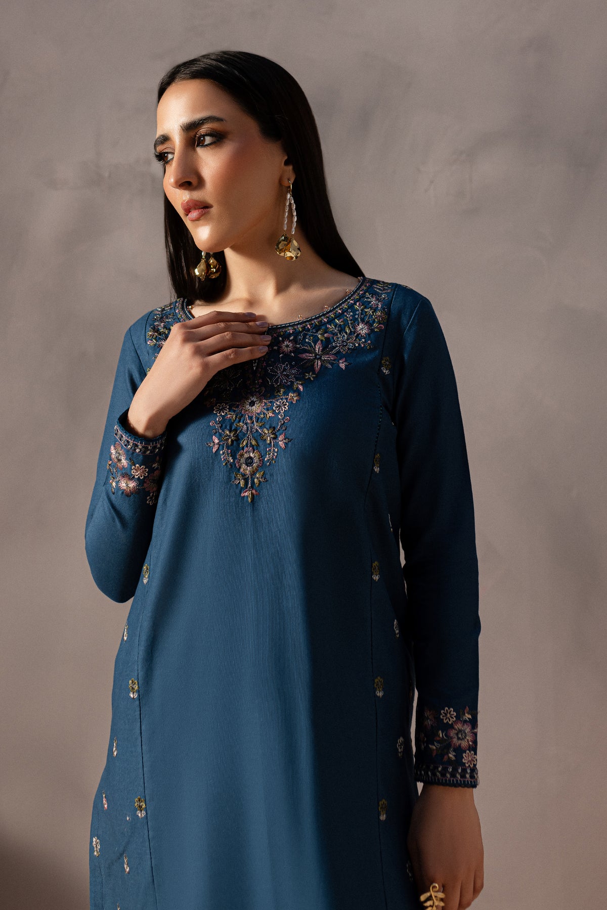 This stunning 2-piece ocean blue khaddar set features a paneled, embroidered shirt that showcases delicate embroidery at the neckline and side panels, adding intricate detail and charm. The fitted sleeves are elegantly finished with a minimal colored embroidered border, offering a refined touch to the overall design.