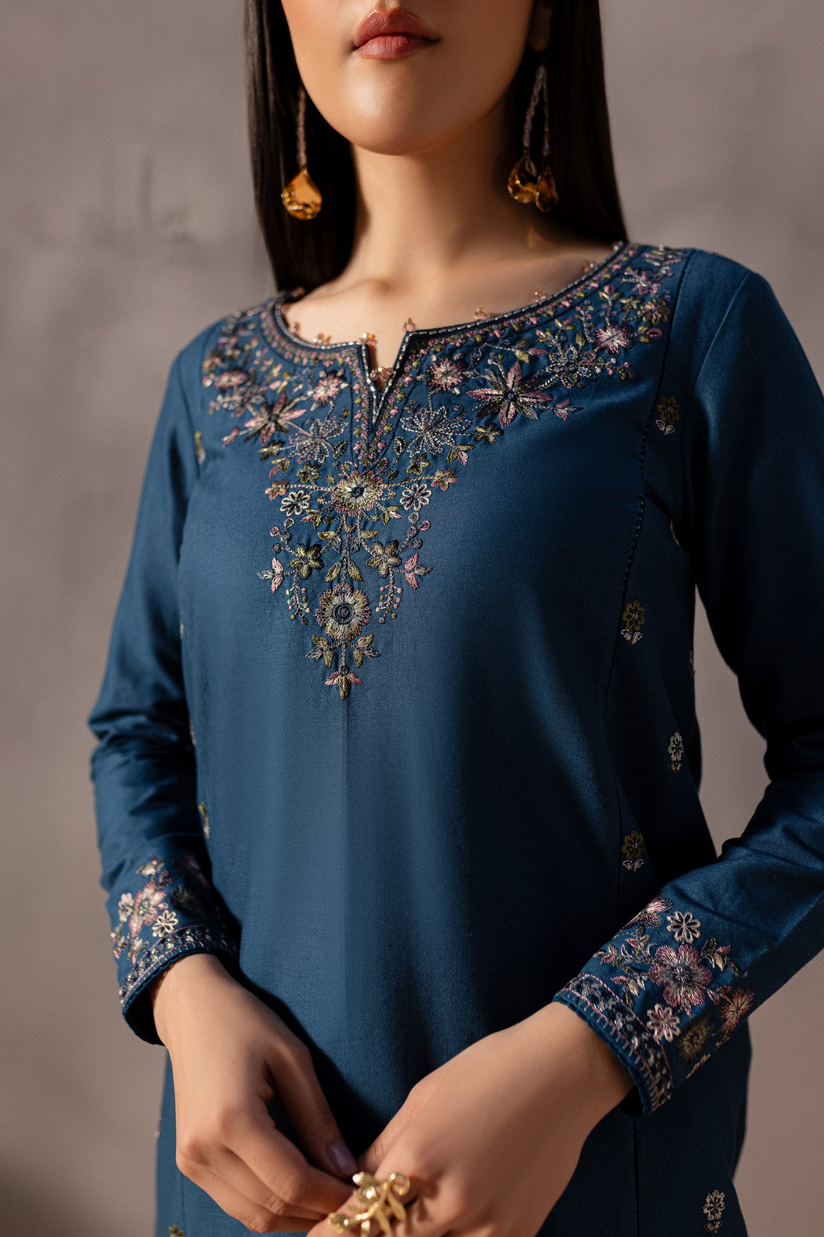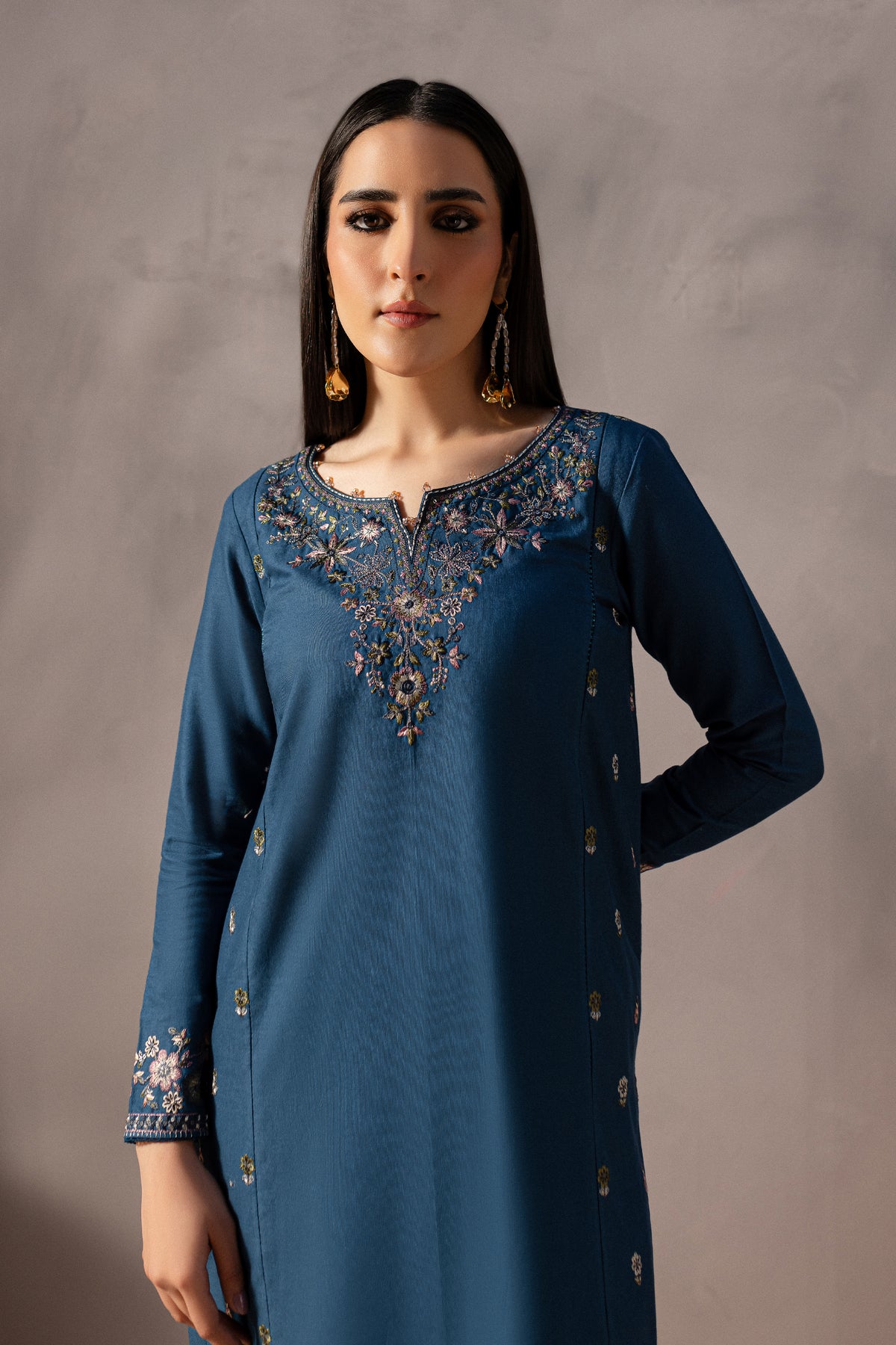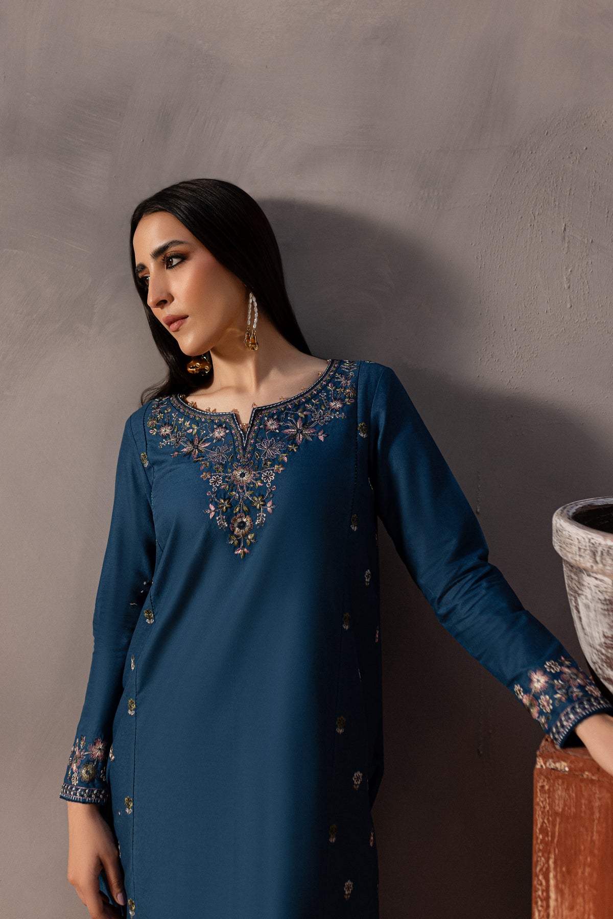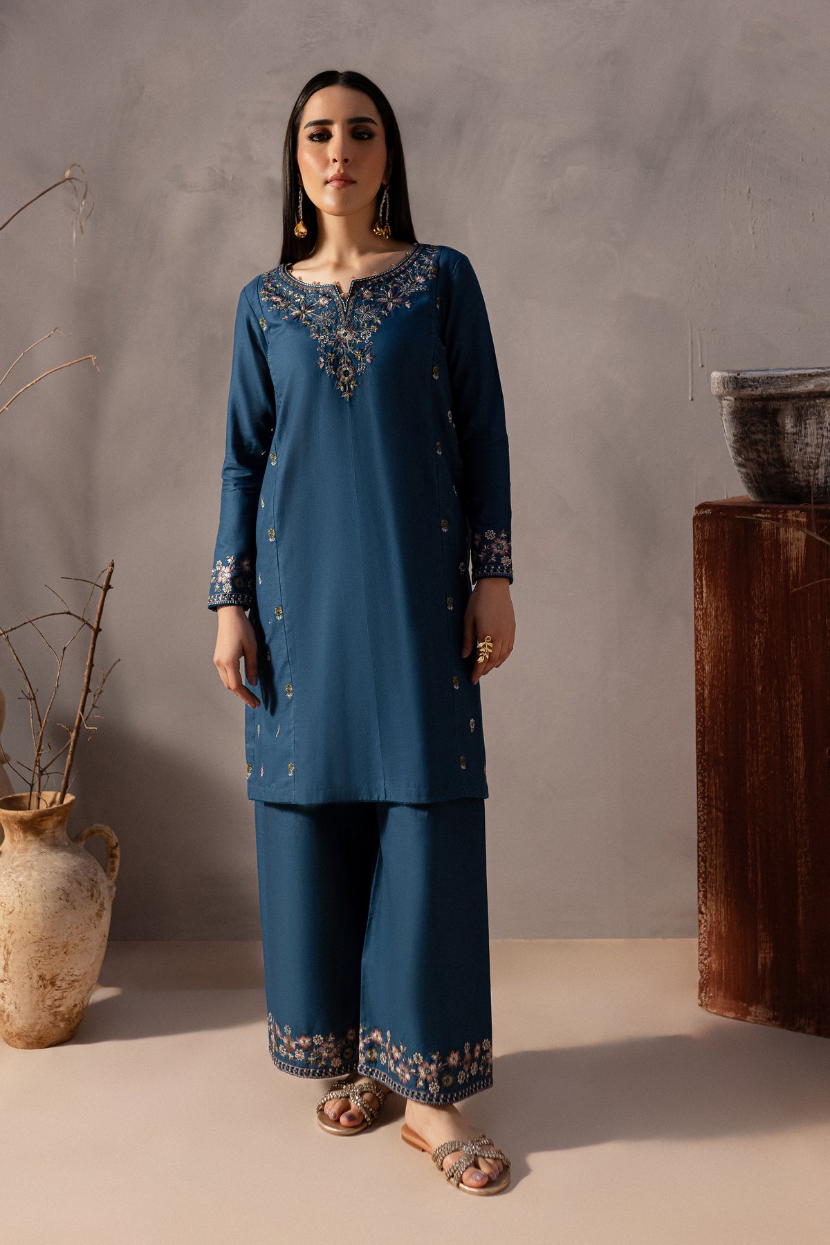 This stunning 2-piece ocean blue khaddar set features a paneled, embroidered shirt that showcases delicate embroidery at the neckline and side panels, adding intricate detail and charm. The fitted sleeves are elegantly finished with a minimal colored embroidered border, offering a refined touch to the overall design.