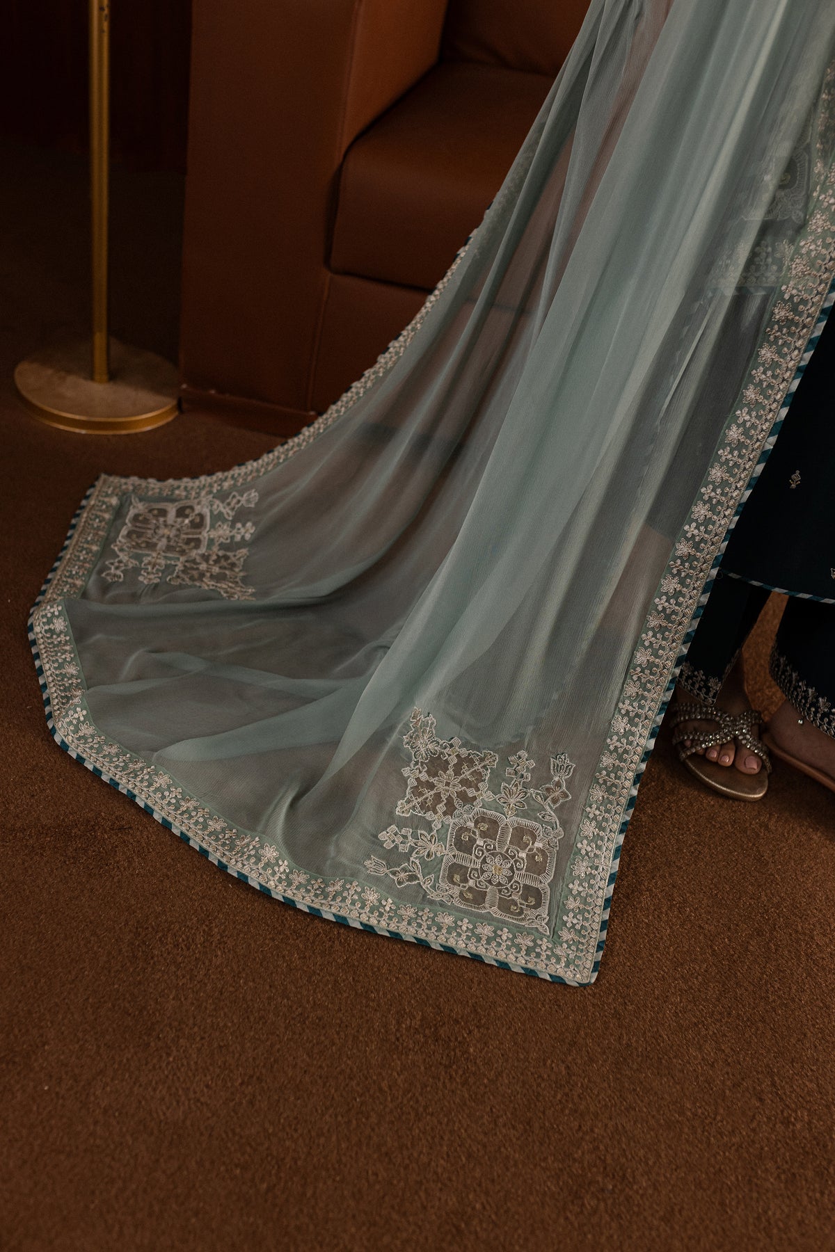 This classic outfit crafted from the most comfortable khaddar fabric in ocean green color is a must-have for the upcoming winter season. Beautifully designed embroidered shirt features heavily embroidered sleeves and neckline, finished with a tassel. Printed facings are added at the hem and sleeves for a fine finish.
