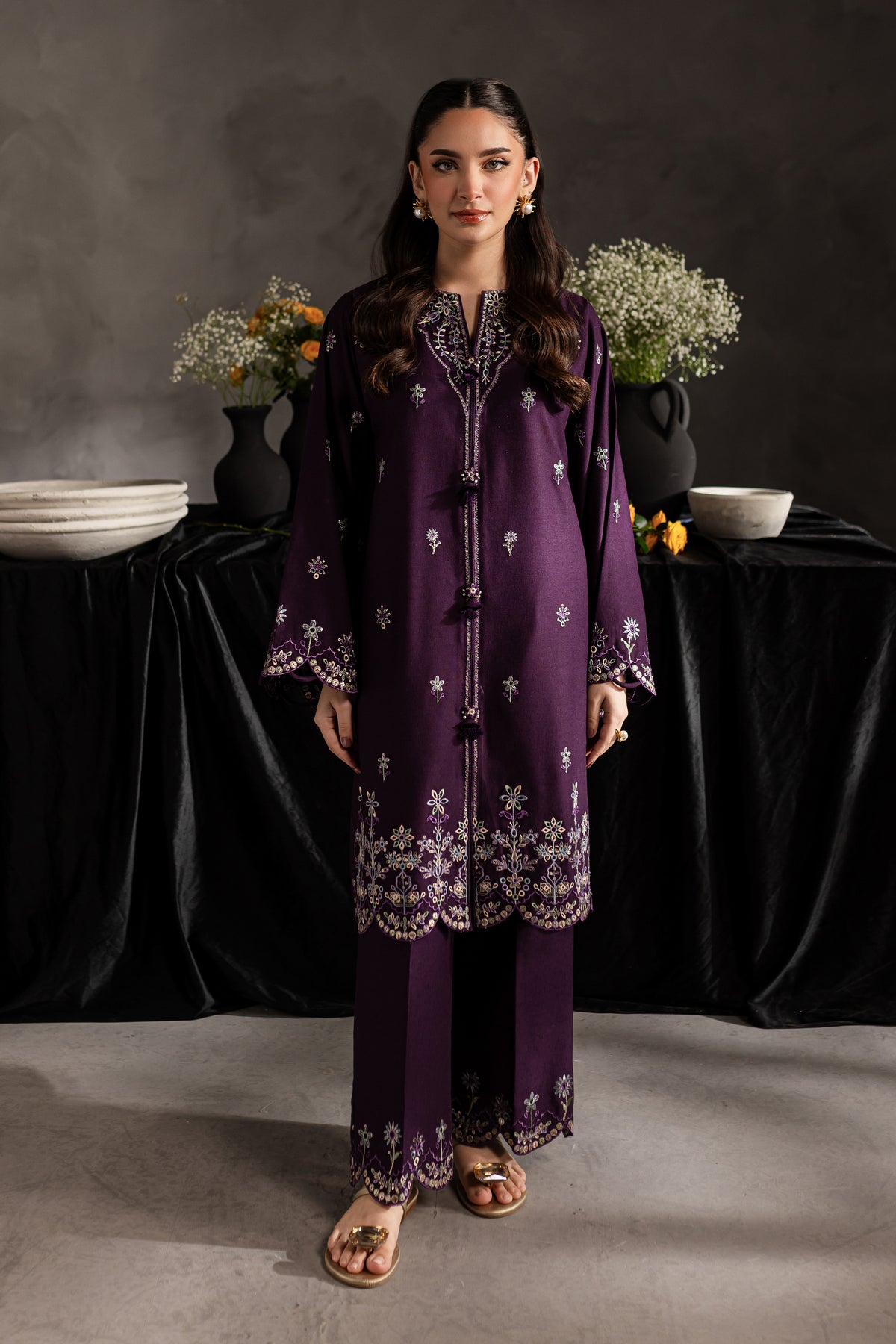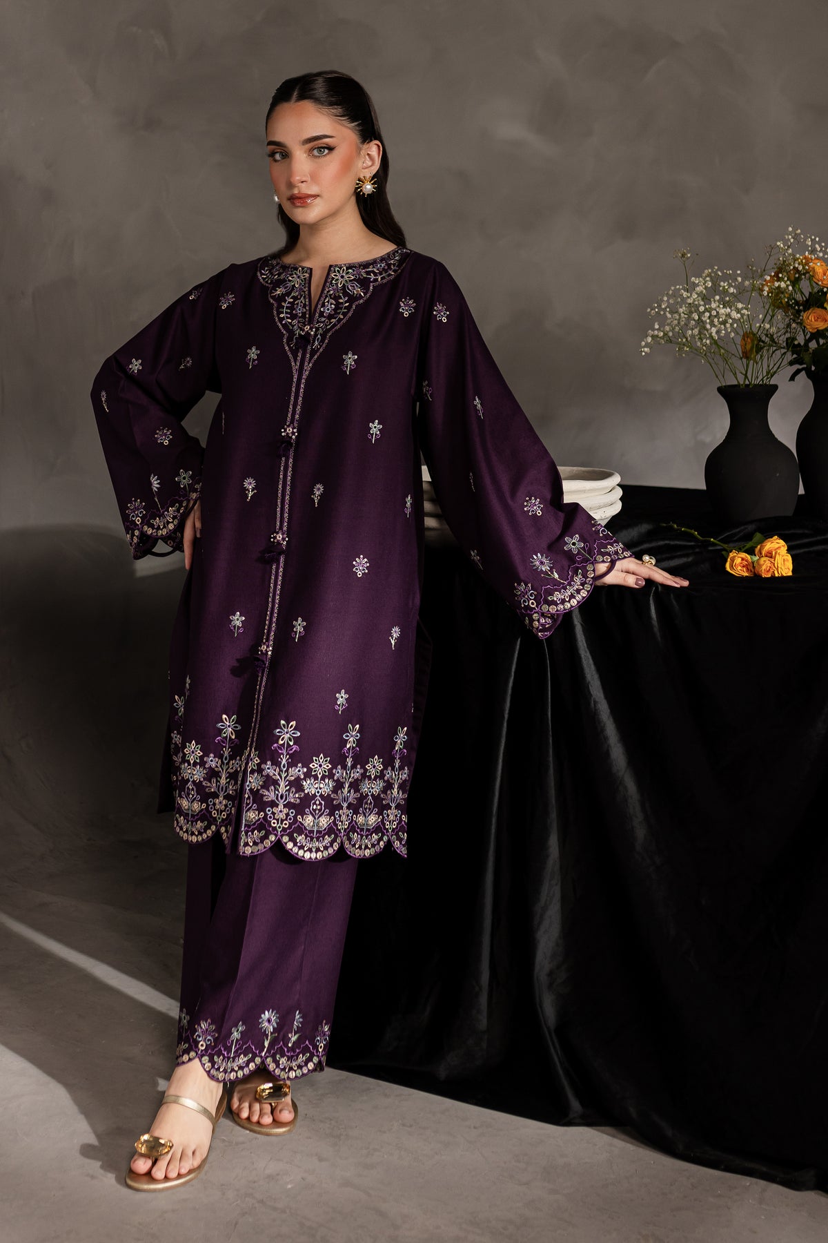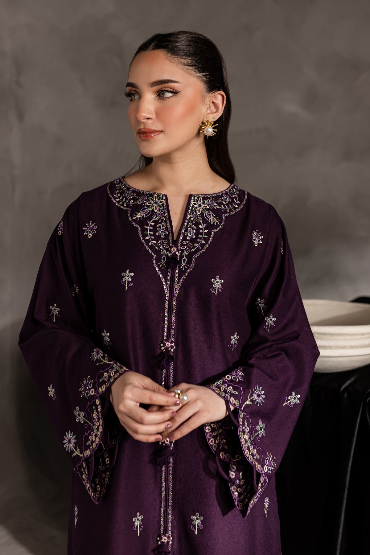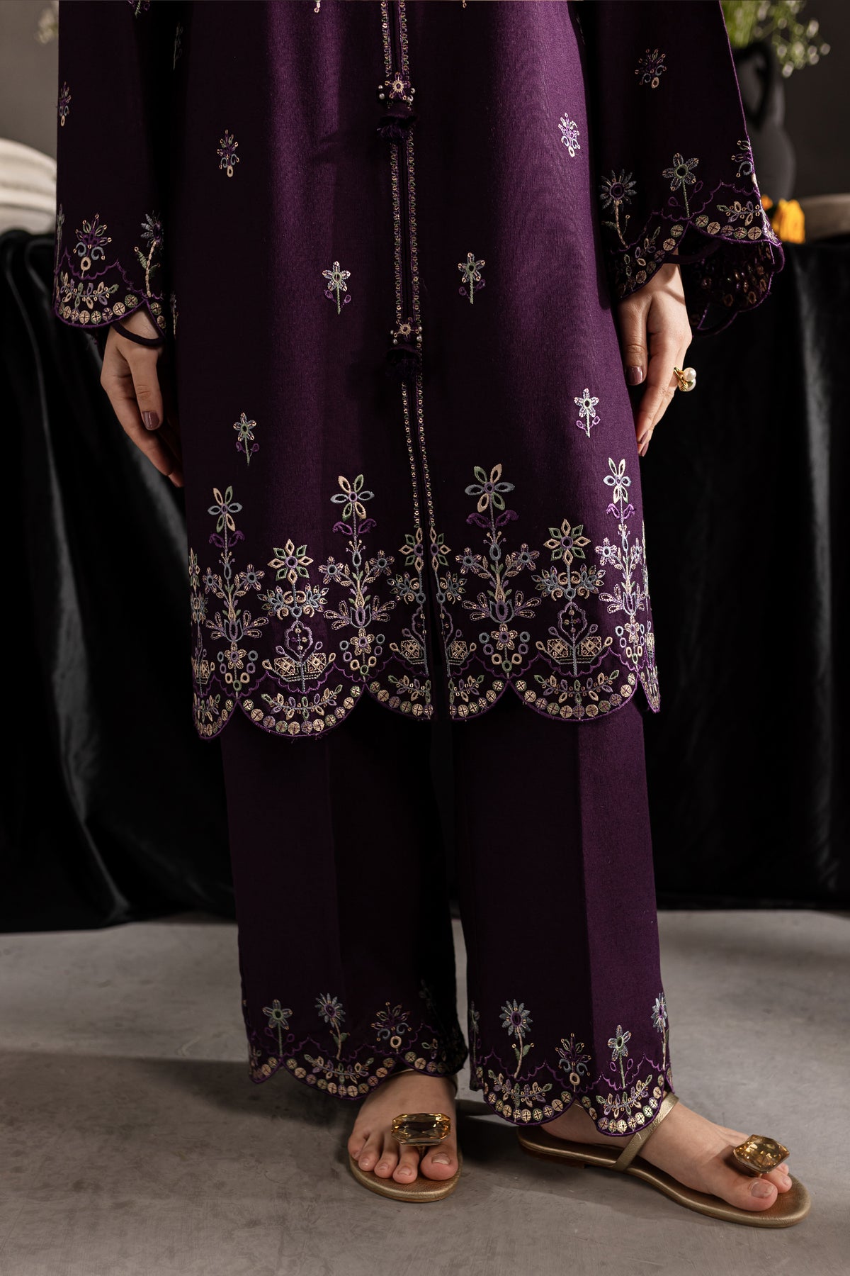 Add a touch of timeless charm to your wardrobe with this karandi 2pc set in egg plant color. This elegant front open shirt is made from luxurious Karandi fabric, offering both comfort and style. The shirt is intricately embroidered with beautiful detailing at the neck, hem, and sleeves, with the embroidery thoughtfully spread all over the shirt for a seamless, ornate look. The addition of boring detail at the neckline enhances the design, giving it a sophisticated and refined touch.