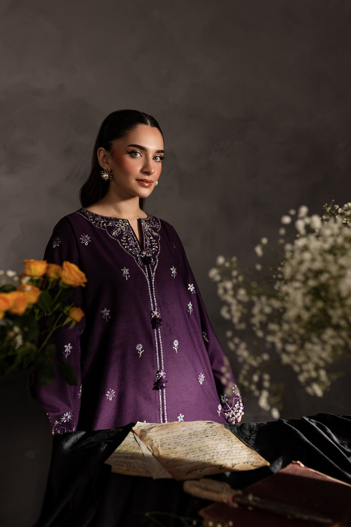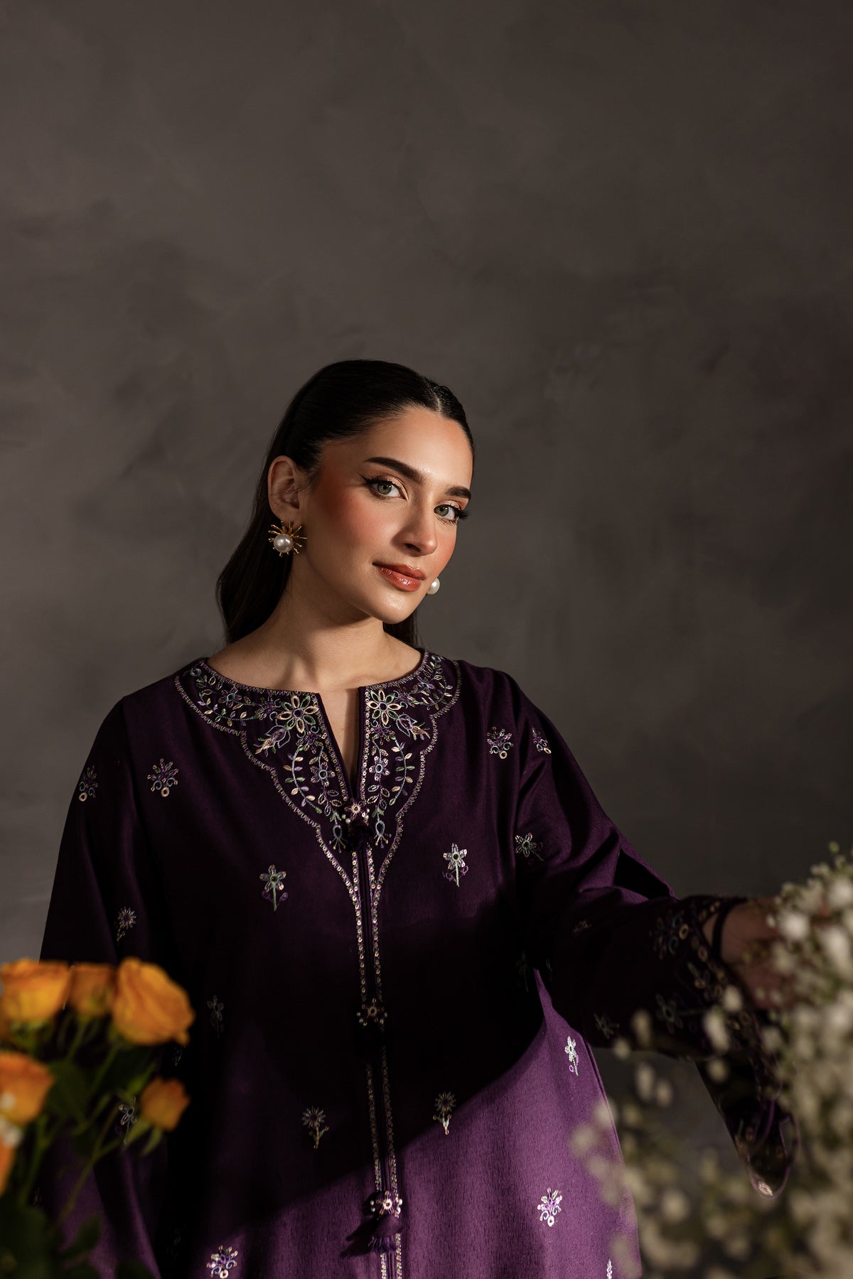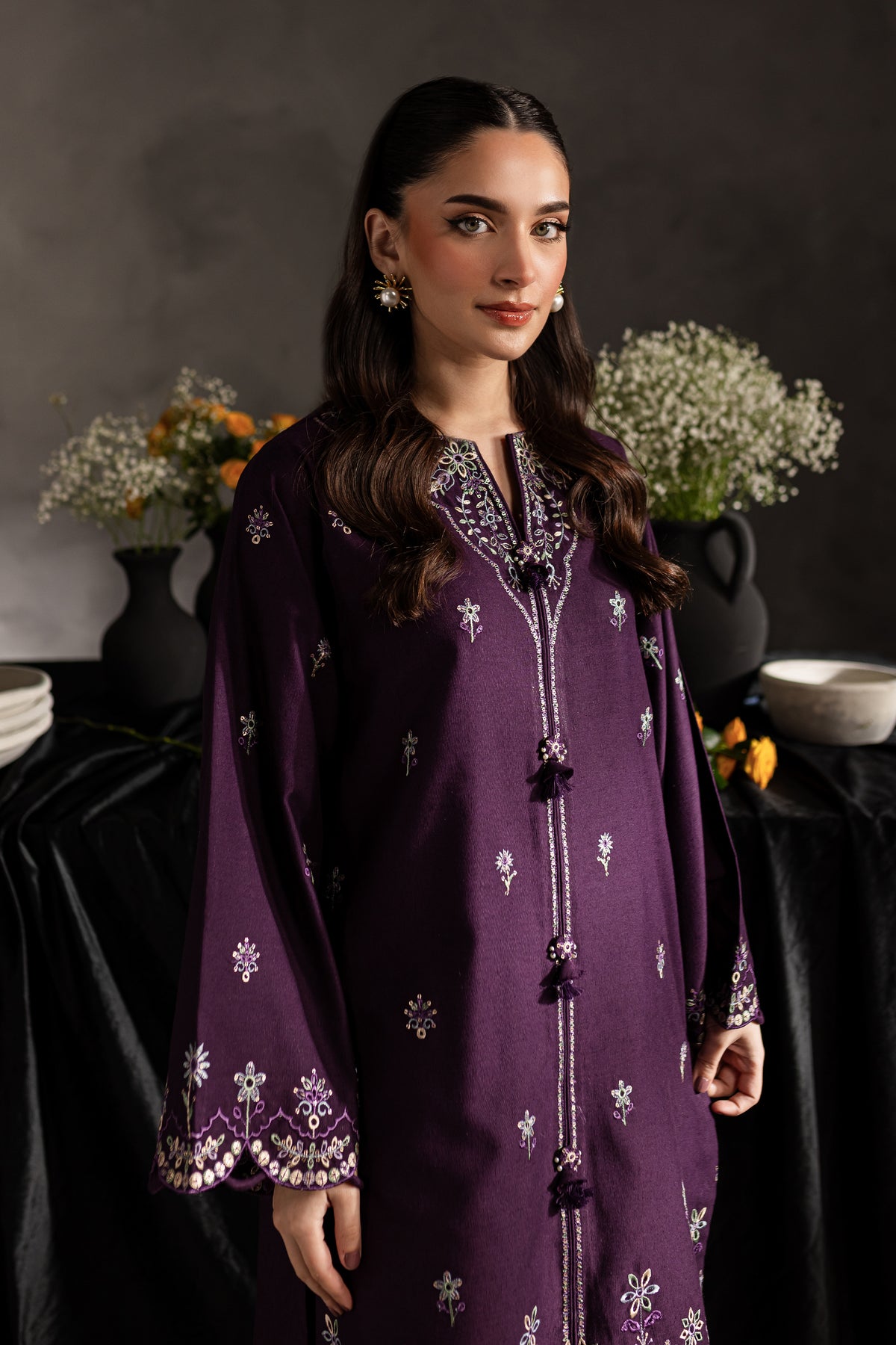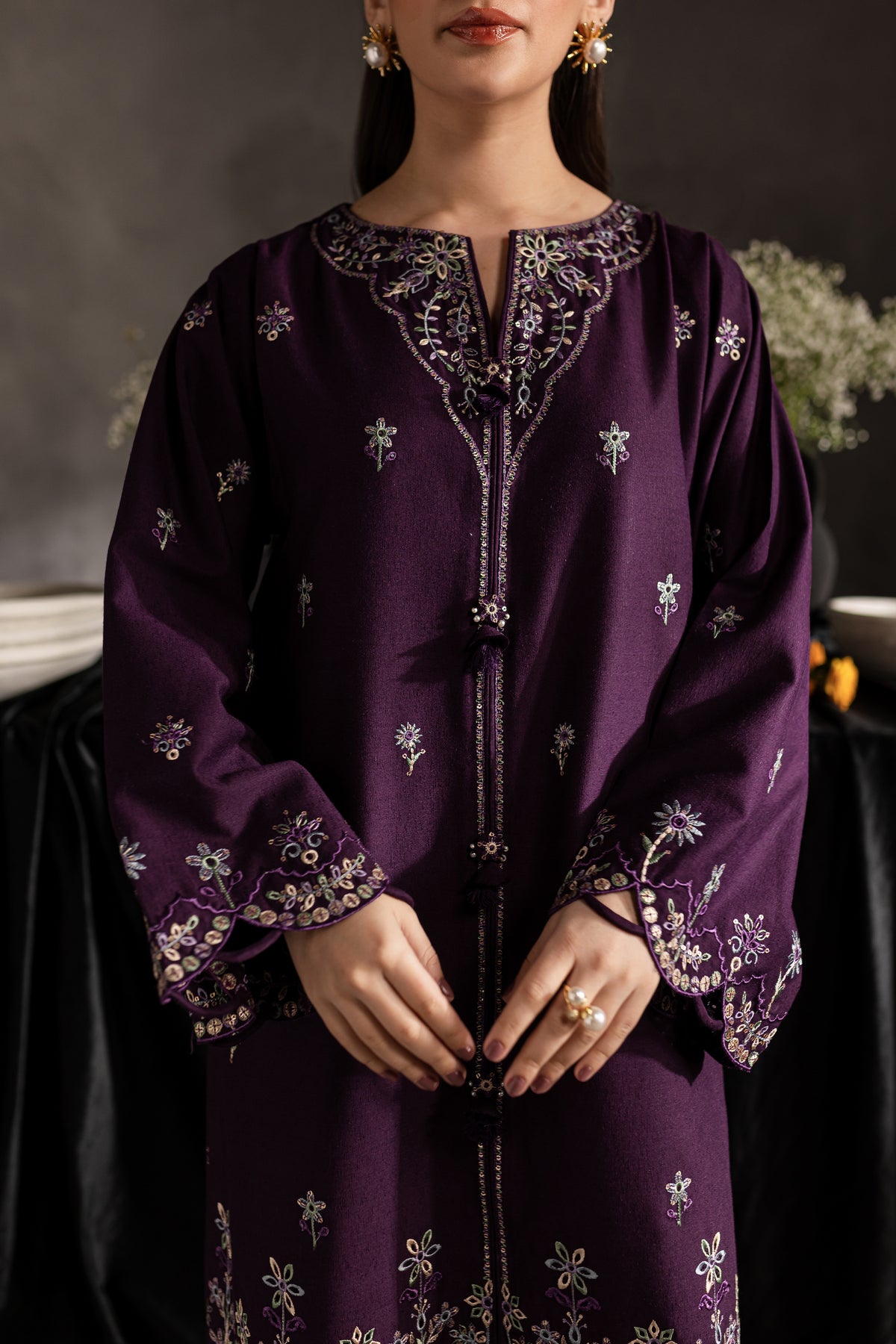 Add a touch of timeless charm to your wardrobe with this karandi 2pc set in egg plant color. This elegant front open shirt is made from luxurious Karandi fabric, offering both comfort and style. The shirt is intricately embroidered with beautiful detailing at the neck, hem, and sleeves, with the embroidery thoughtfully spread all over the shirt for a seamless, ornate look. The addition of boring detail at the neckline enhances the design, giving it a sophisticated and refined touch.