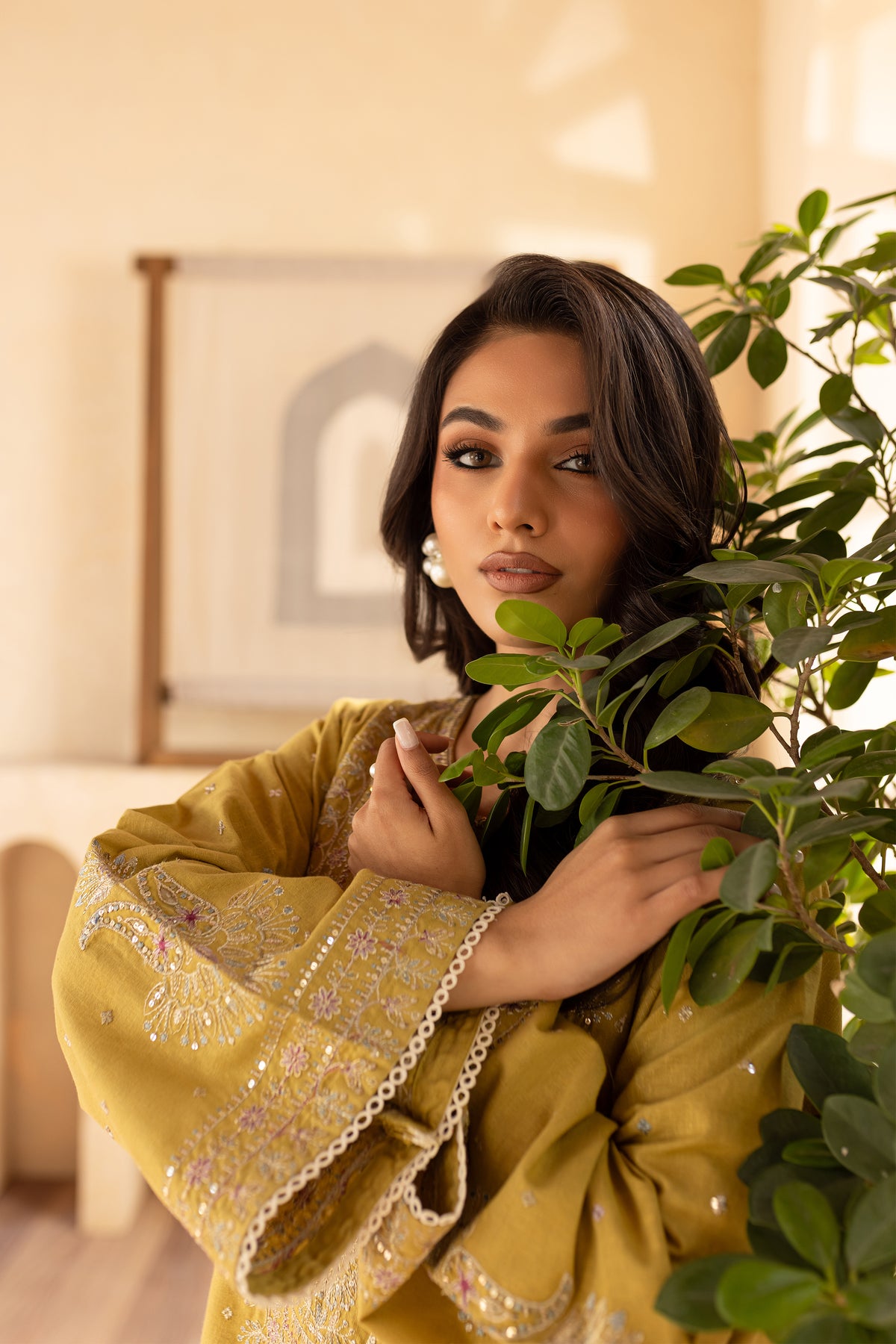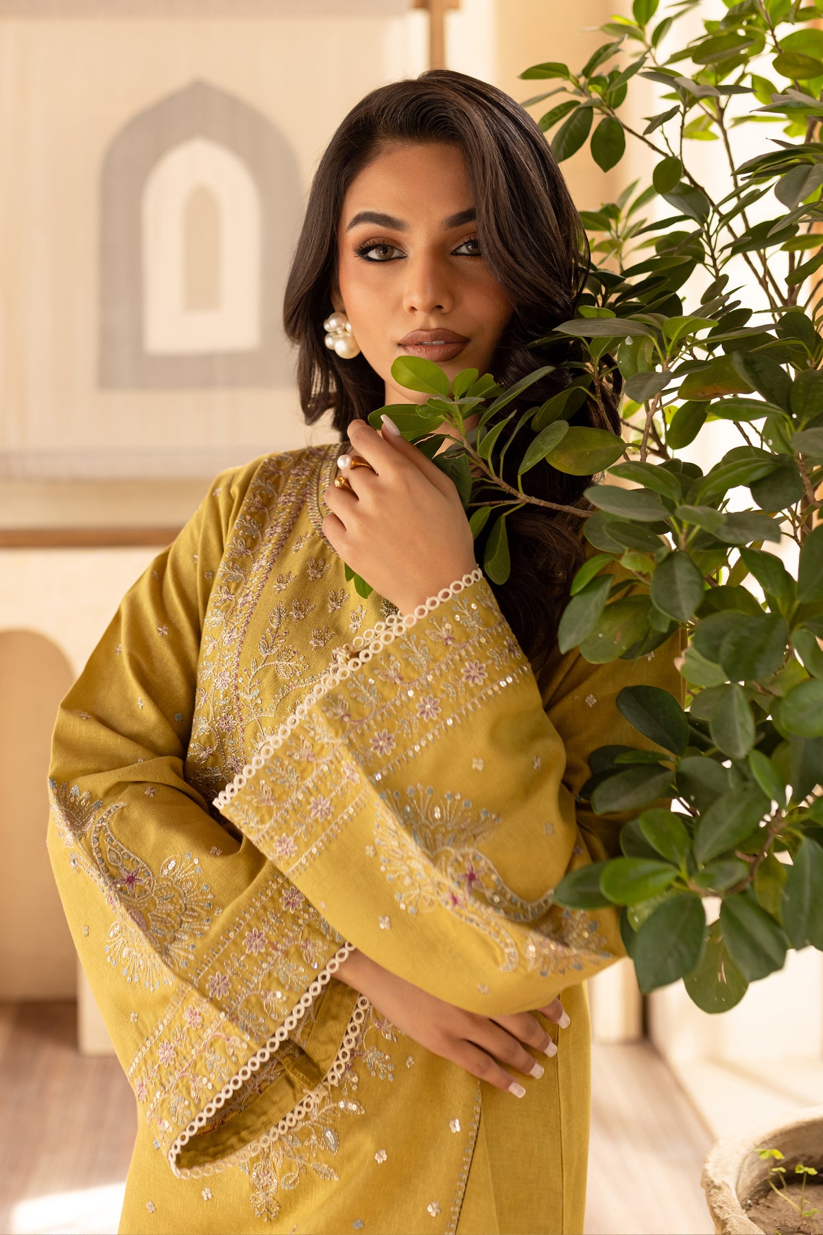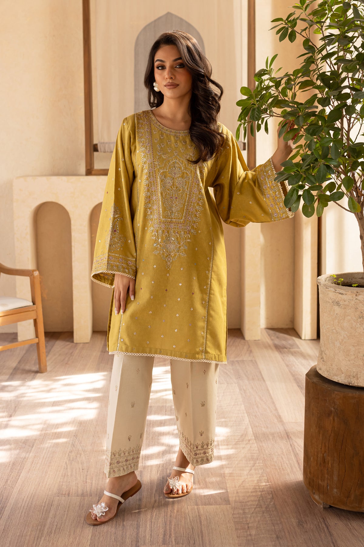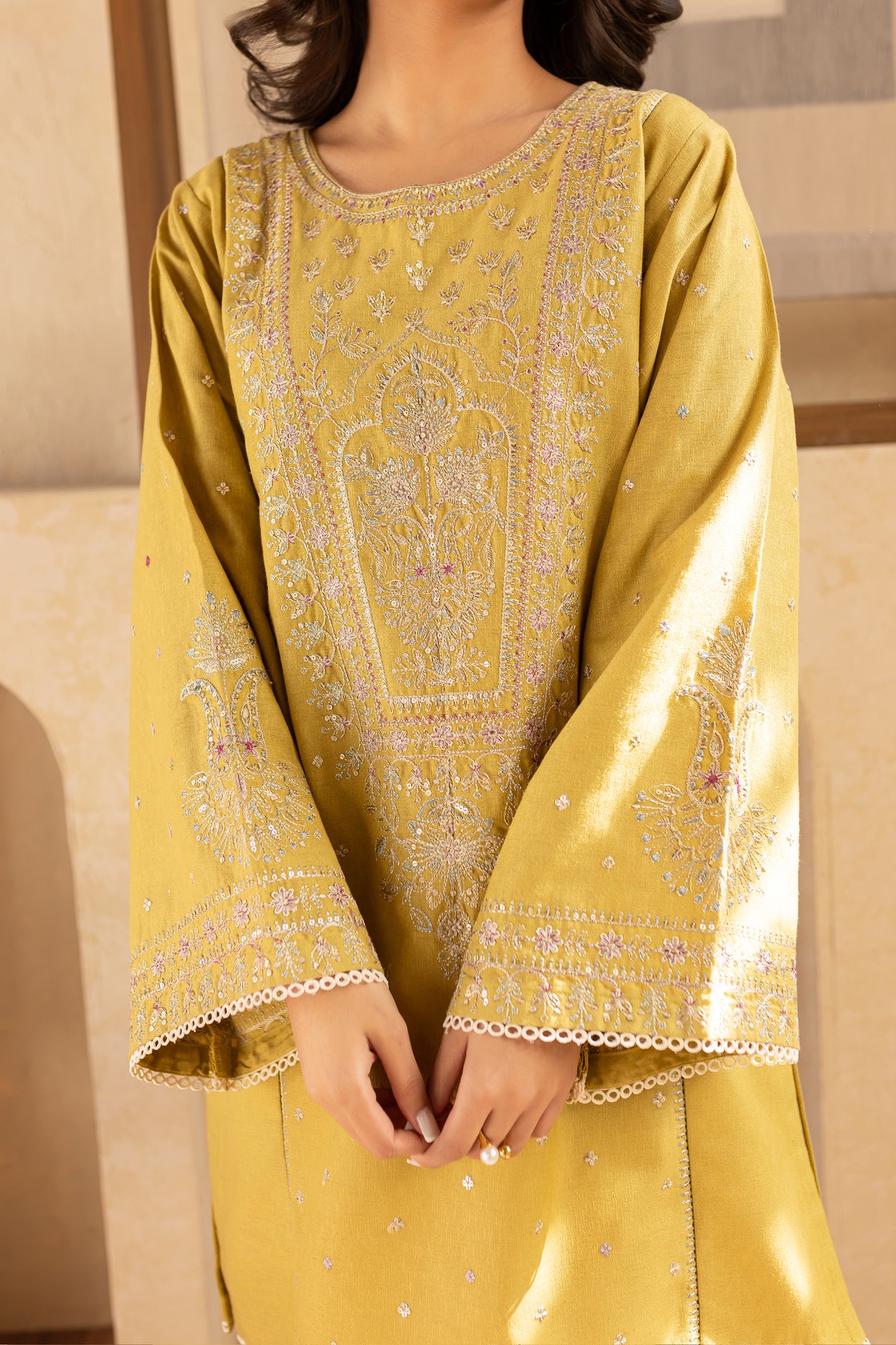 Paired with karandi trousers, designed with spread embroidery and bordered detailing, provide a striking contrast, while the lace trim finishes the ensemble with a soft, elegant touch.