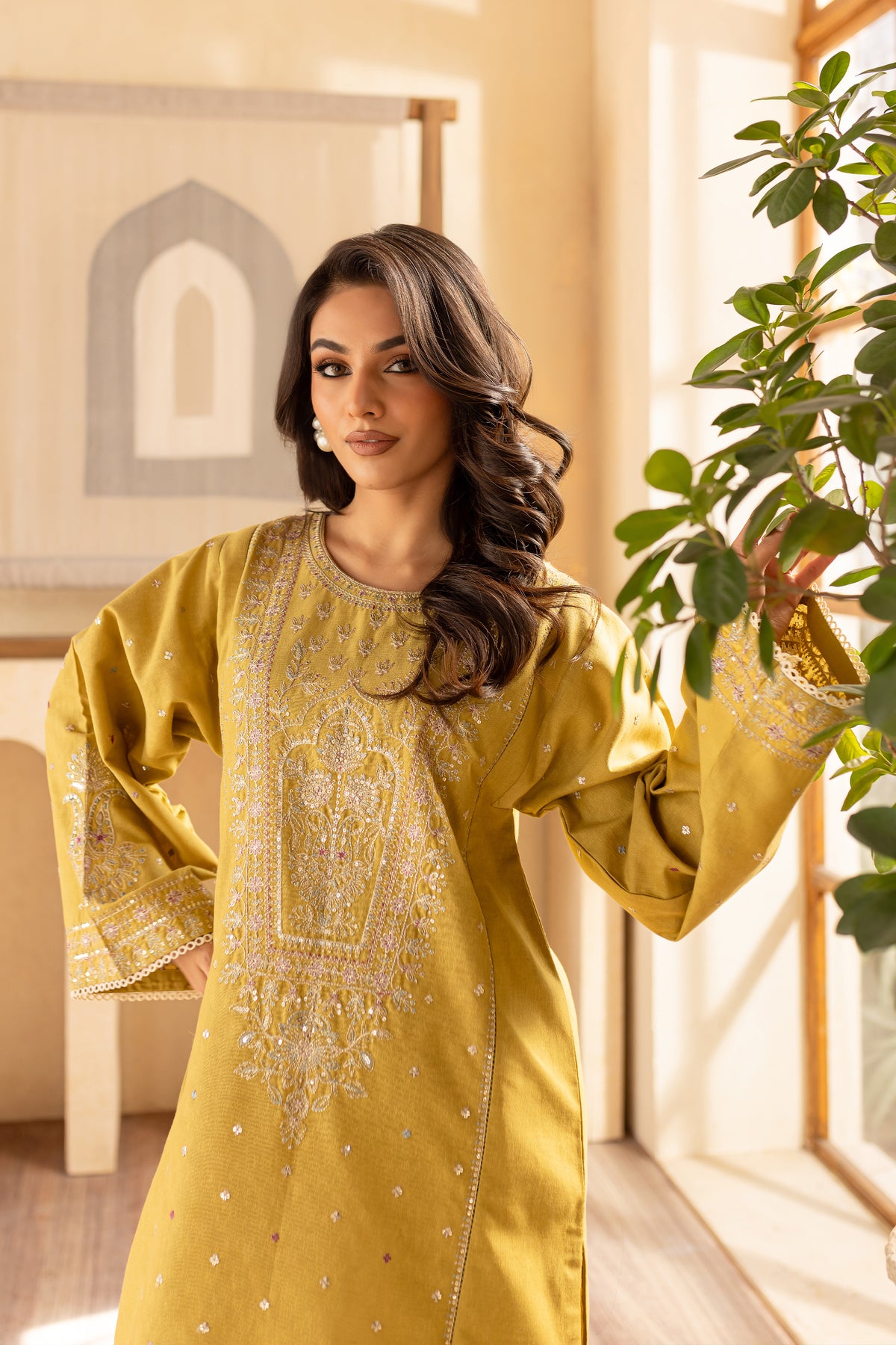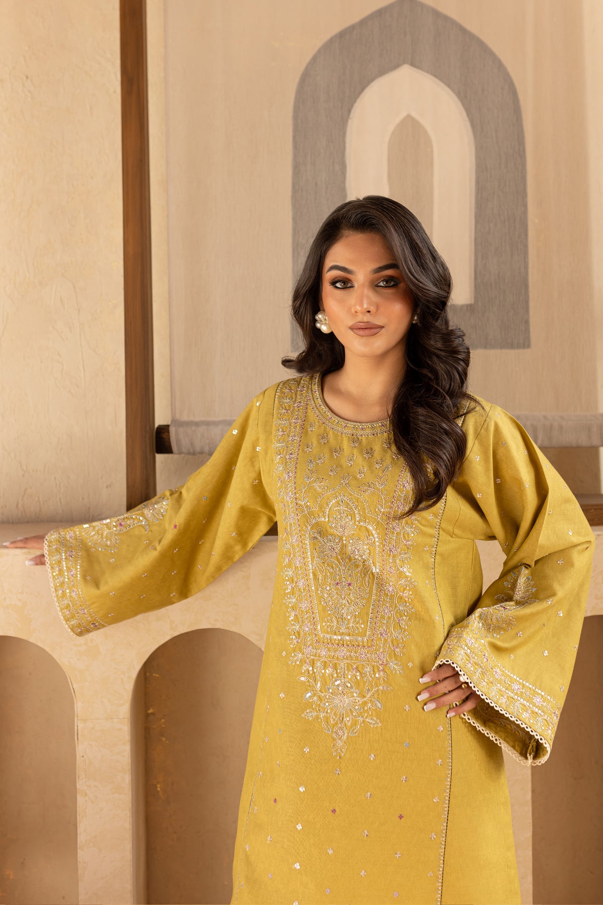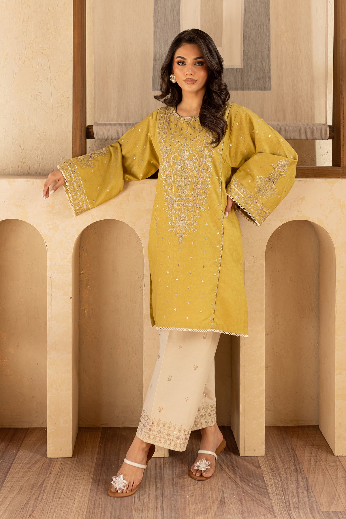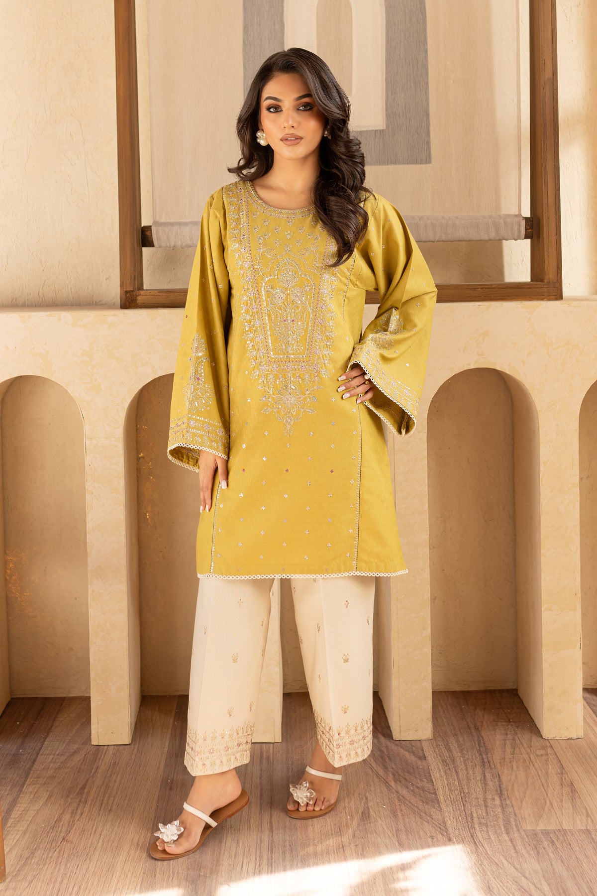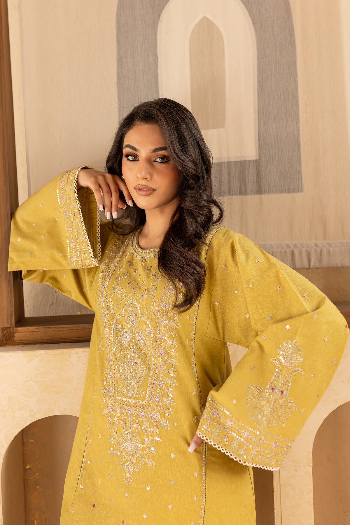 This stunning Lime karandi ensemble begins with a short shirt featuring kurta sleeves, an intricately embroidered neckline, and elegant flared sleeves that add a touch of grace and sophistication. The shirt exudes modern charm with its timeless design, making it perfect for any occasion.