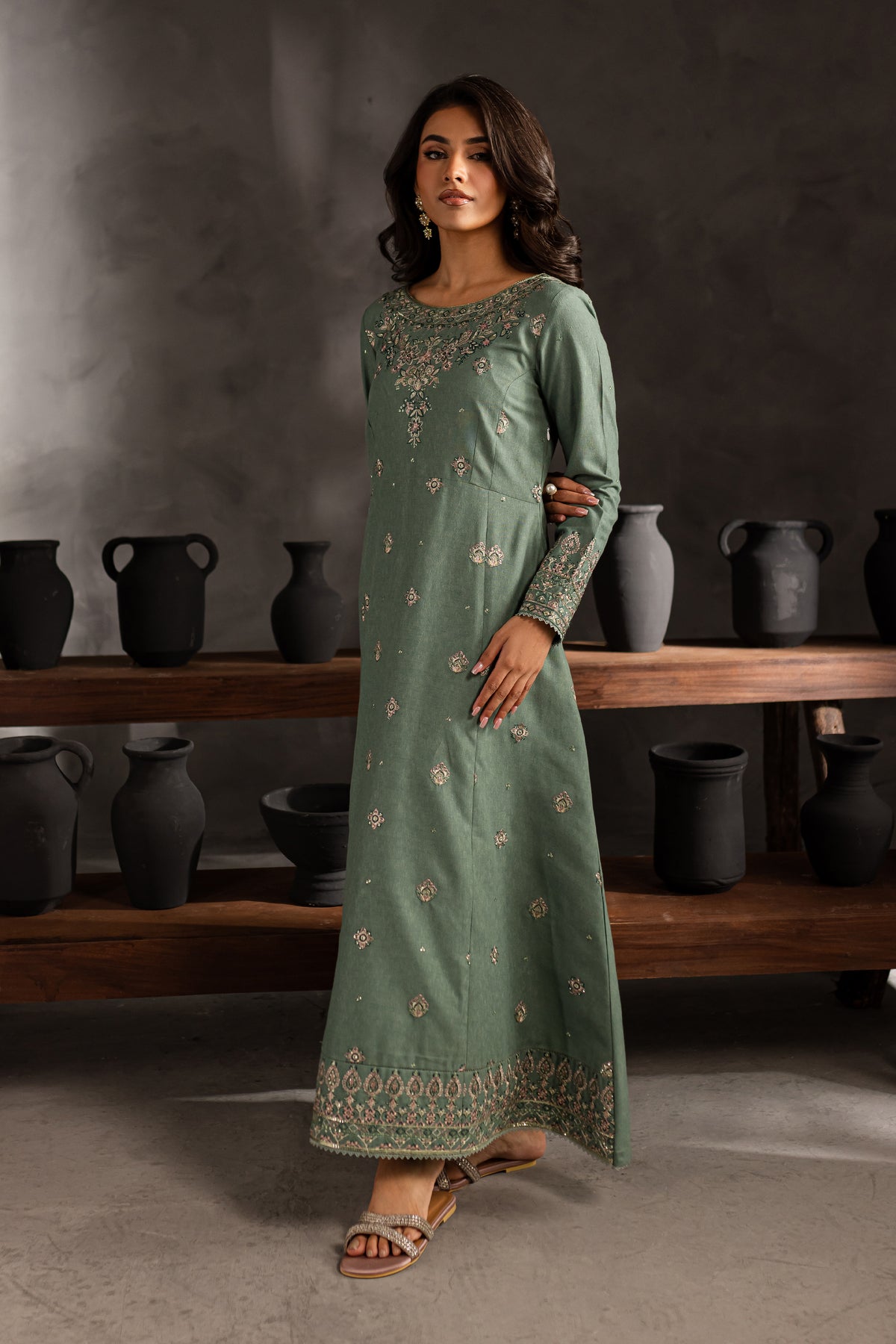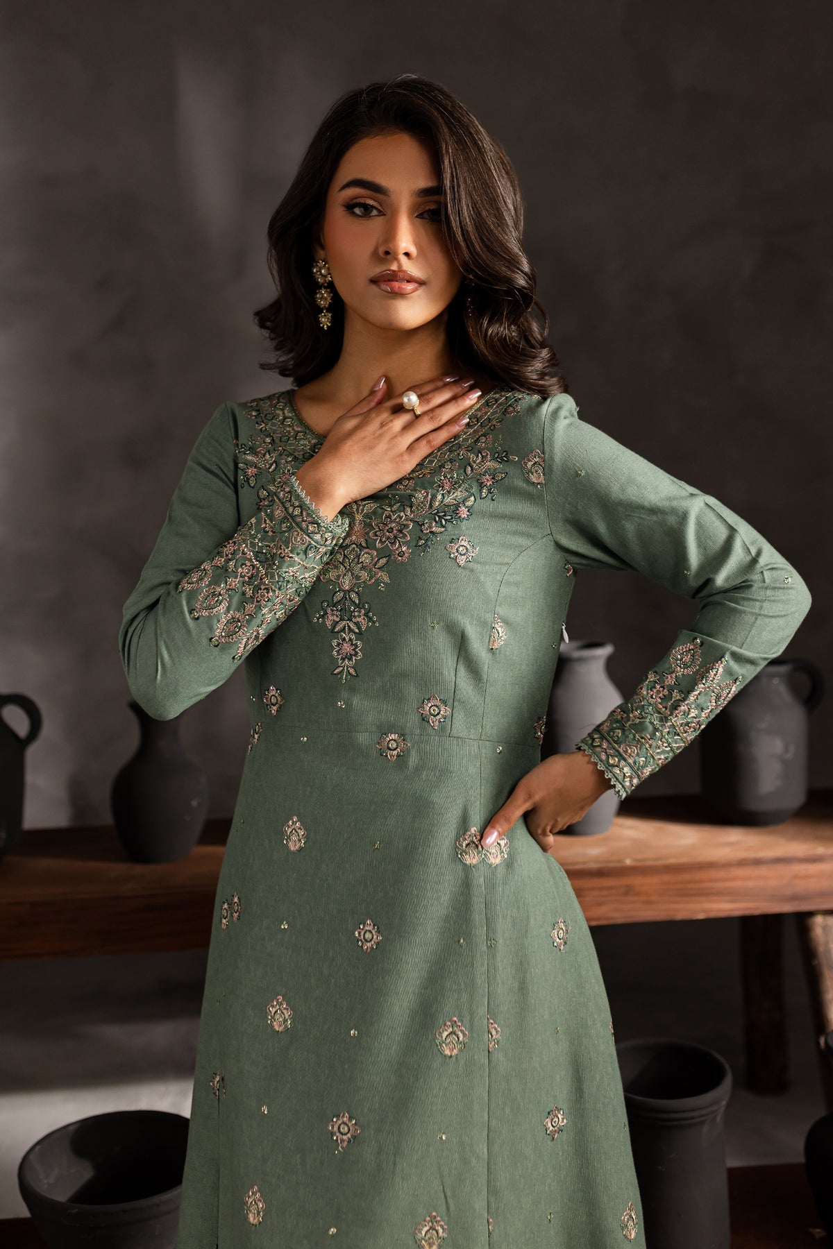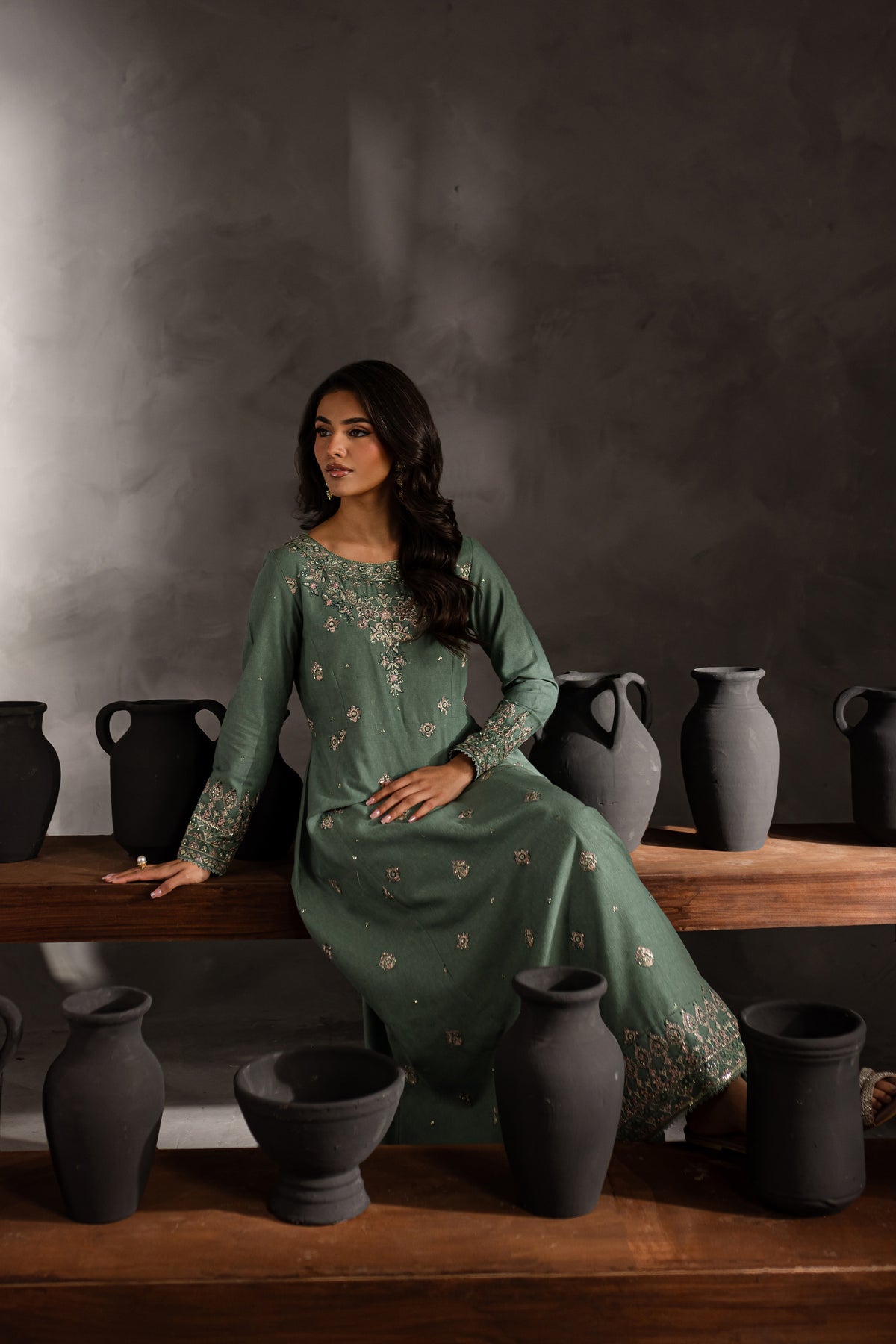 This stunning 2-piece ensemble features a panelled sea green karandi frock that is exquisitely designed with an intricate embroidery spread, creating a beautiful and detailed pattern throughout. The embroidery is enhanced with shimmering sequins, adding a subtle sparkle and a touch of elegance. The embroidered neckline is a focal point, drawing attention to the beautifully crafted design. The borders on the sleeves and the hem of the frock are also embroidered.