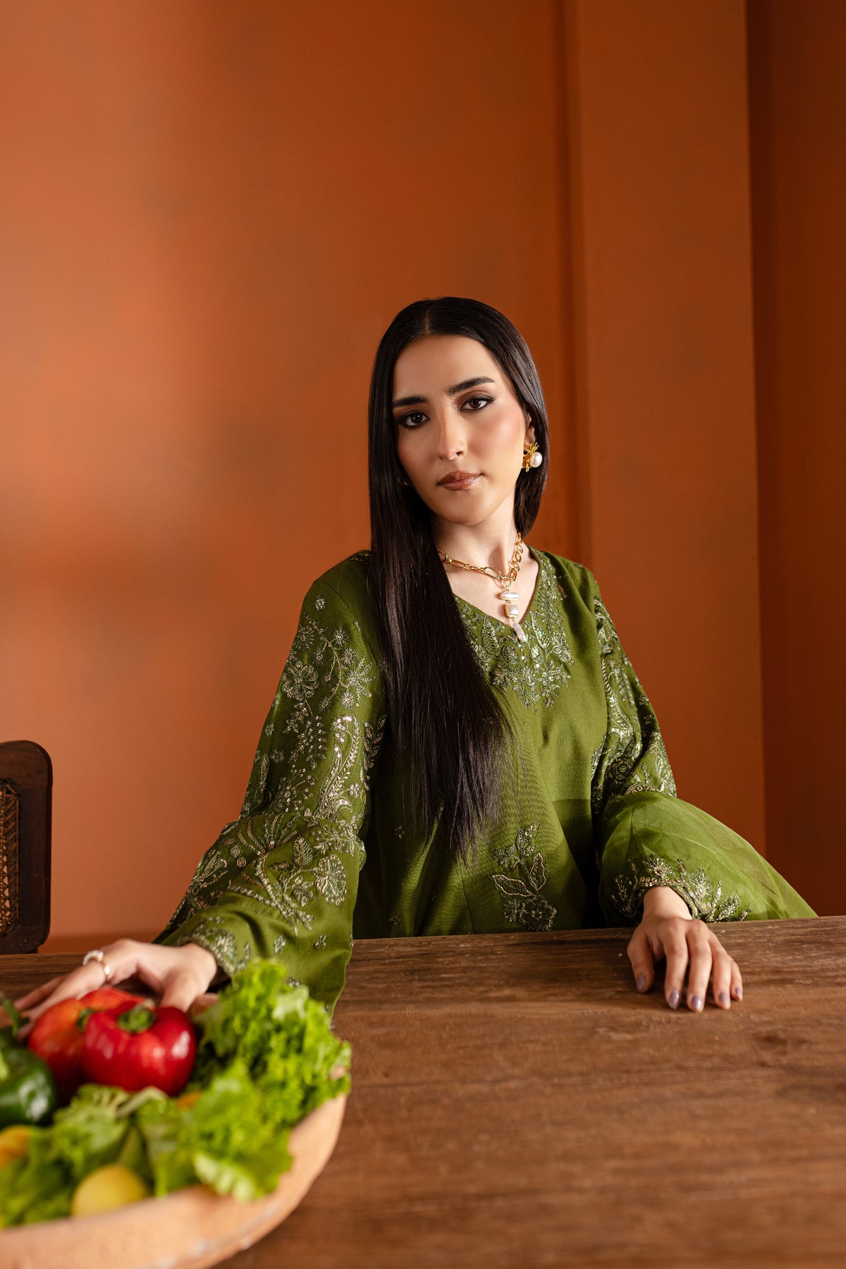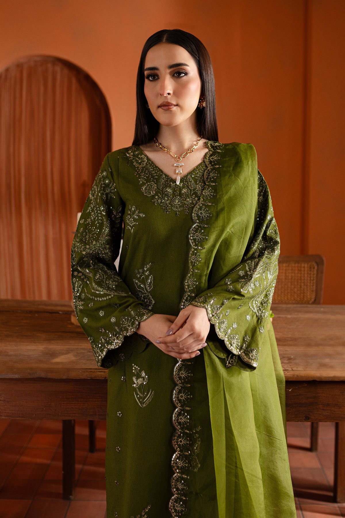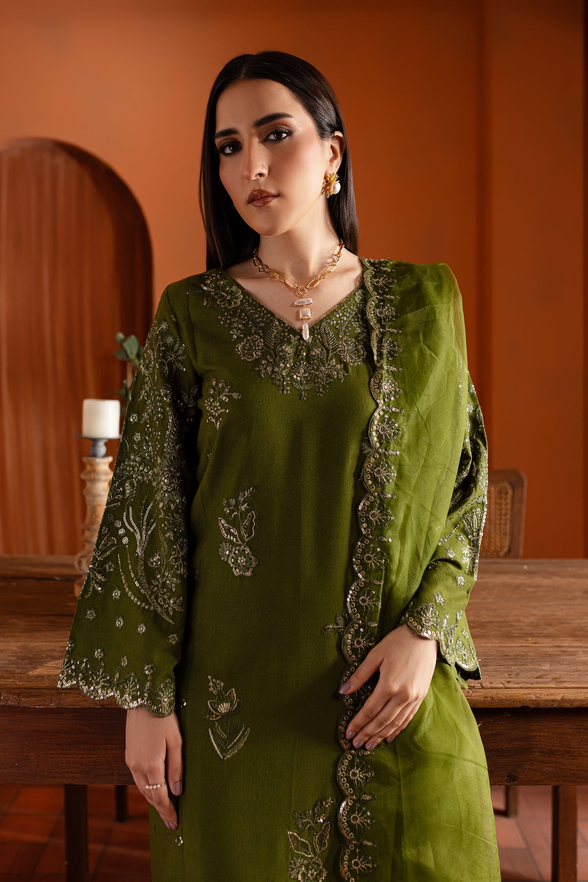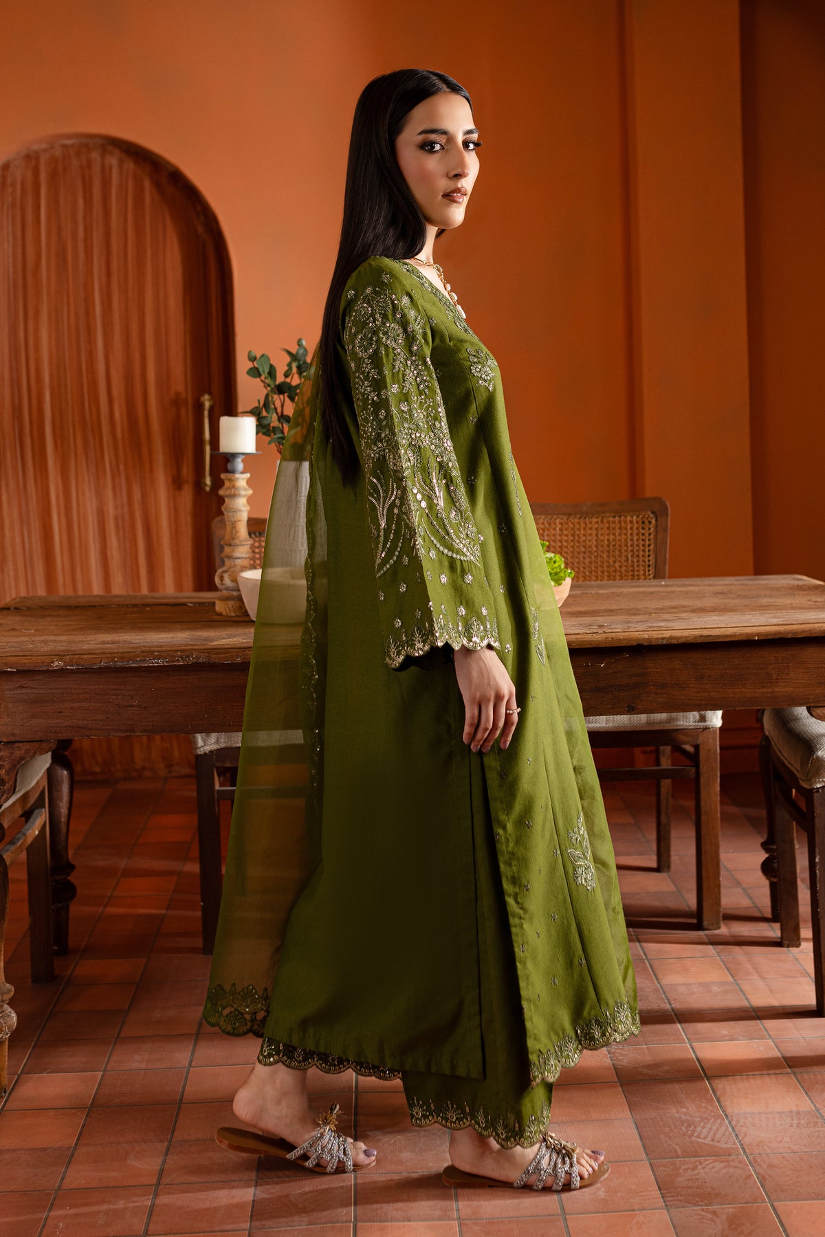Graceful and sophisticated, this grass-green karandi outfit is the epitome of timeless style. The shirt is a panelled design with a composed embroidered spread on the front, beautifully finished with scalloped edges. The sleeves are heavily embroidered and finished with scalloped detailing for added elegance.