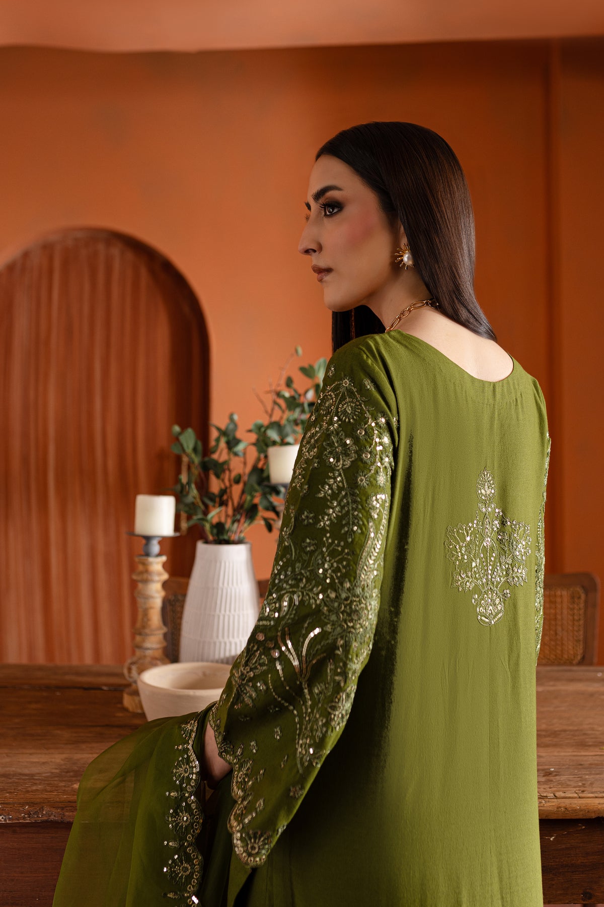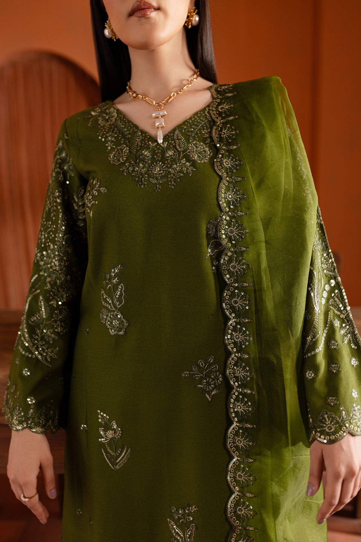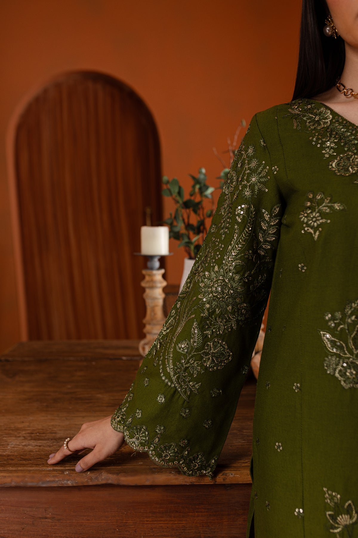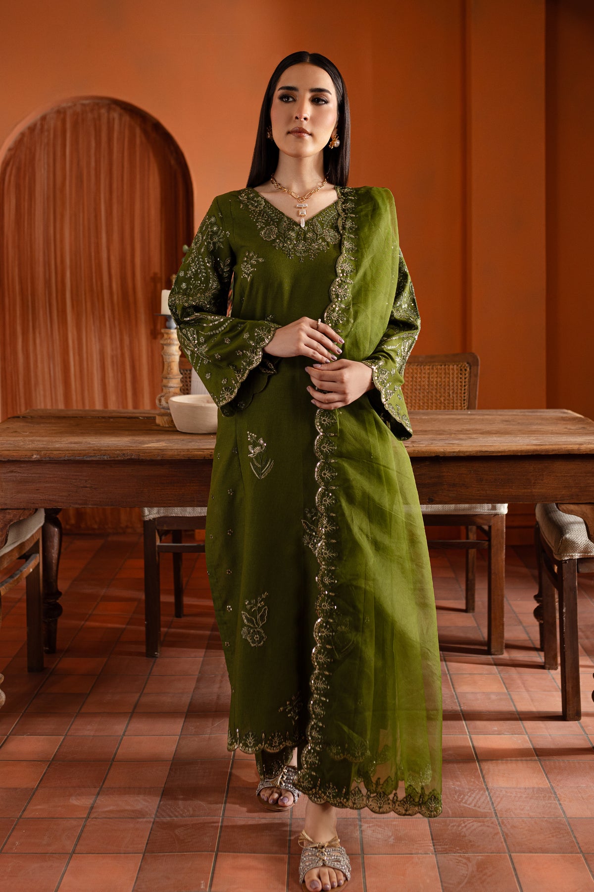 Graceful and sophisticated, this grass-green karandi outfit is the epitome of timeless style. The shirt is a panelled design with a composed embroidered spread on the front, beautifully finished with scalloped edges. The sleeves are heavily embroidered and finished with scalloped detailing for added elegance.
