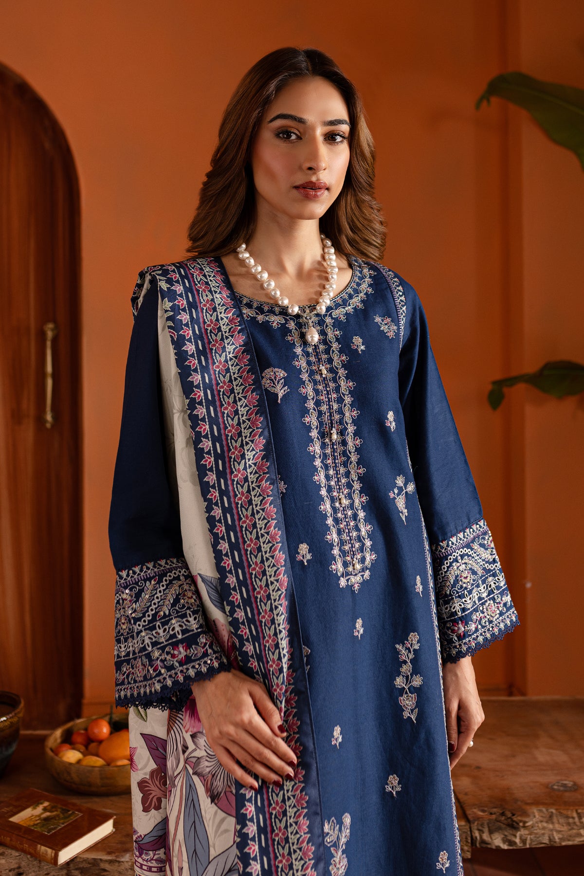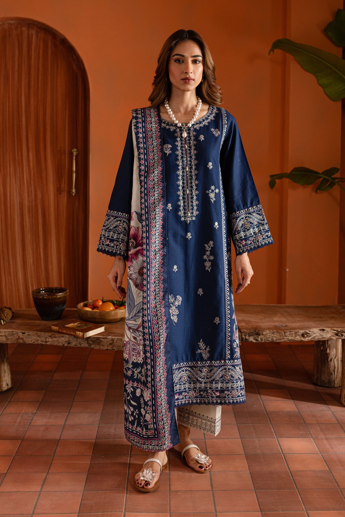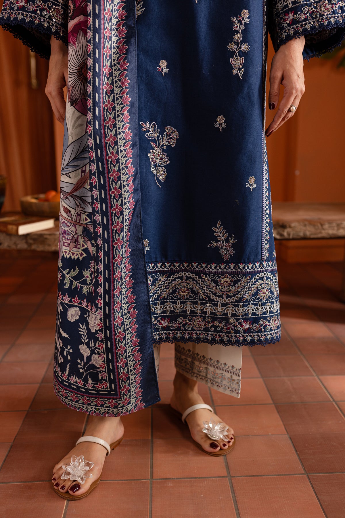 The shirt in blue khaddar has a long-panelled design with composed embroidery on the front and side panels. The hem features heavy borders while the sleeves are adorned with intricate embroidery creating a balanced and detailed look.