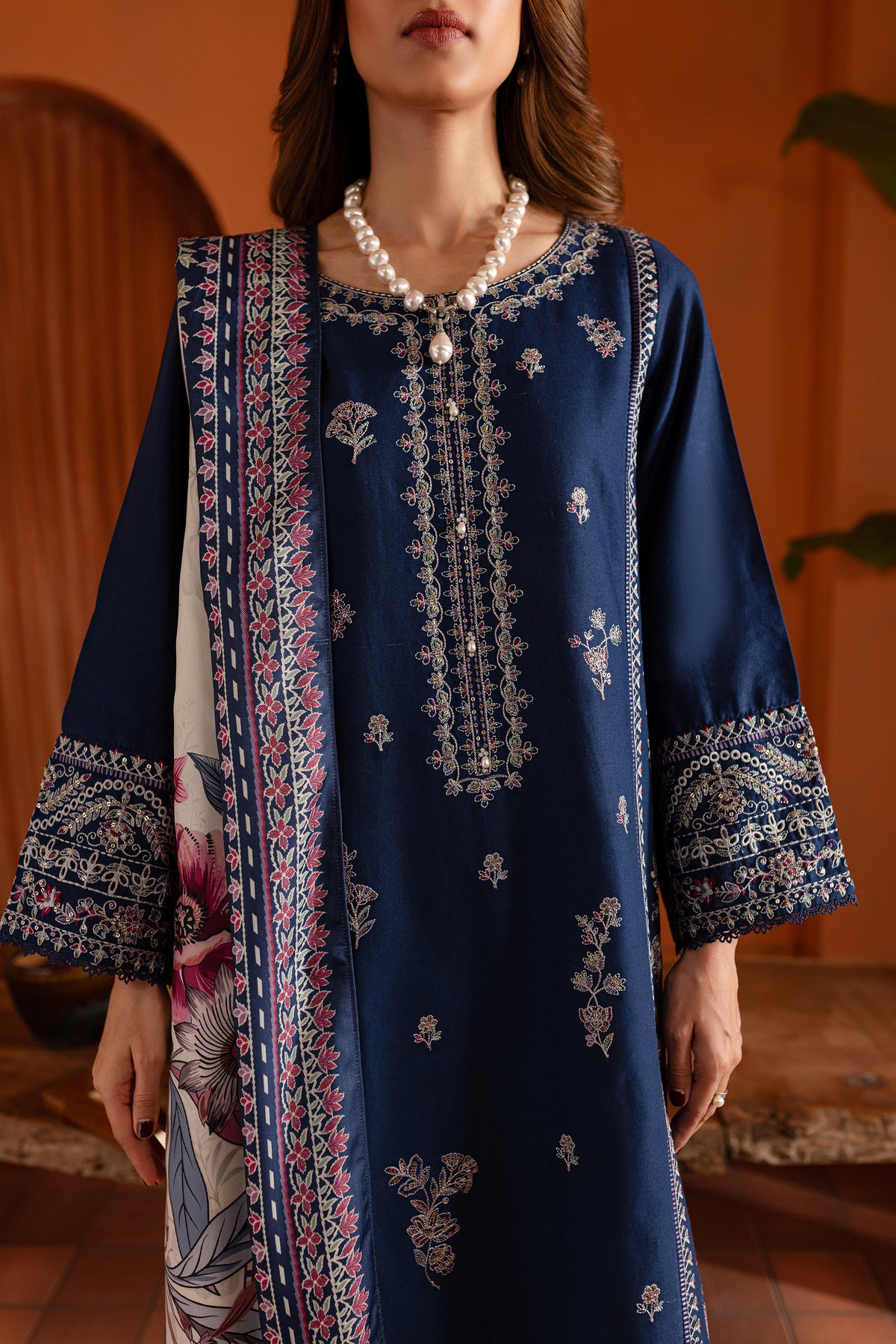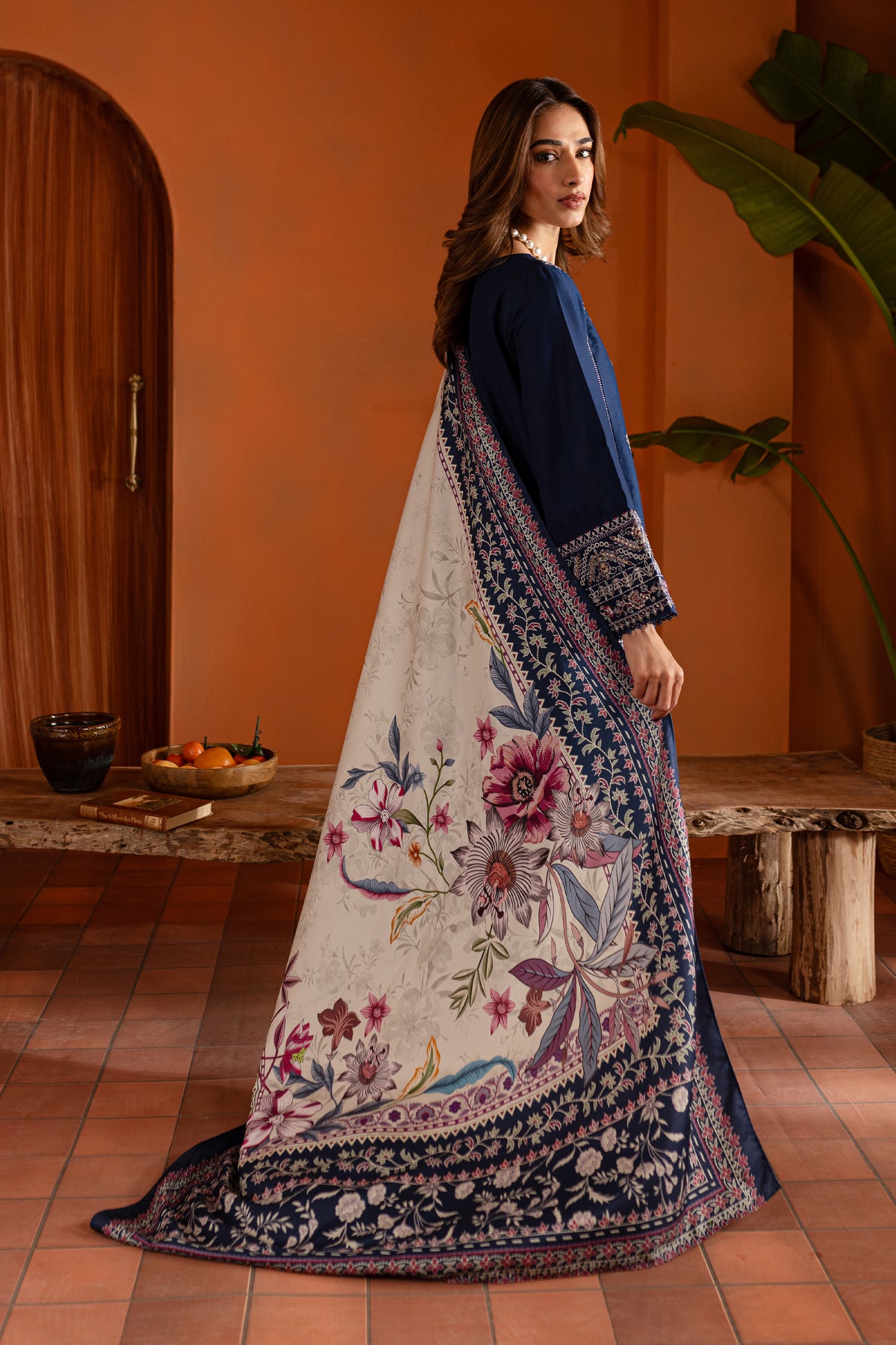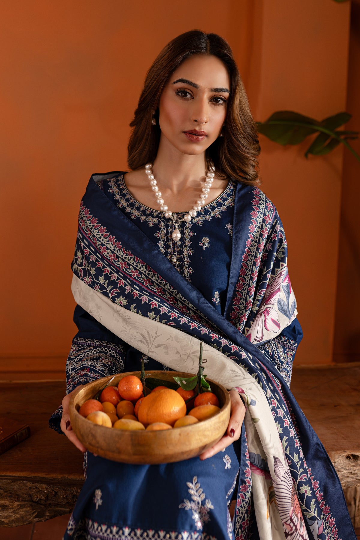 The shirt in blue khaddar has a long-panelled design with composed embroidery on the front and side panels. The hem features heavy borders while the sleeves are adorned with intricate embroidery creating a balanced and detailed look.