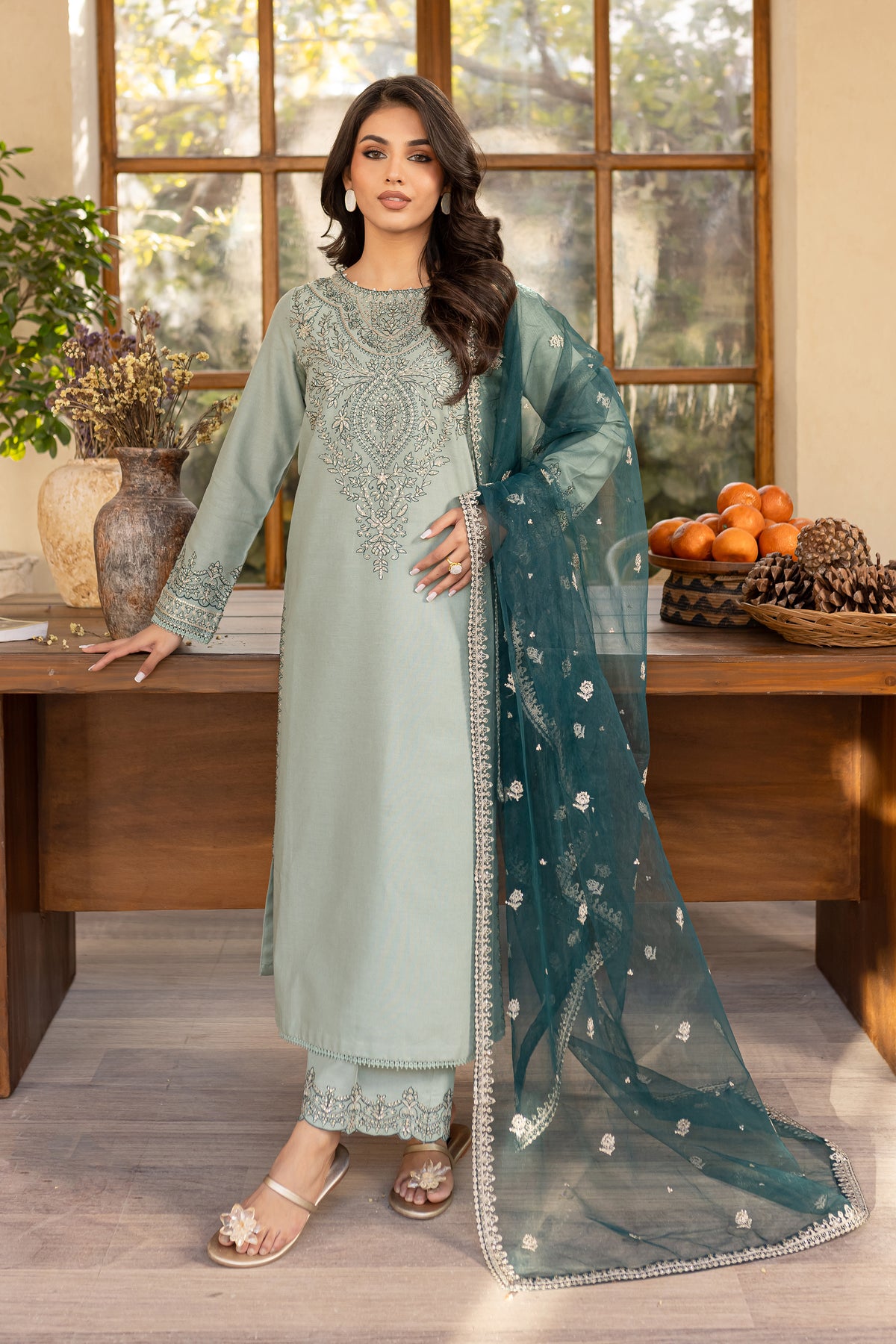 Exude timeless elegance in this heavily composed sea green khaddar shirt, designed to make a statement. The intricate craftsmanship and bold design elements elevate its sophisticated charm, making it perfect for any formal occasion.