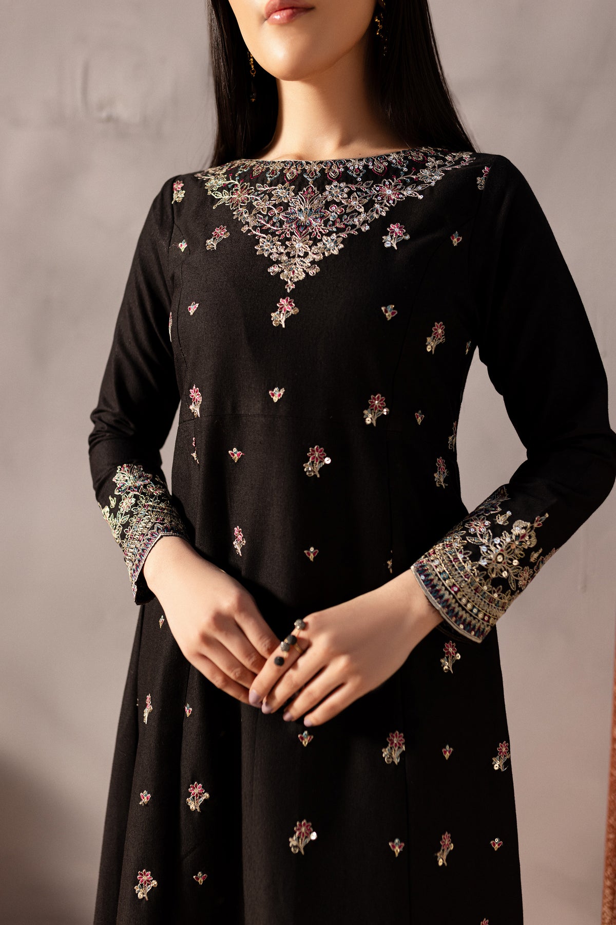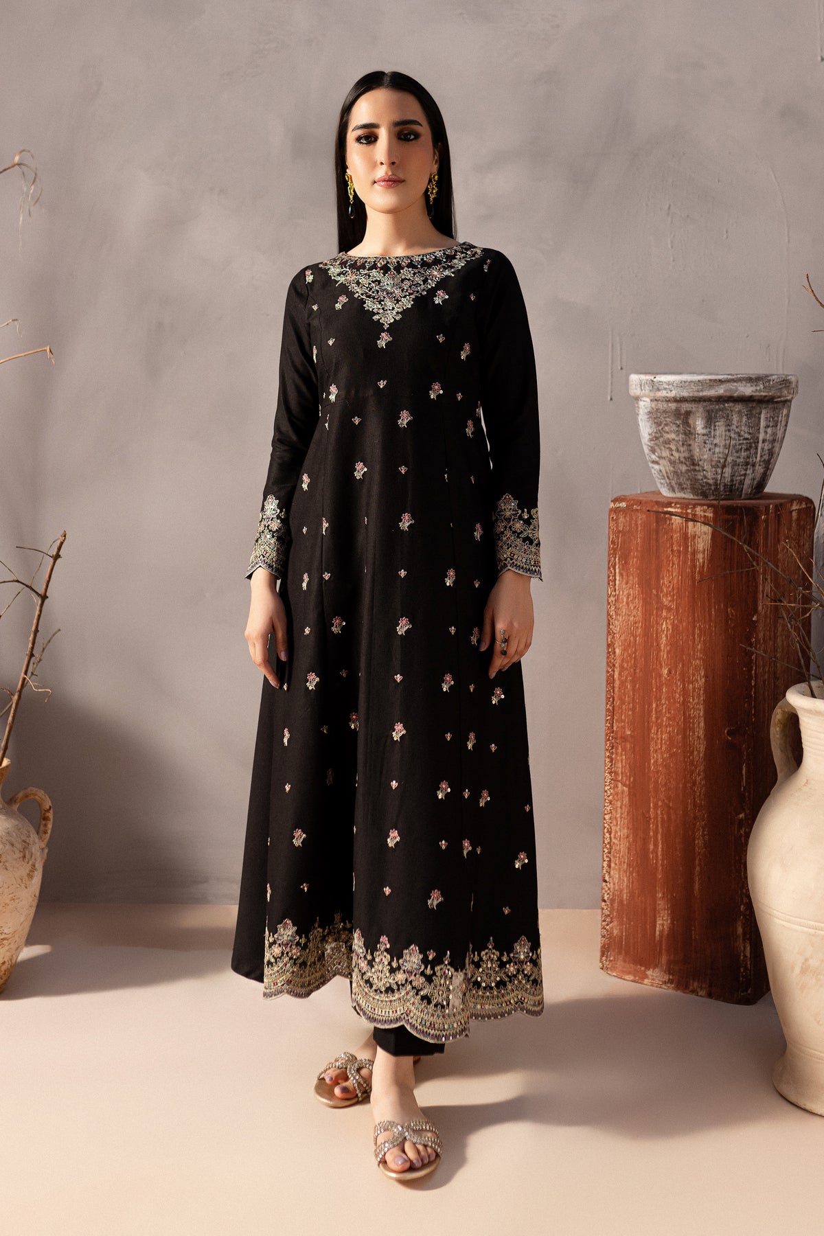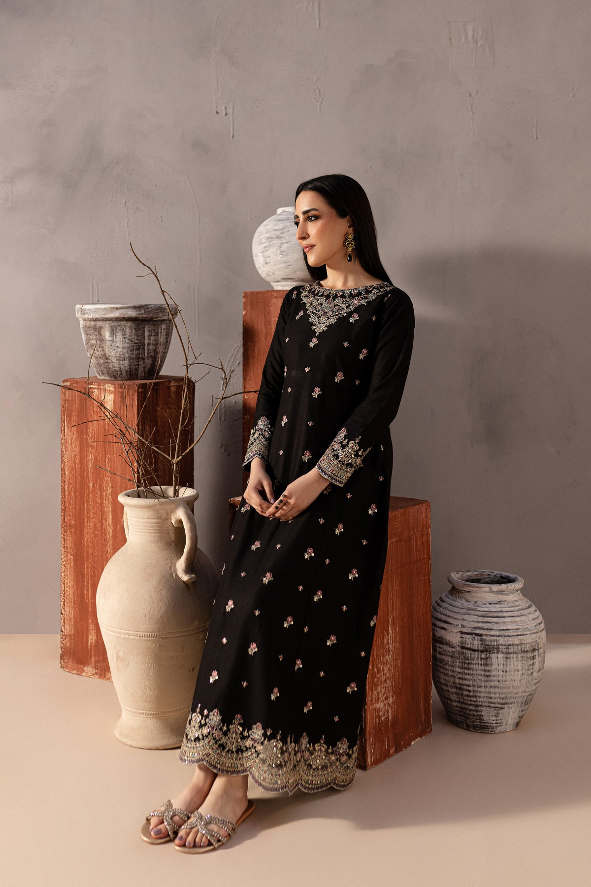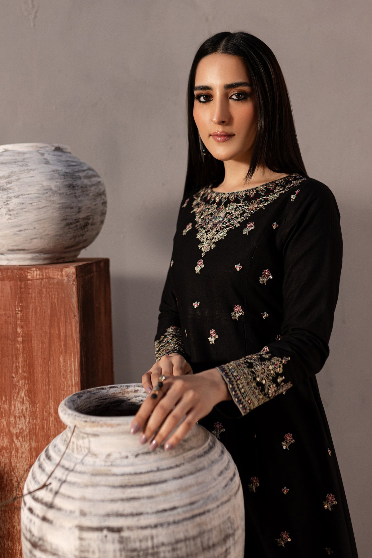 This elegant 2-piece black karandi dress features a long panelled frock, designed with a composed neckline on the yoke for a refined, polished look. The frock’s scalloped hem and sleeves add a delicate, feminine touch, creating a perfect blend of modern sophistication and classic style.