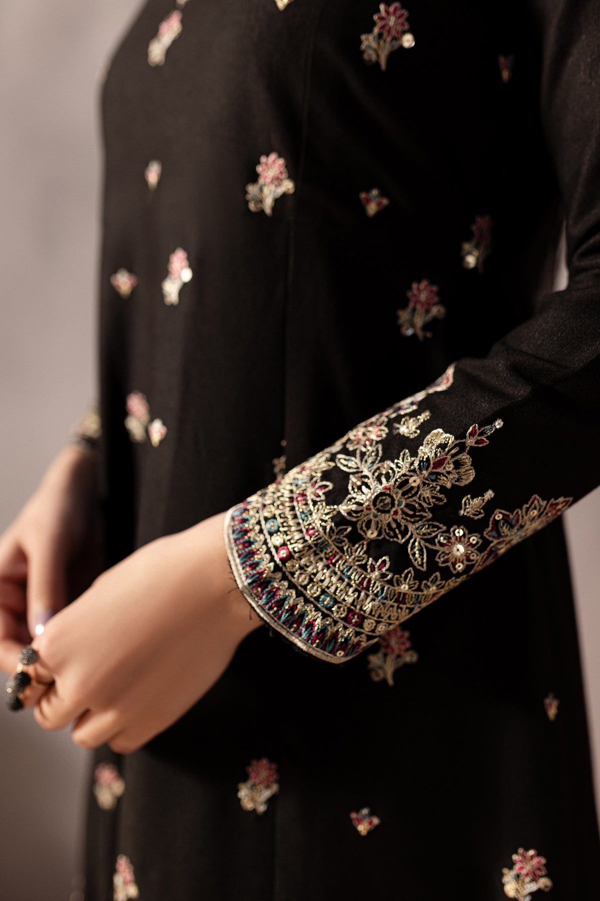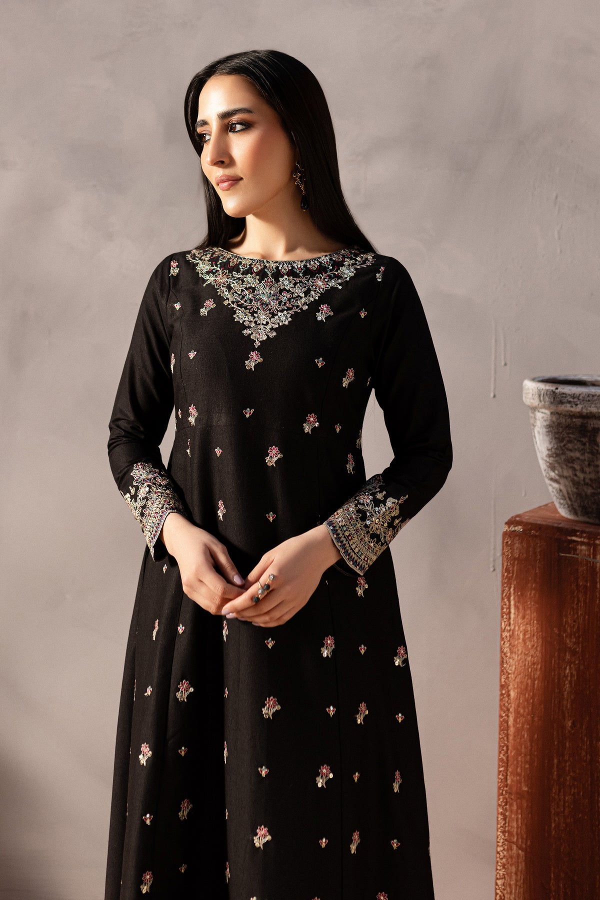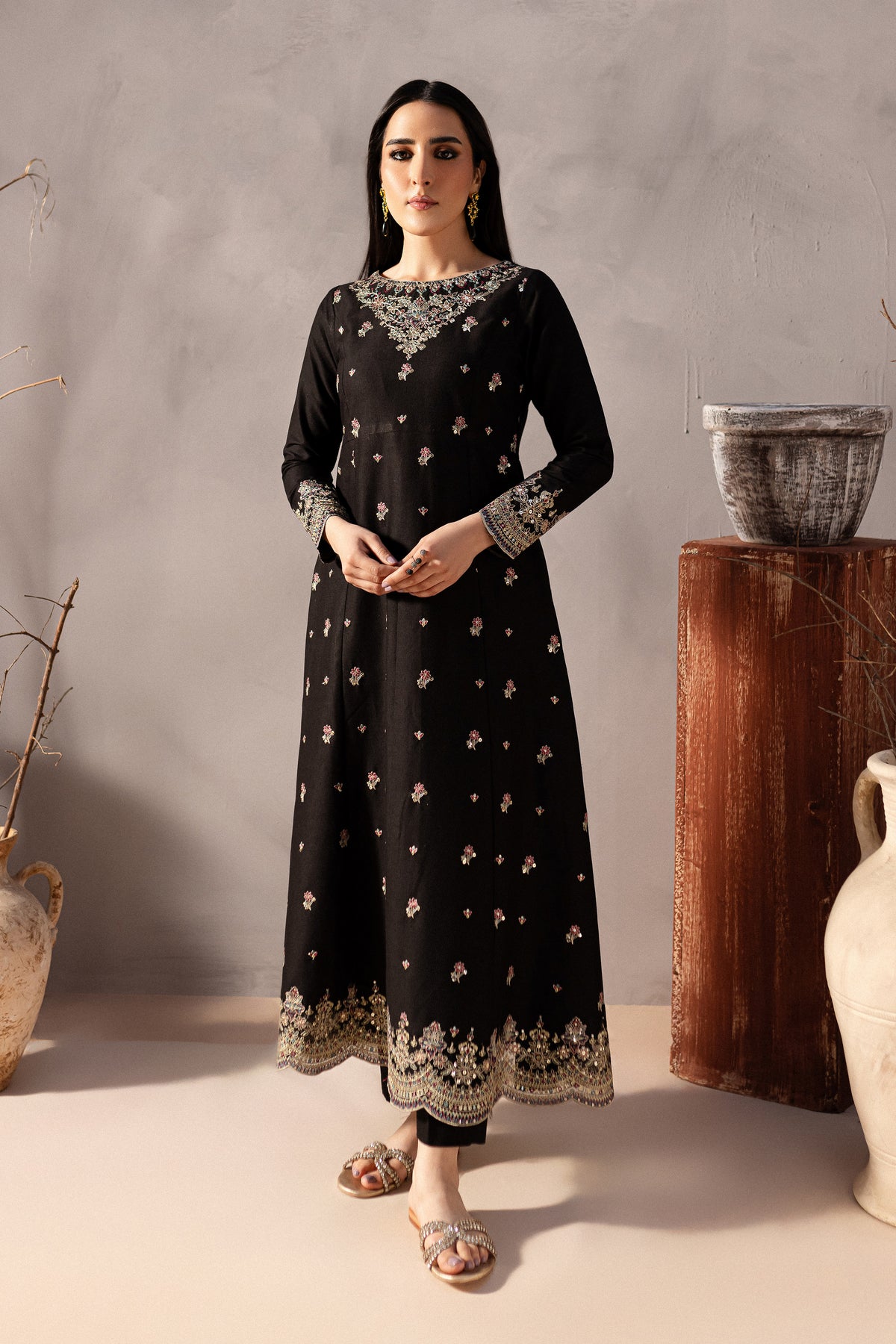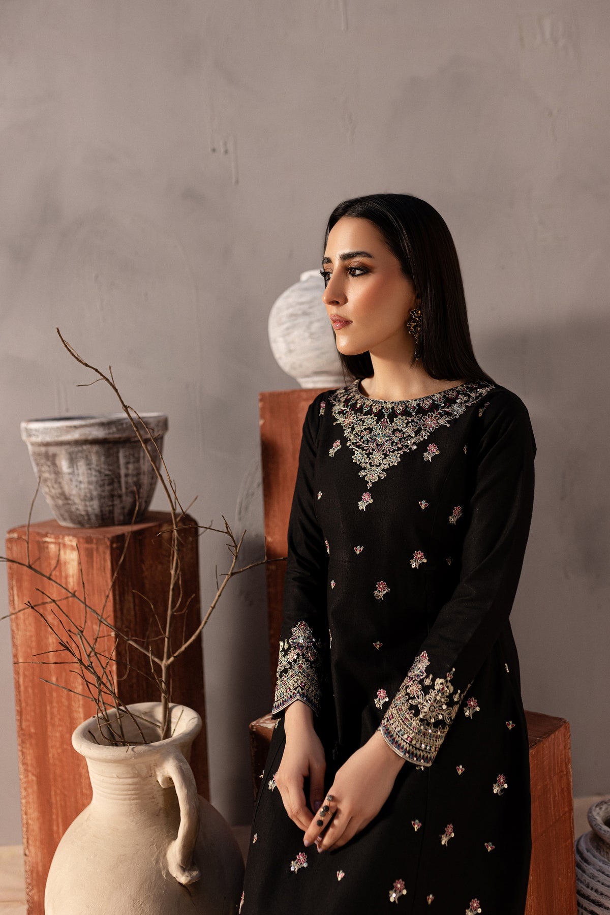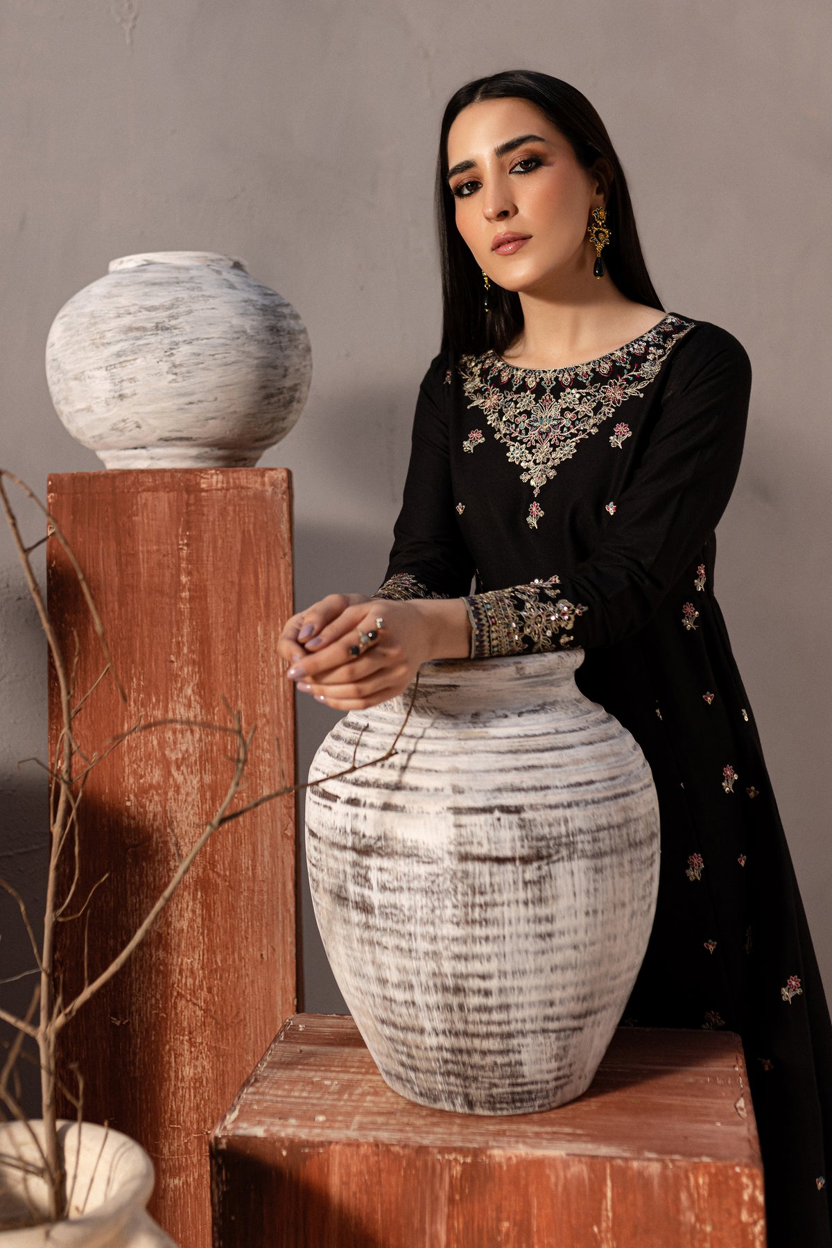 This elegant 2-piece black karandi dress features a long panelled frock, designed with a composed neckline on the yoke for a refined, polished look. The frock’s scalloped hem and sleeves add a delicate, feminine touch, creating a perfect blend of modern sophistication and classic style.