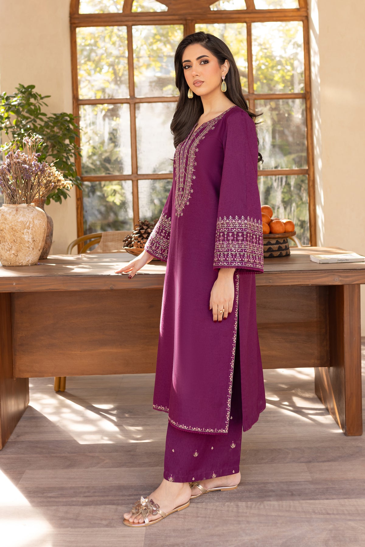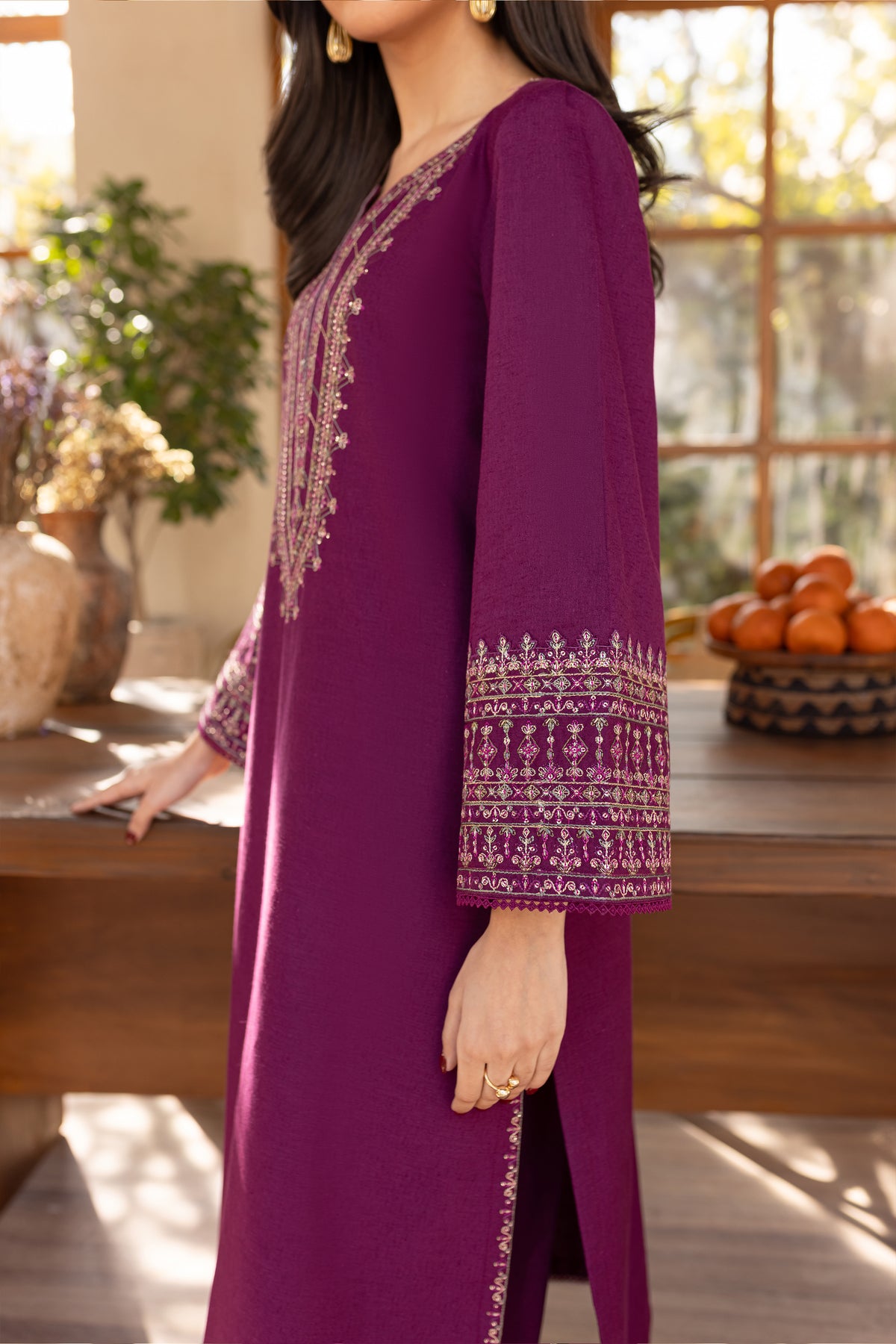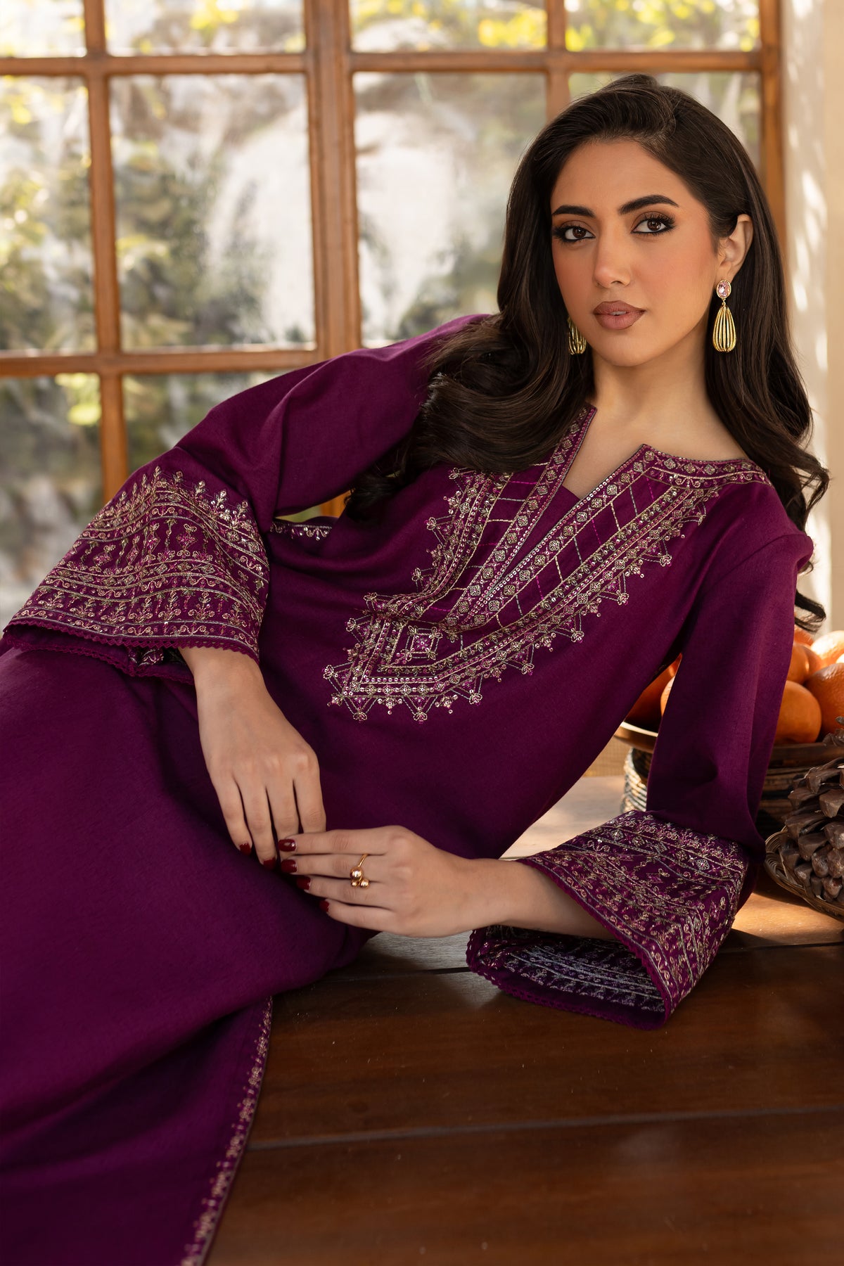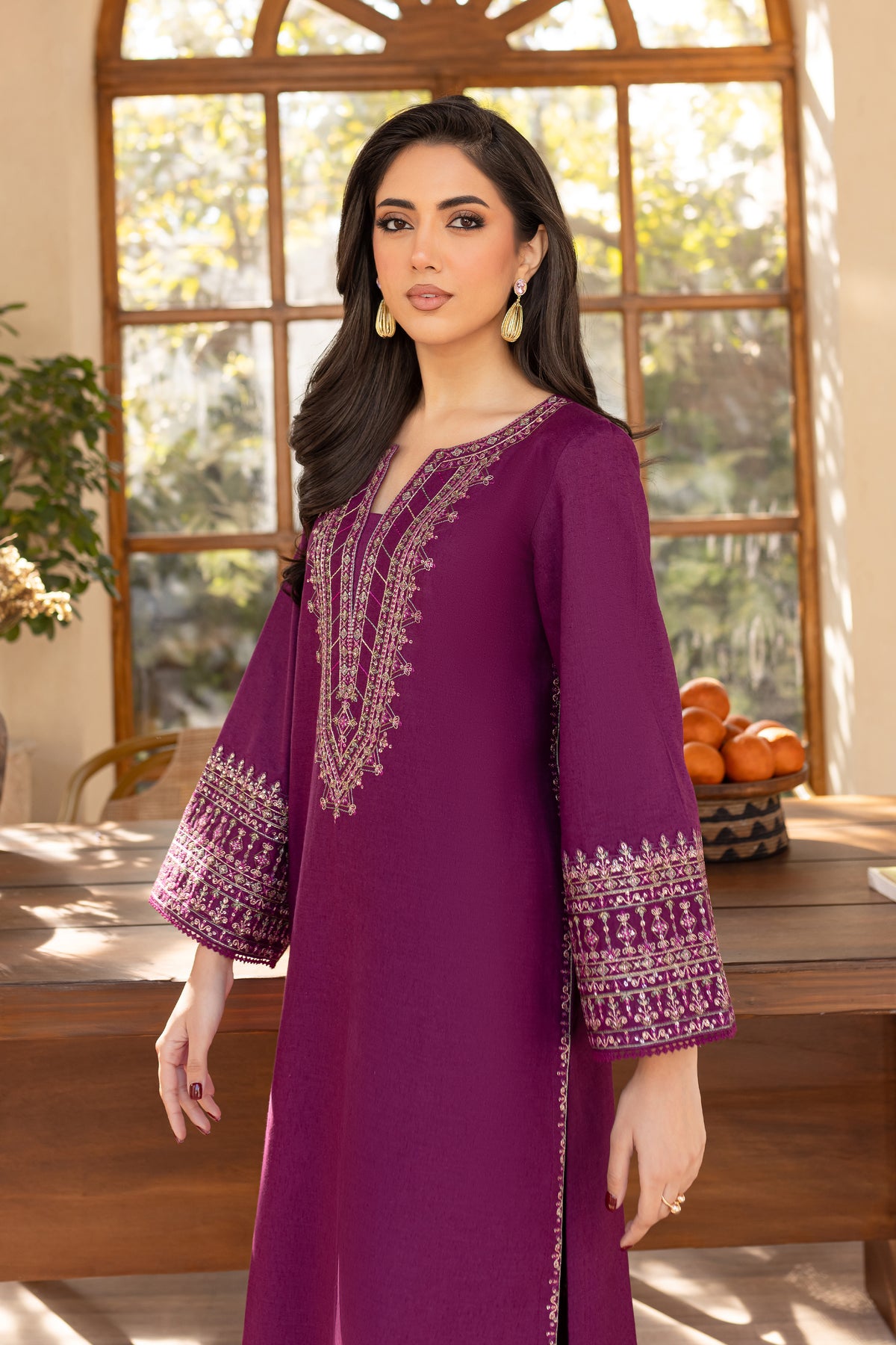 This sophisticated purple karandi dress features a long shirt with intricate embroidery on the neckline and sleeves, showcasing exquisite craftsmanship and attention to detail. The embroidered chaaks add a traditional yet modern flair to the design, enhancing its elegance and charm.