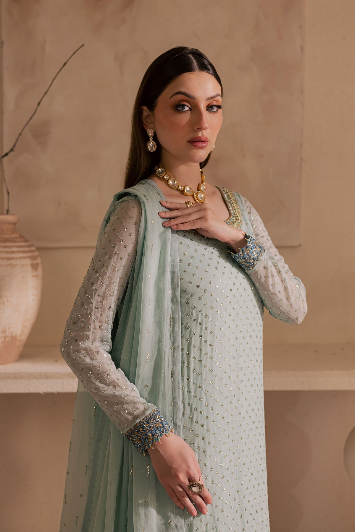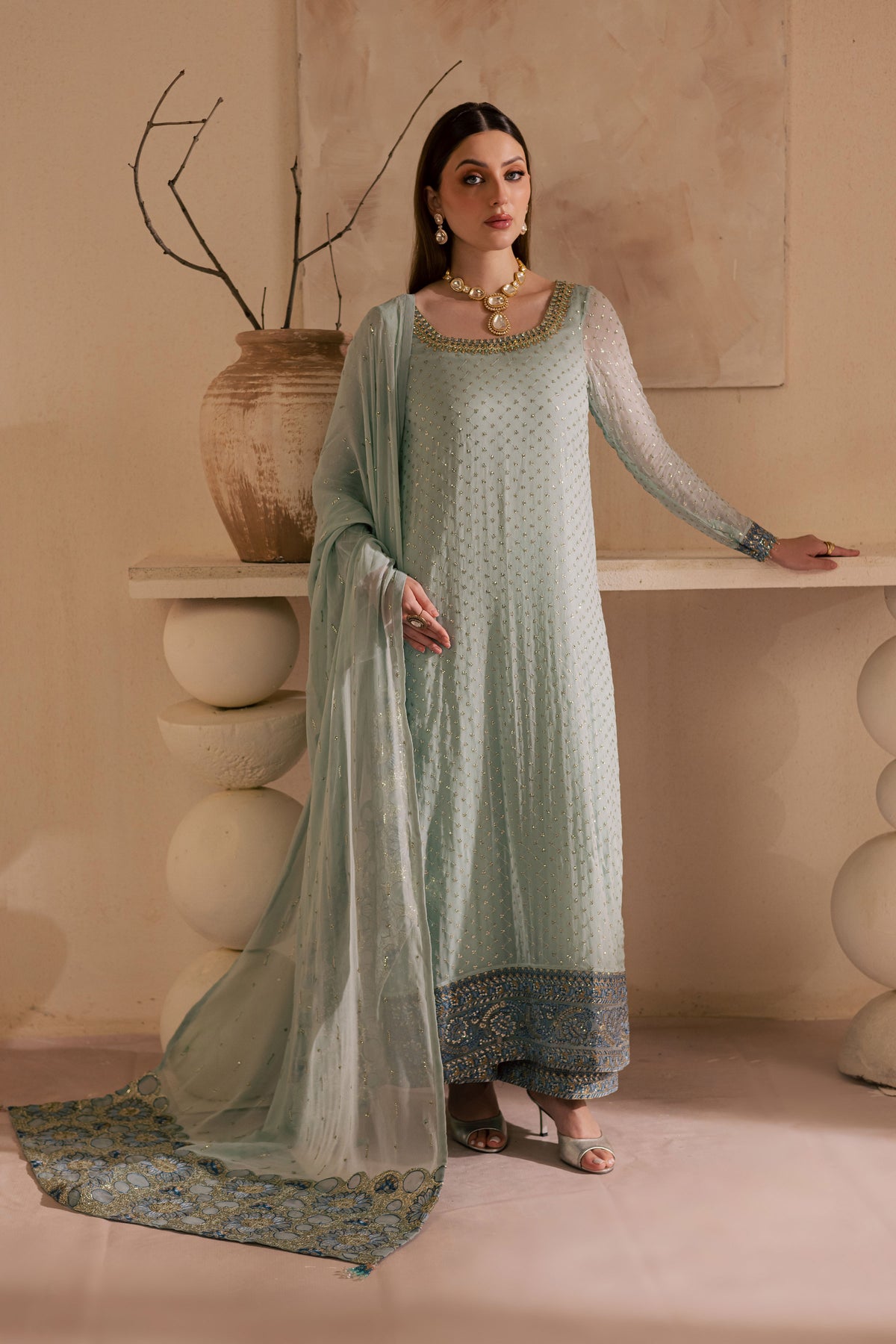 This sea blue 3-piece ensemble, Gulzaar, exudes refined elegance with its sequin-embroidered crinkle shirt. The neckline features intricate handwork, while delicate floral embroidery adorns the sleeves and shirt hem, complemented by sparkling crystals on the sleeves for a subtle shimmer that catches the eye.