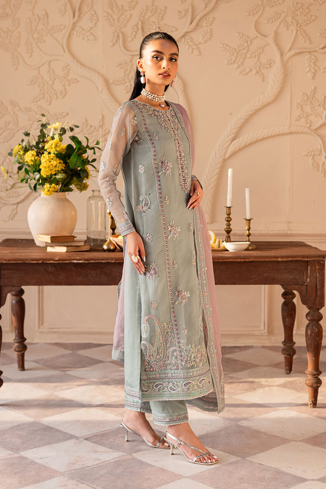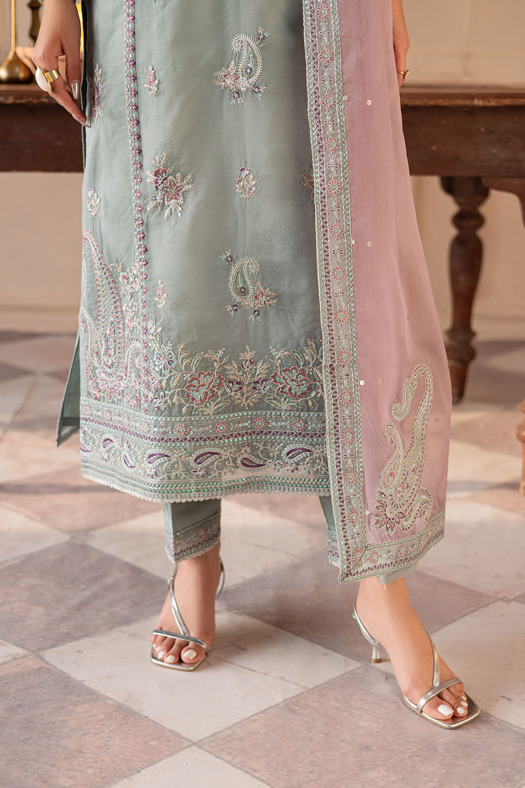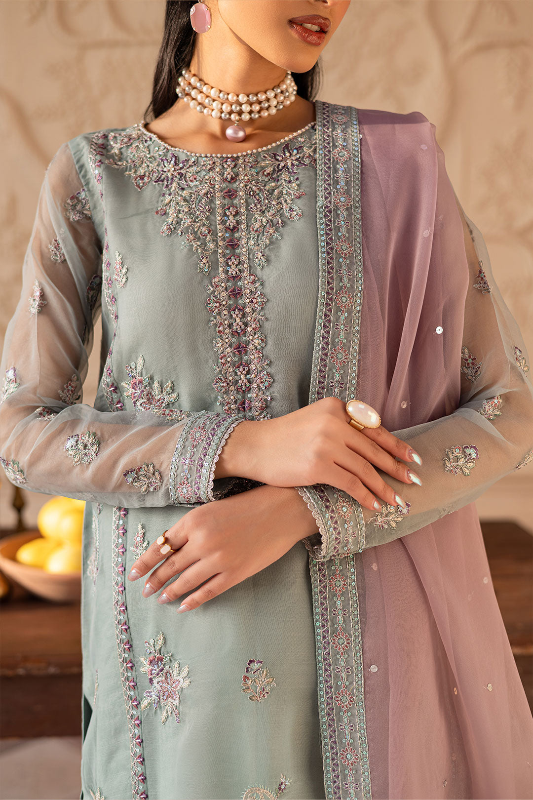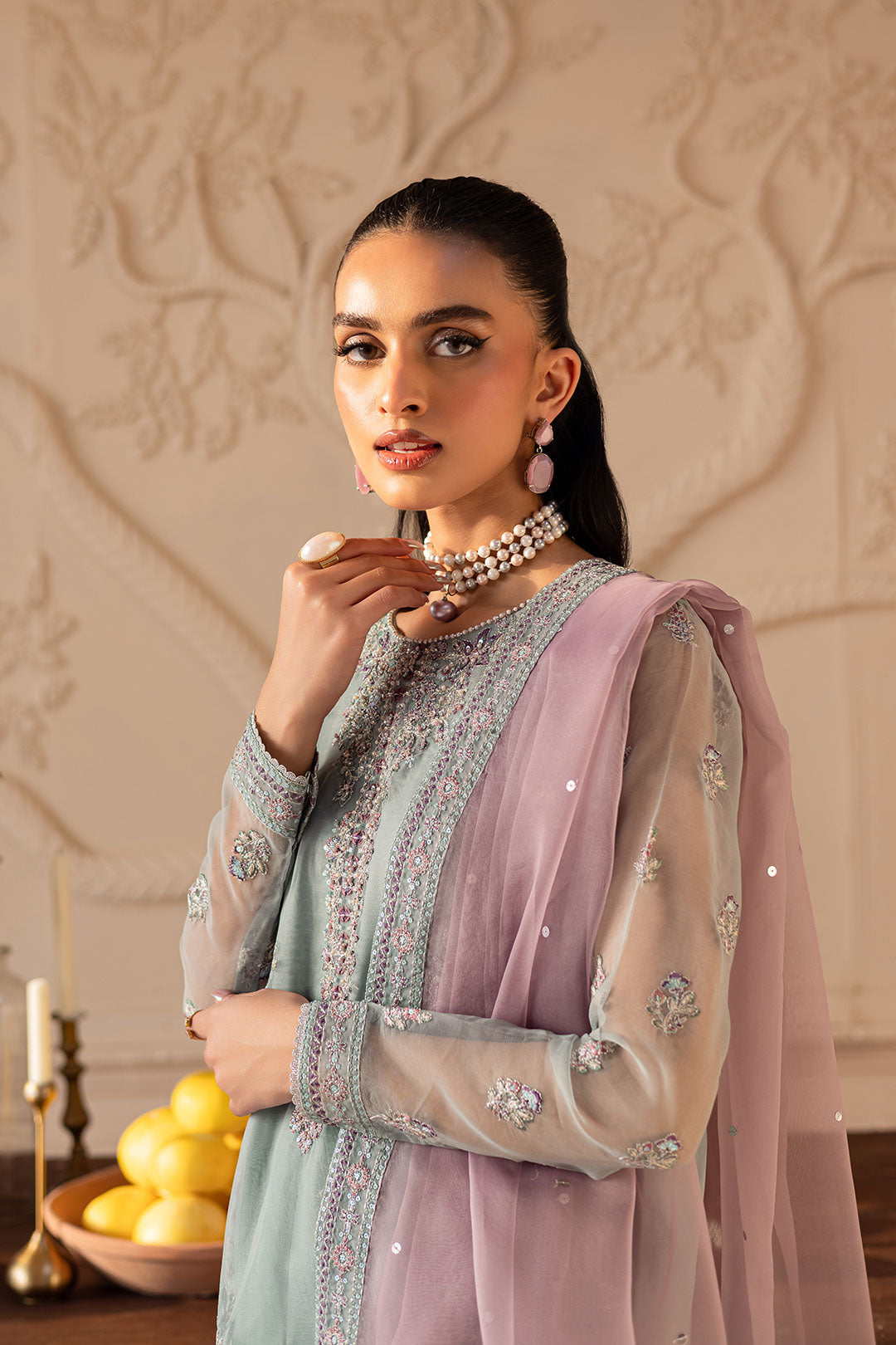 The look is completed with a contrasting organza dupatta, featuring a 4-sided border and embroidered motifs at each corner, while a minimal sequin spray adds a subtle yet captivating shimmer to the ensemble.
