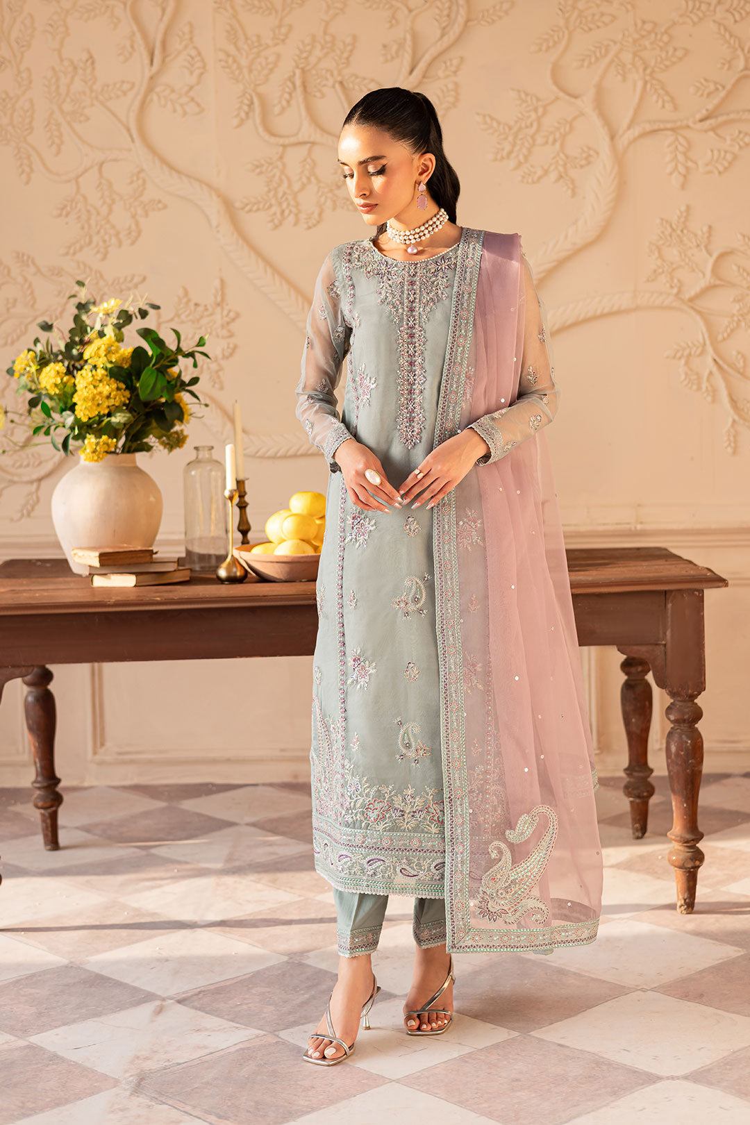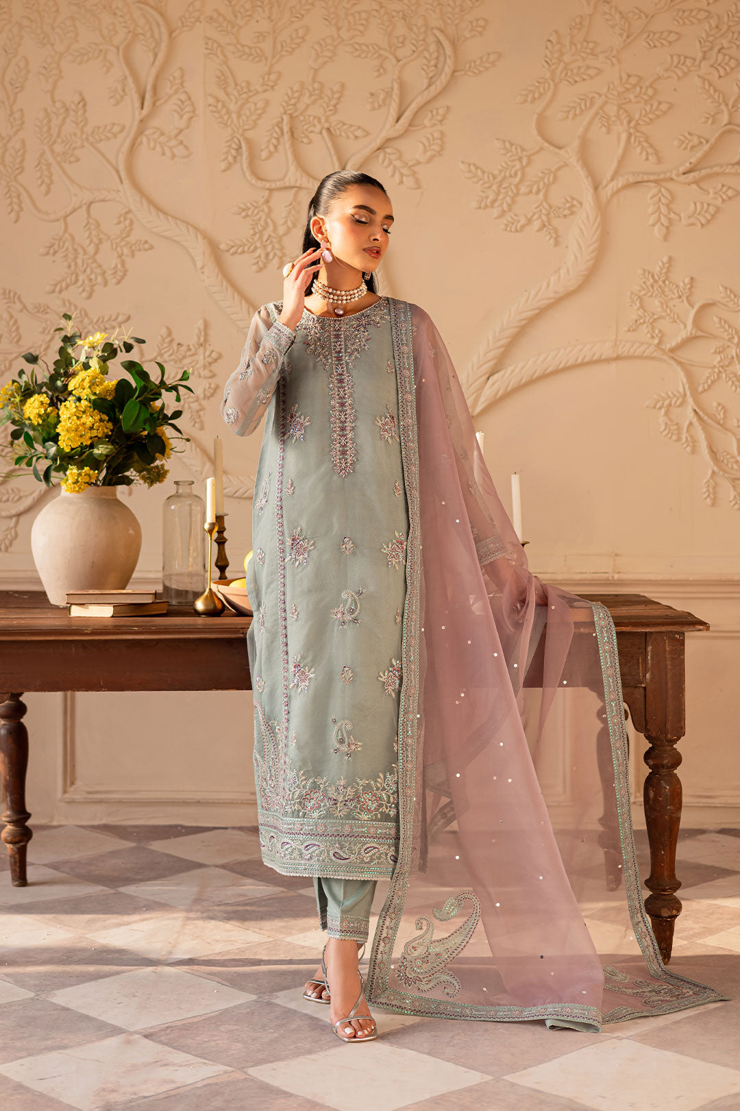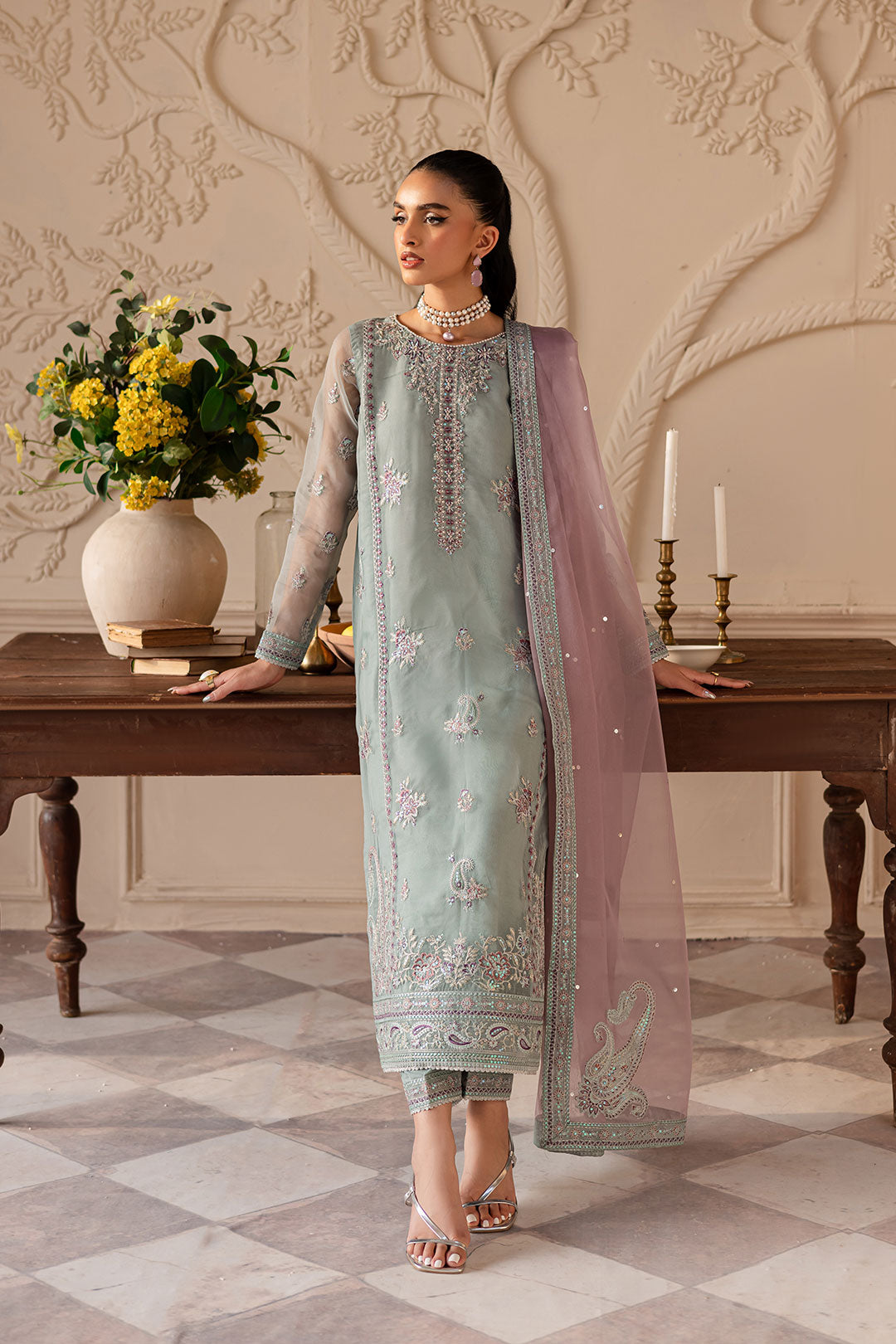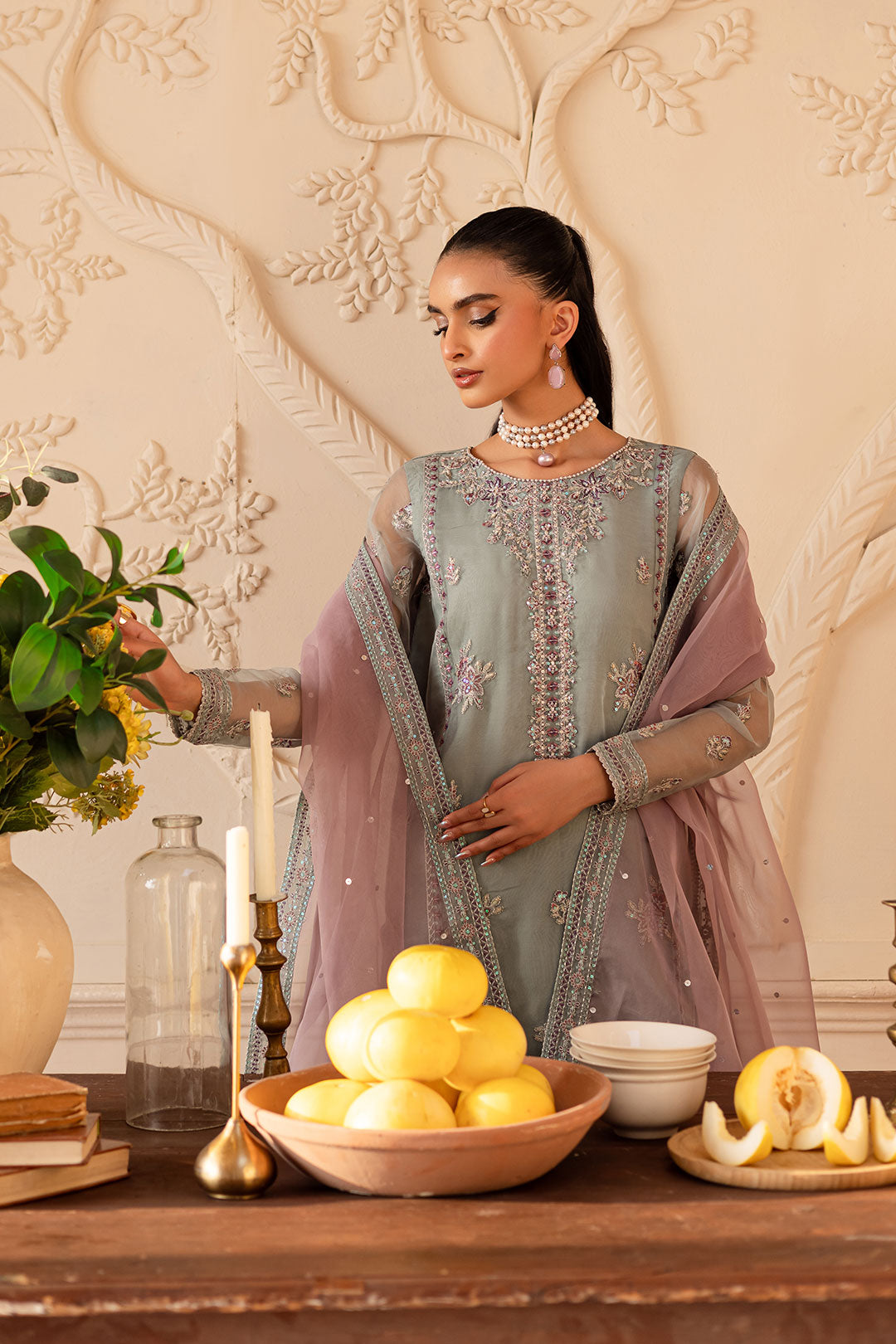 The look is completed with a contrasting organza dupatta, featuring a 4-sided border and embroidered motifs at each corner, while a minimal sequin spray adds a subtle yet captivating shimmer to the ensemble.