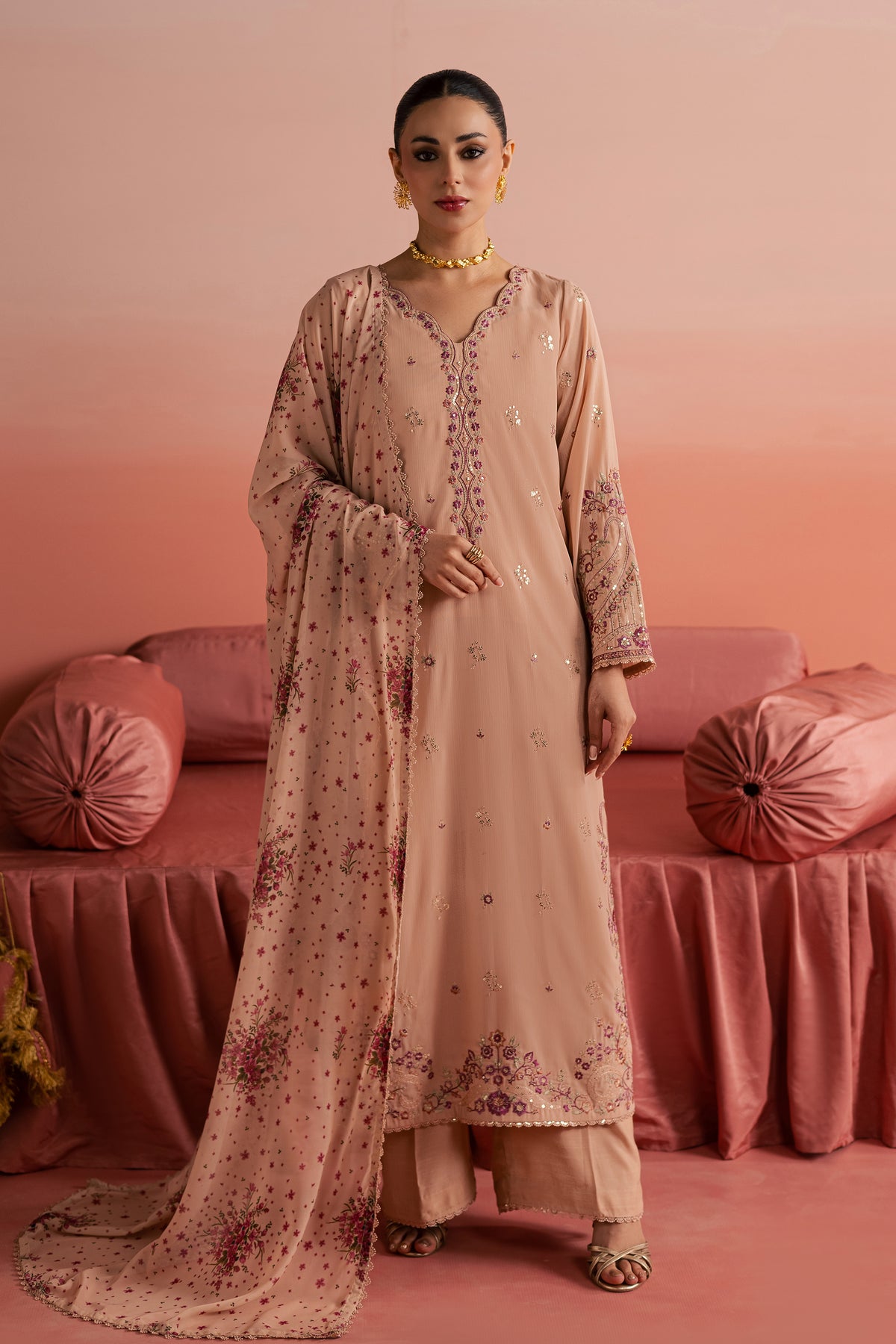 A printed chiffon dupatta completes the look, finished with lace on all four sides, adding softness and contrast to the ensemble.