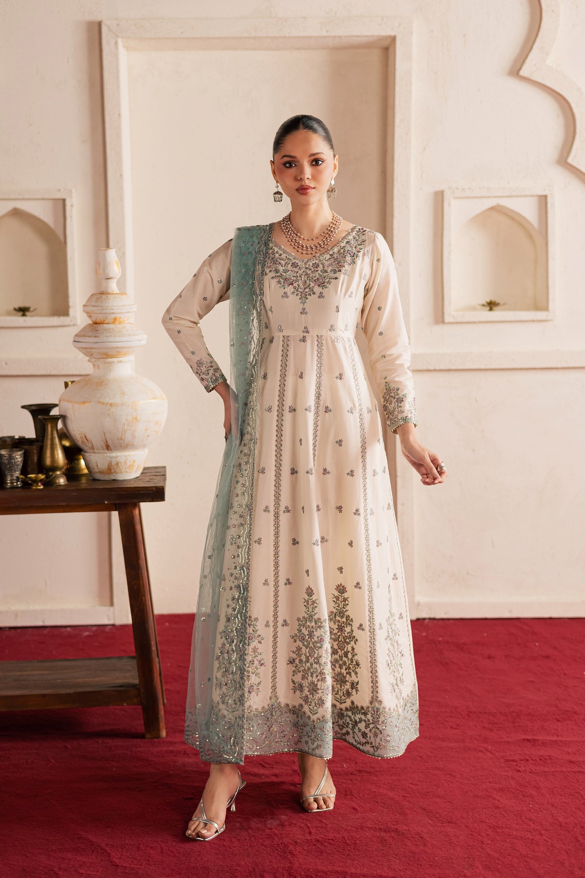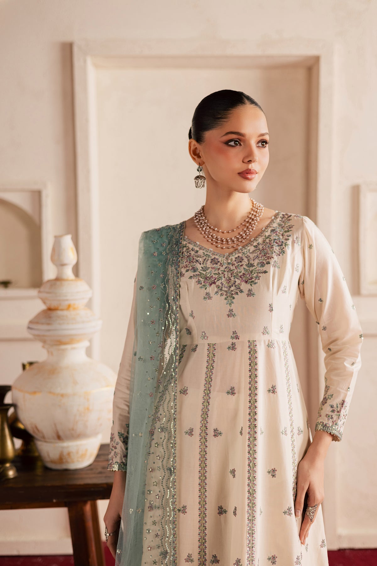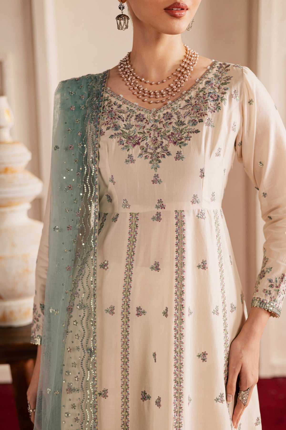 This three-piece ensemble features a paneled embroidered frock with sleeves, highlighted by a composed embroidered yoke that enhances its regal festive appeal. The hem is detailed with a contrast organza patch finished with tilla accents, while the fitted embroidered sleeves add structured elegance.