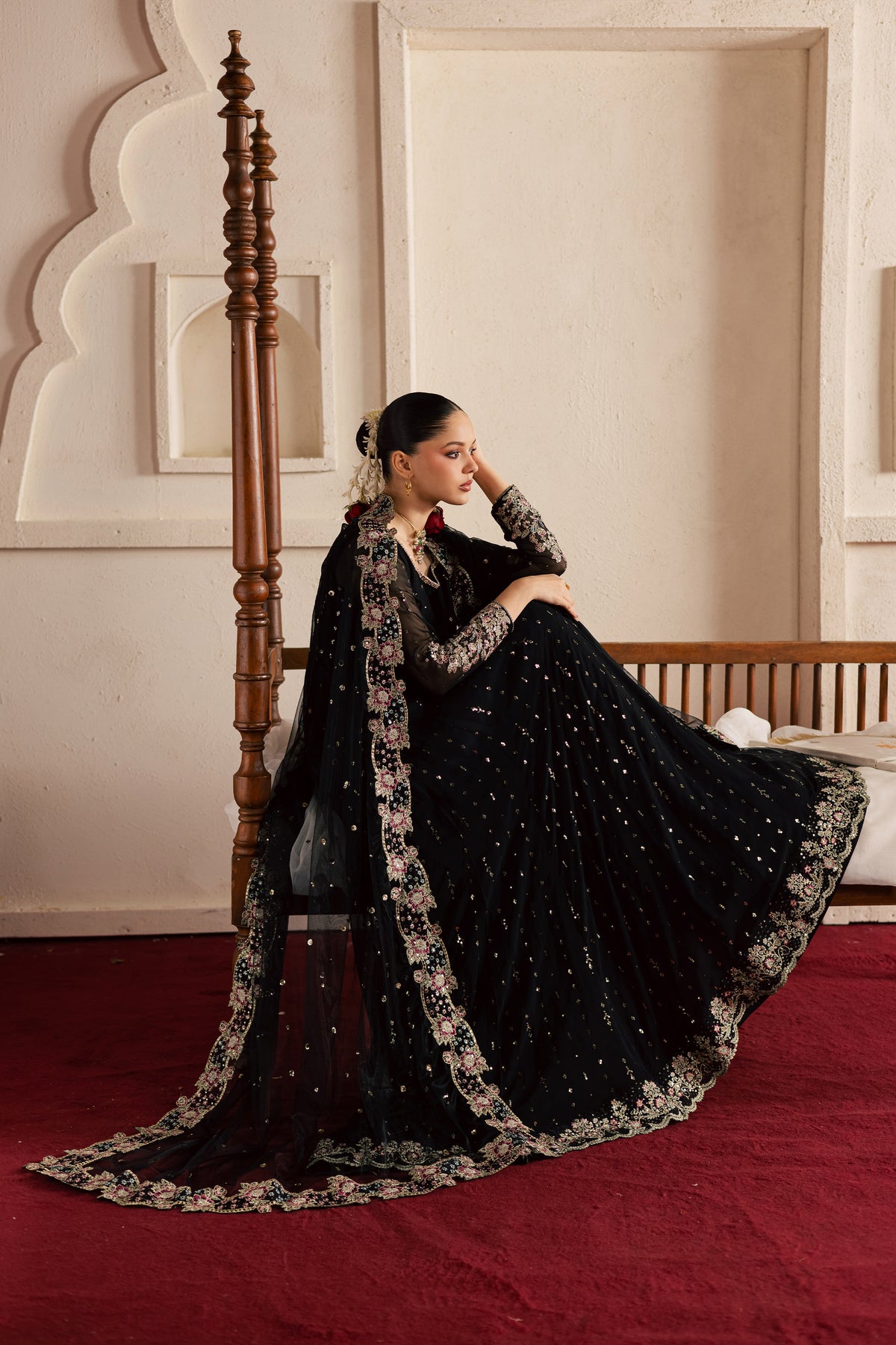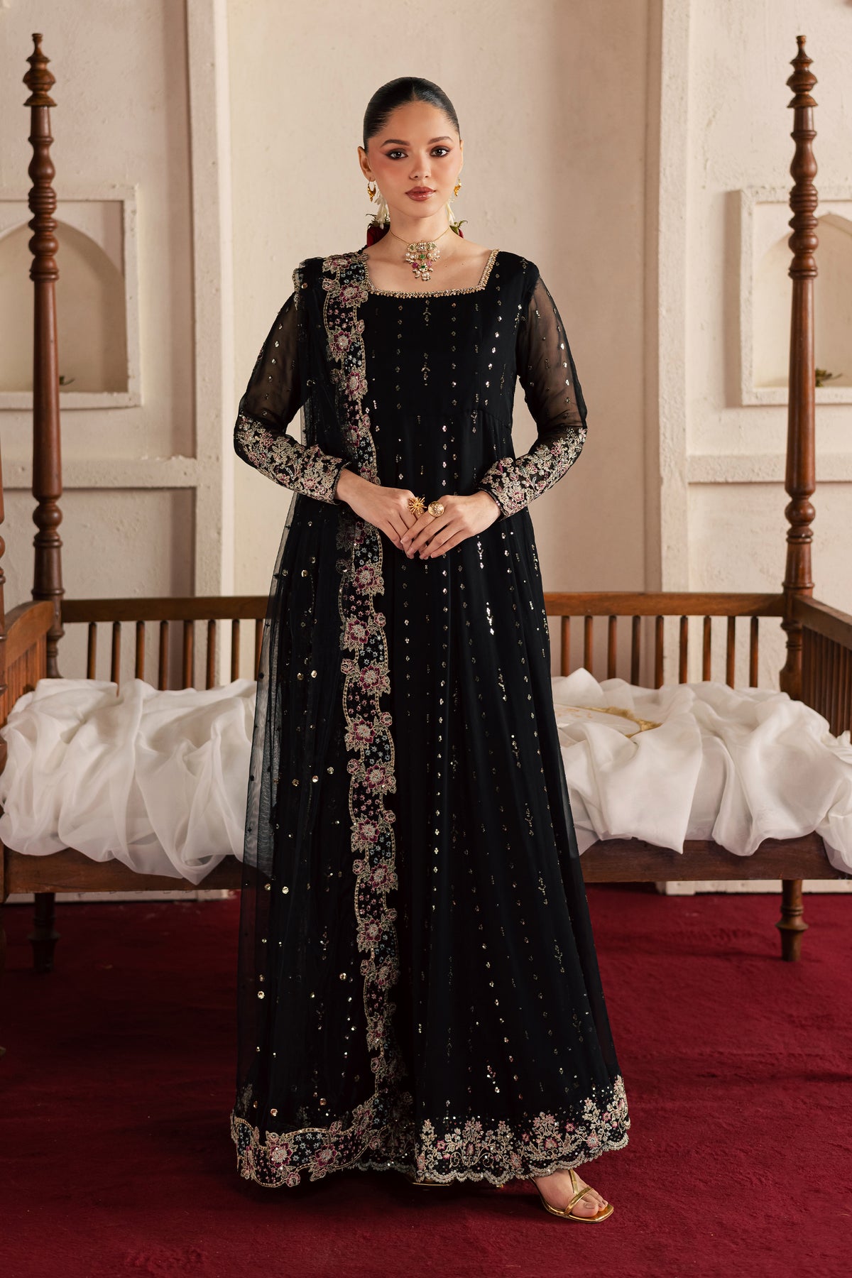 This three-piece ensemble features a long embroidered black frock with sleeves, adorned with an all-over sequin spread that creates luminous festive impact. The structured yoke is tailored with precise dart detailing, while the hem is finished with an embroidered scalloped border for elegant definition. Fitted long sleeves feature composed embroidery at the hem, enhancing the refined silhouette.