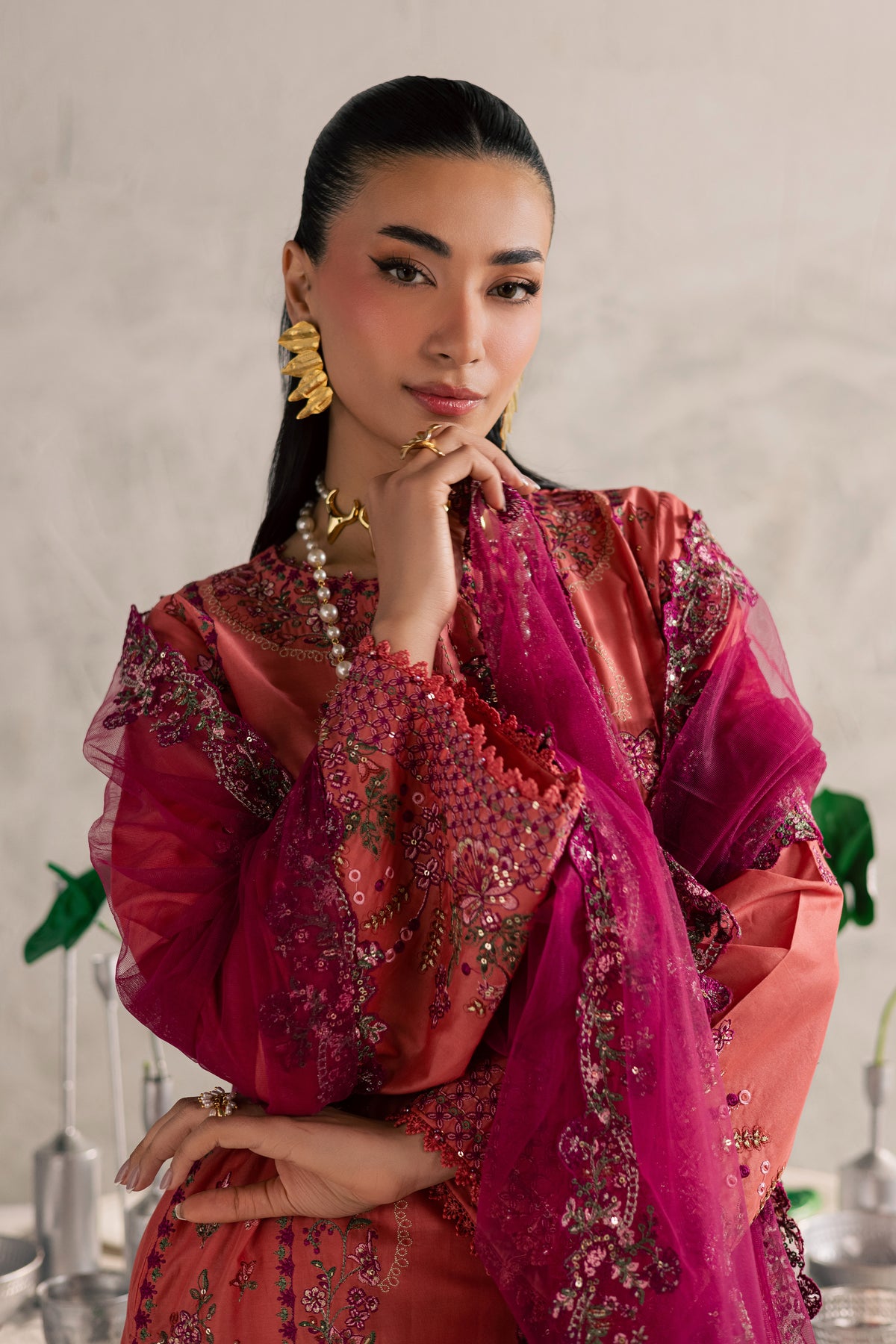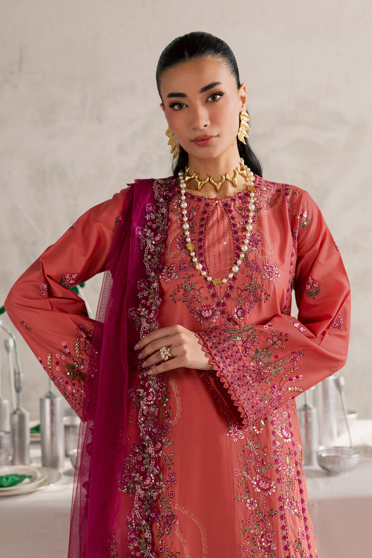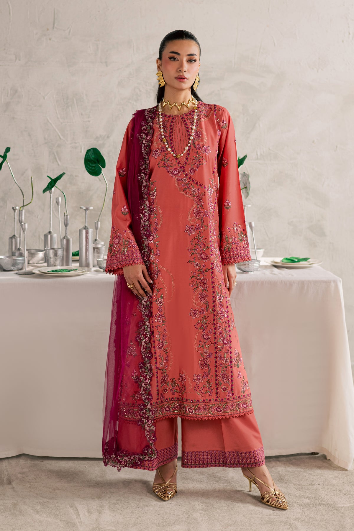 An embroidered net dupatta completes the ensemble, adding light texture and graceful movement for an elegant festive look.