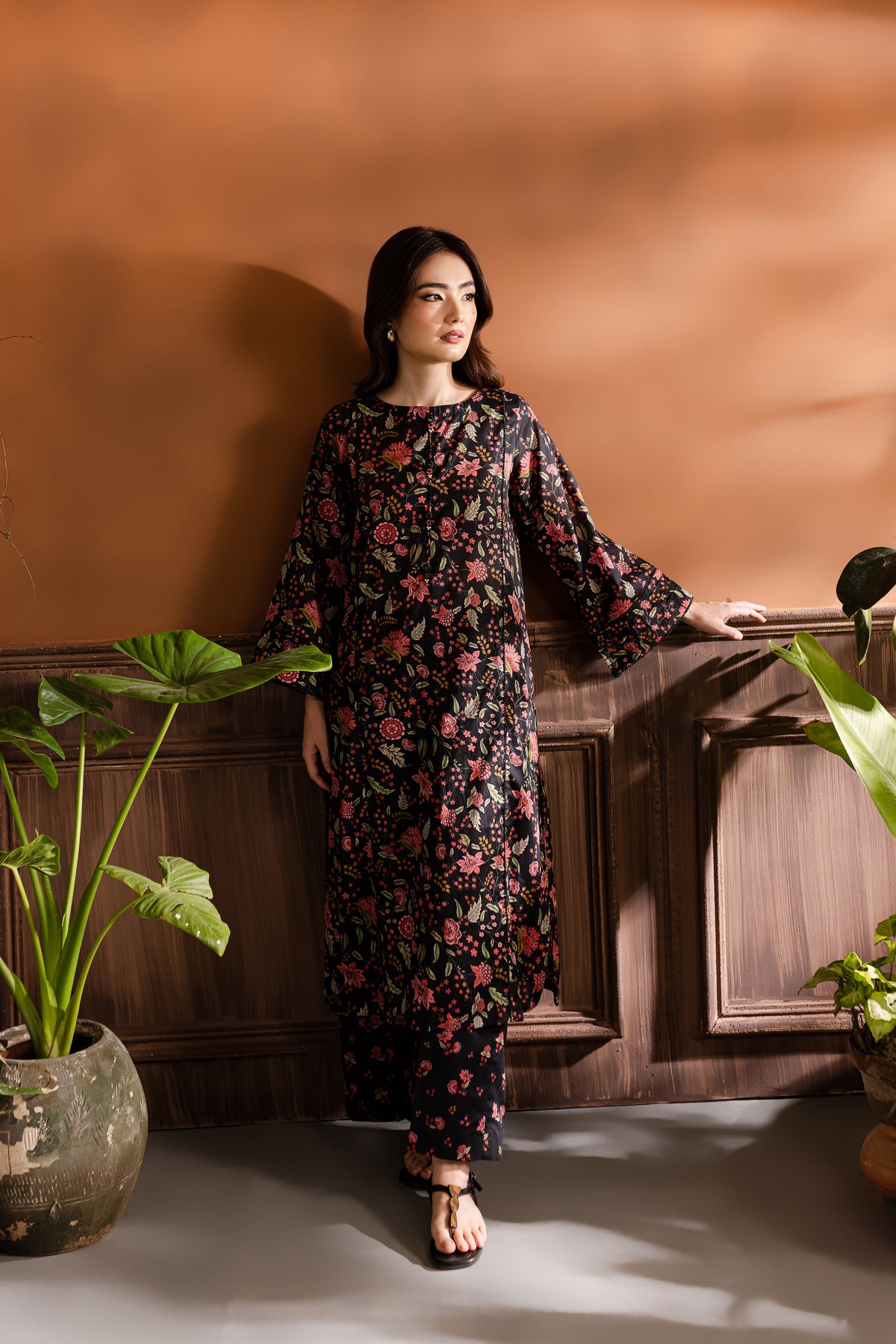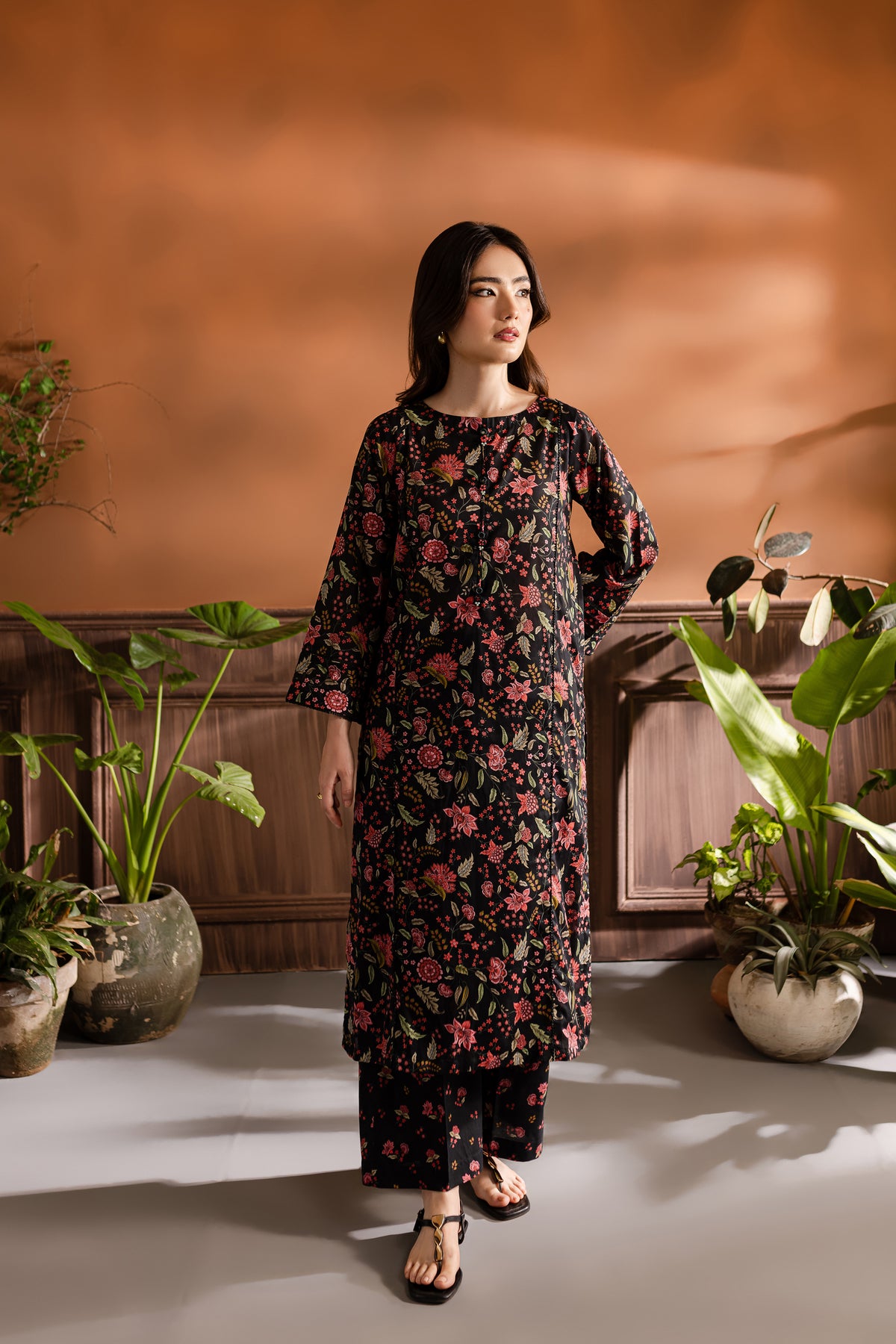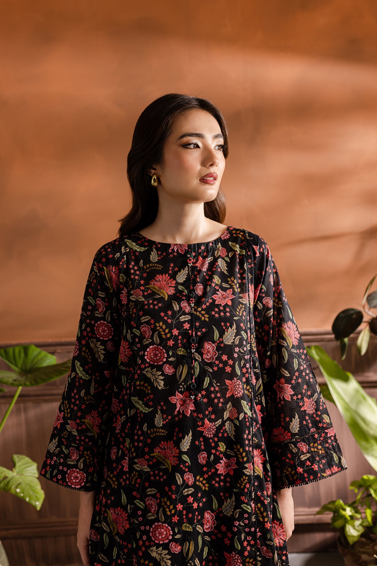 Step into the realm of refined elegance with our finest quality Pima lawn in the classic shades of black. Skillfully printed paneled shirt features beautiful embellishments at neckline – outfit is enhanced pin tucks. Striking details withhold lace finishing at the hem of sleeves.