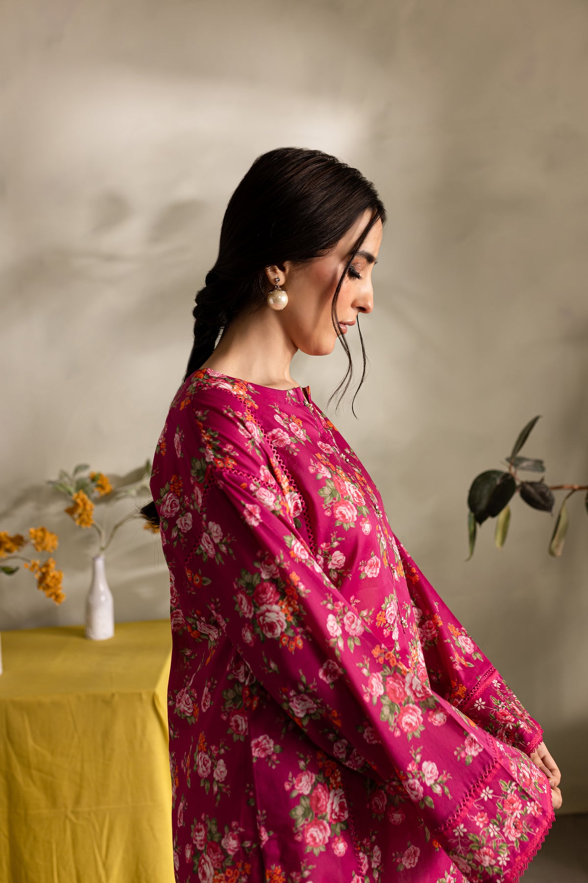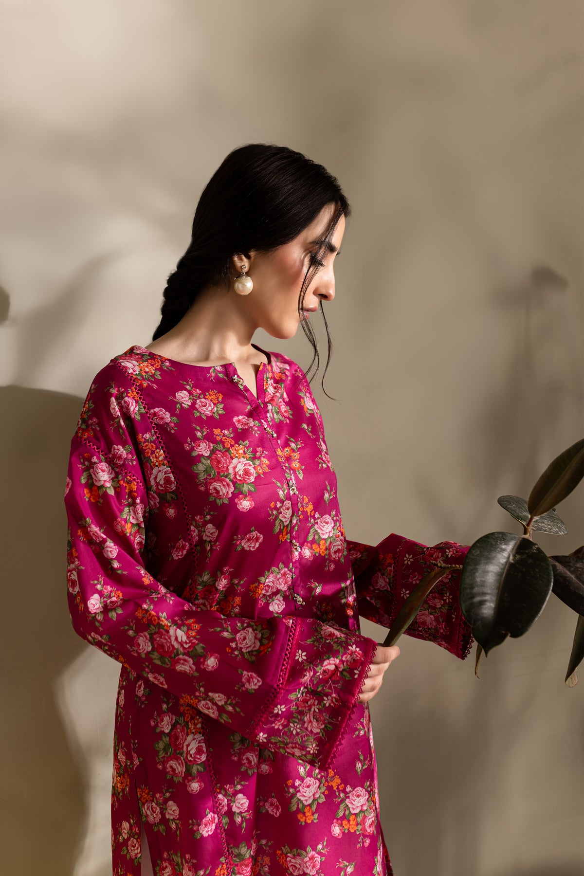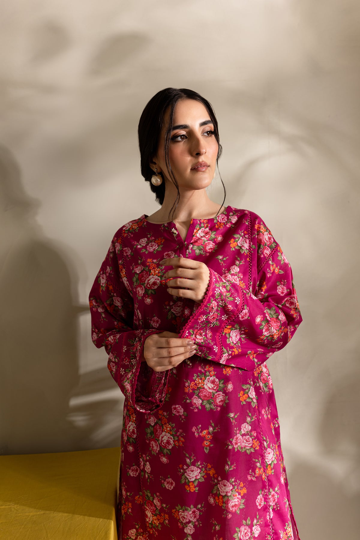 Elevate your style with this stunning pink Pima lawn ensemble. The shirt features a printed front with intricate laces at the panels and a delicate neckline collage, adding a touch of elegance and sophistication. The sleeves boast a lovely printed border at the hem, completing the charming design.