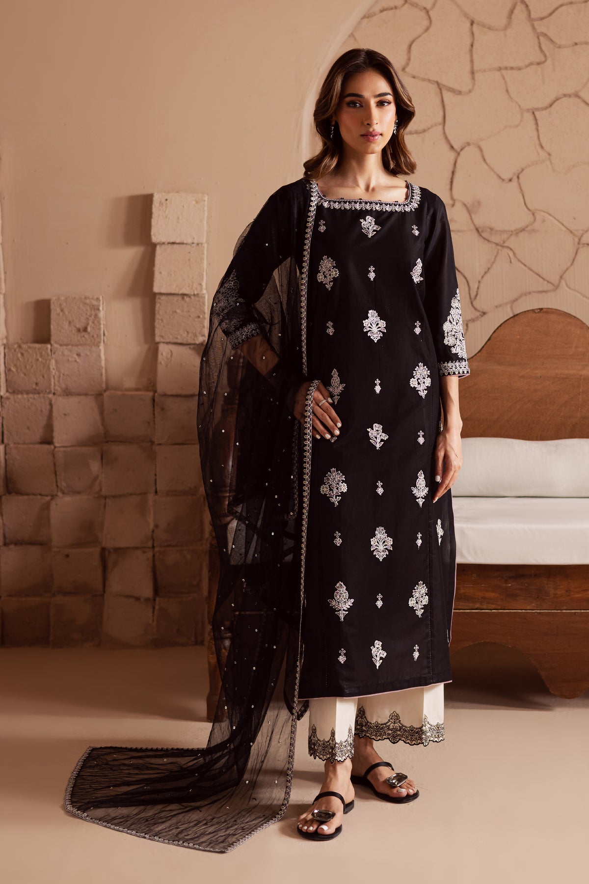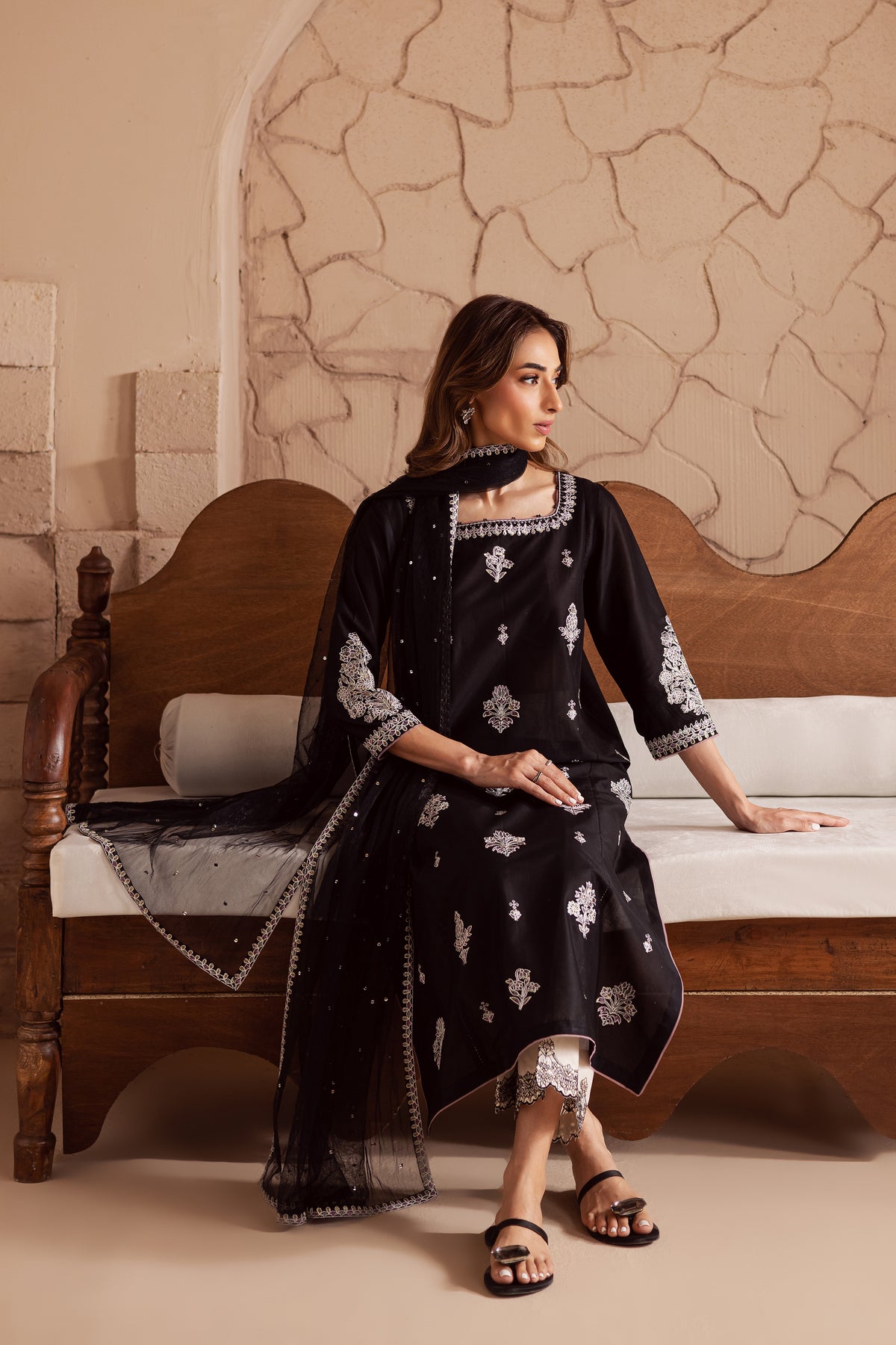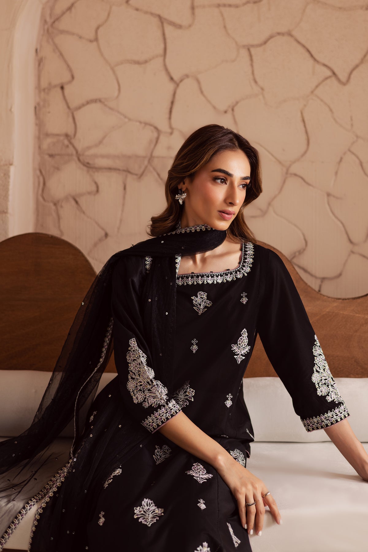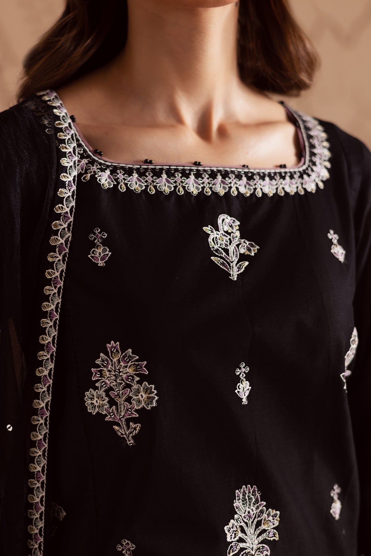 This 3-piece ensemble features a black long pima lawn shirt with a graceful boat neckline, beautifully detailed with heavily embroidered three-quarter fitted sleeves. The elegant silhouette and intricate embellishments offer a refined look, perfect for festive and formal occasions.