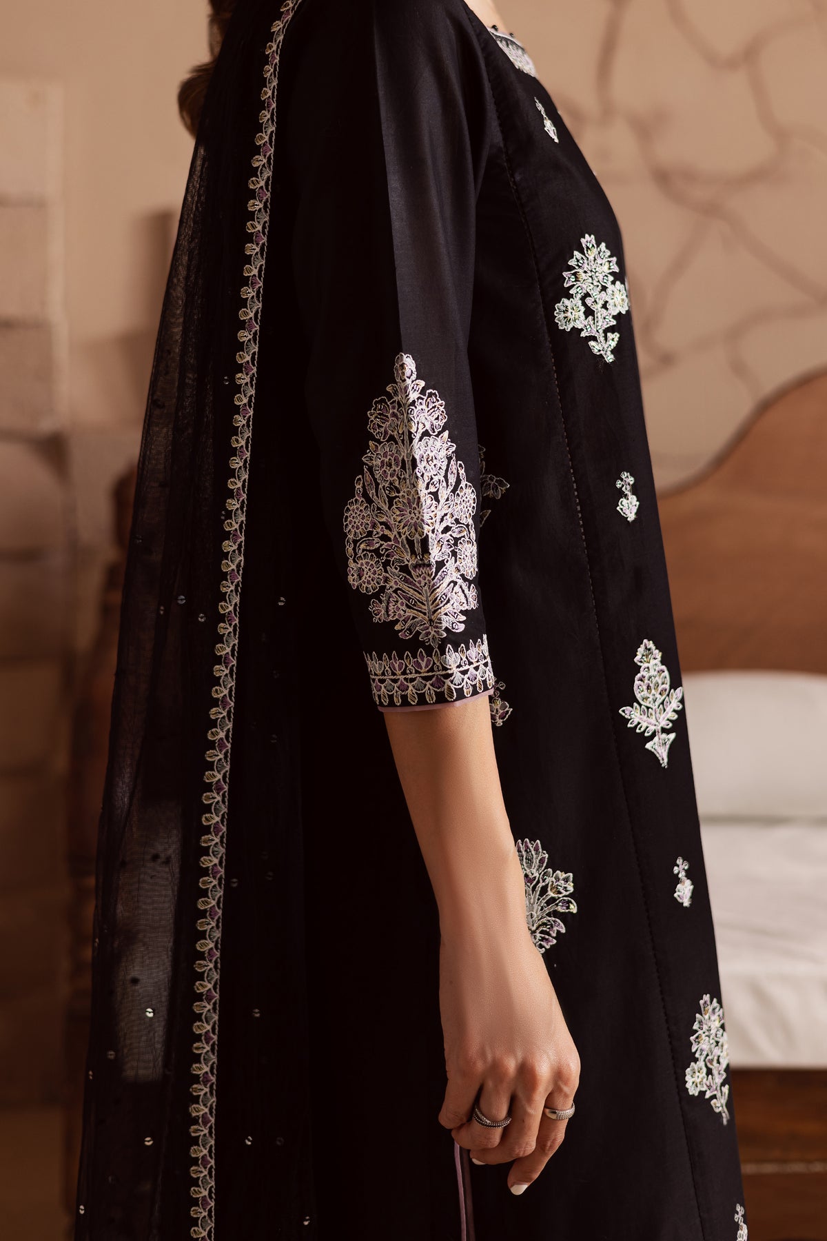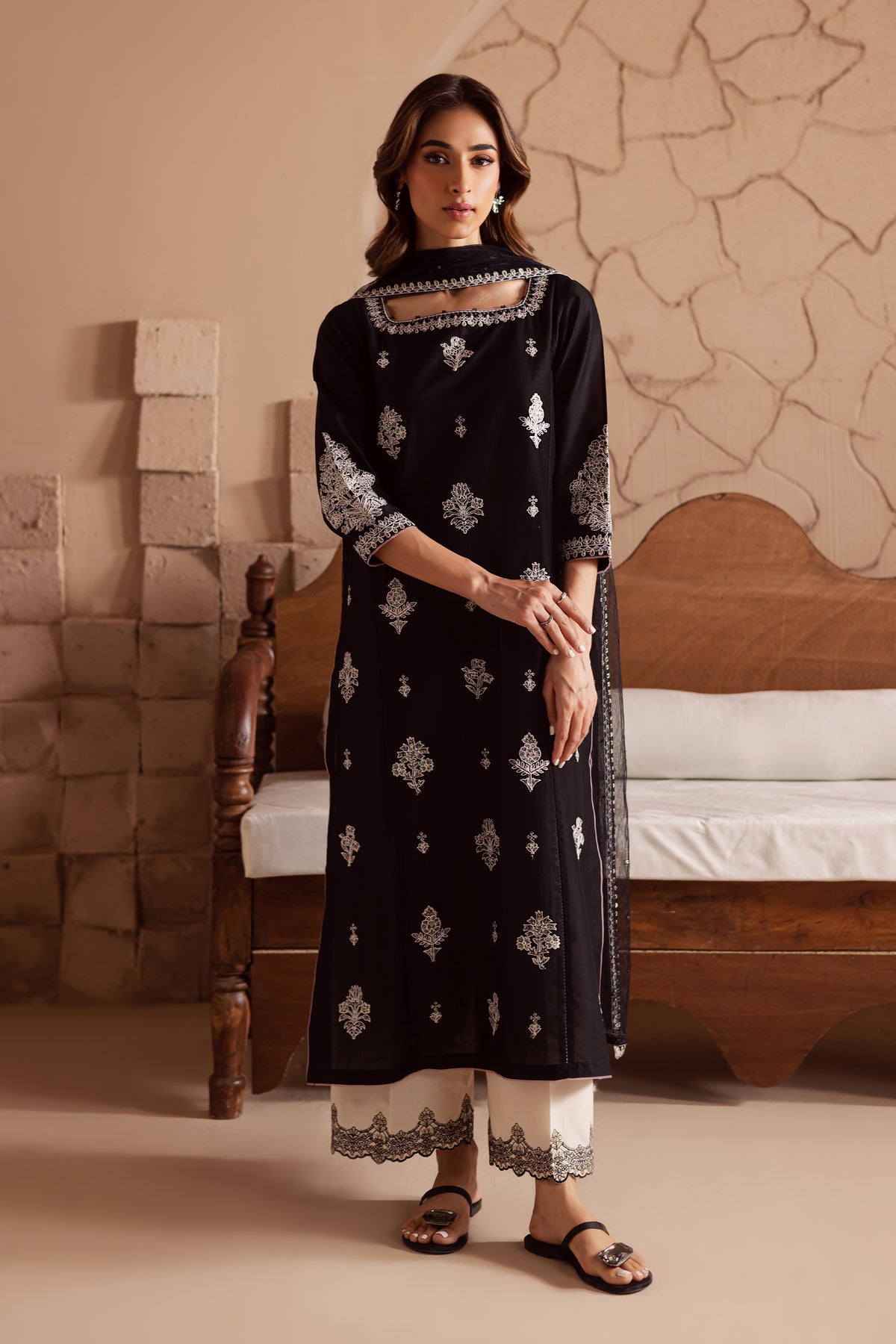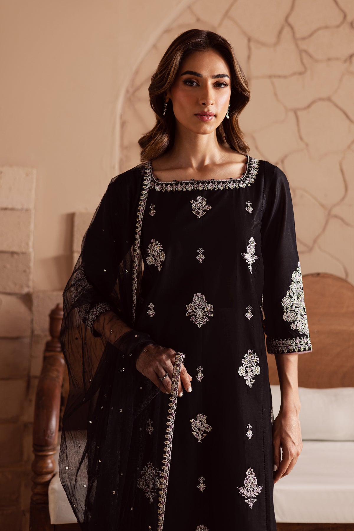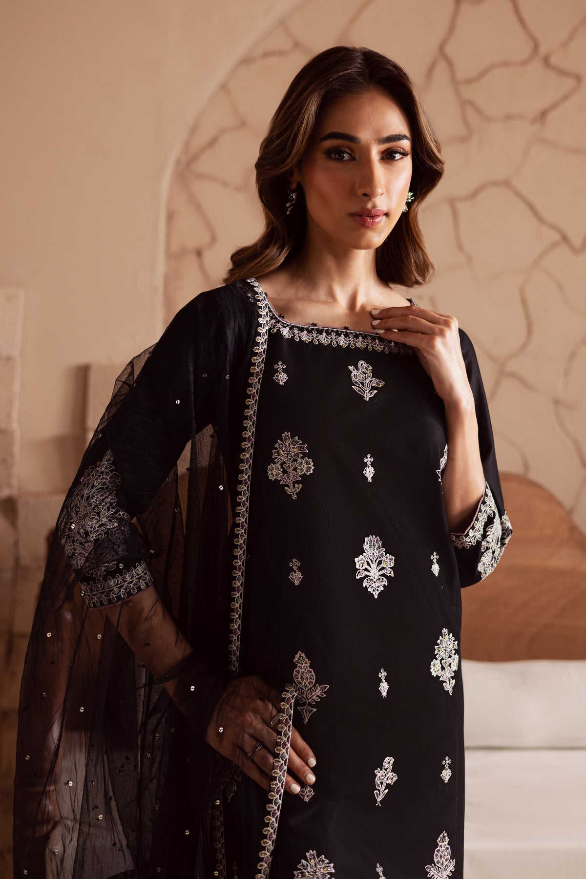 This 3-piece ensemble features a black long pima lawn shirt with a graceful boat neckline, beautifully detailed with heavily embroidered three-quarter fitted sleeves. The elegant silhouette and intricate embellishments offer a refined look, perfect for festive and formal occasions.