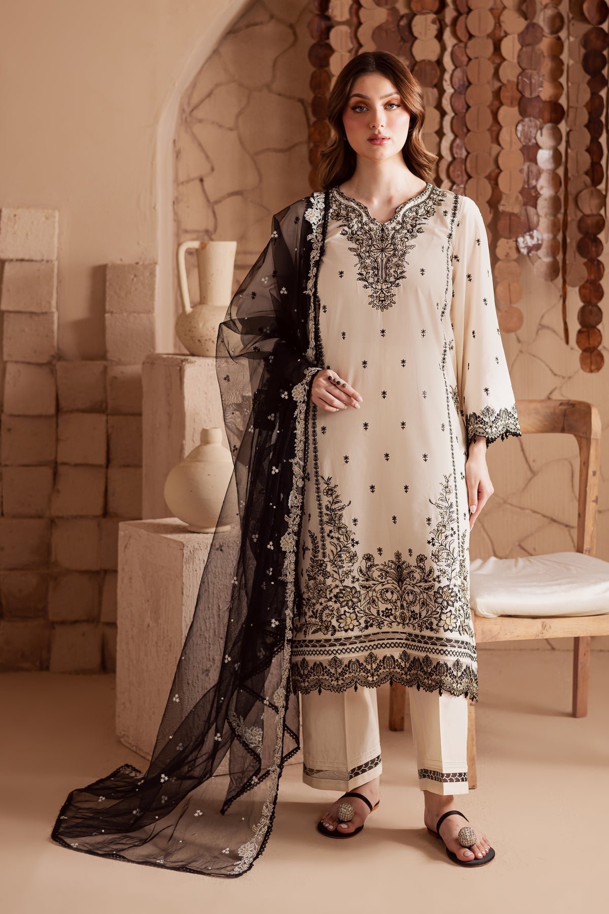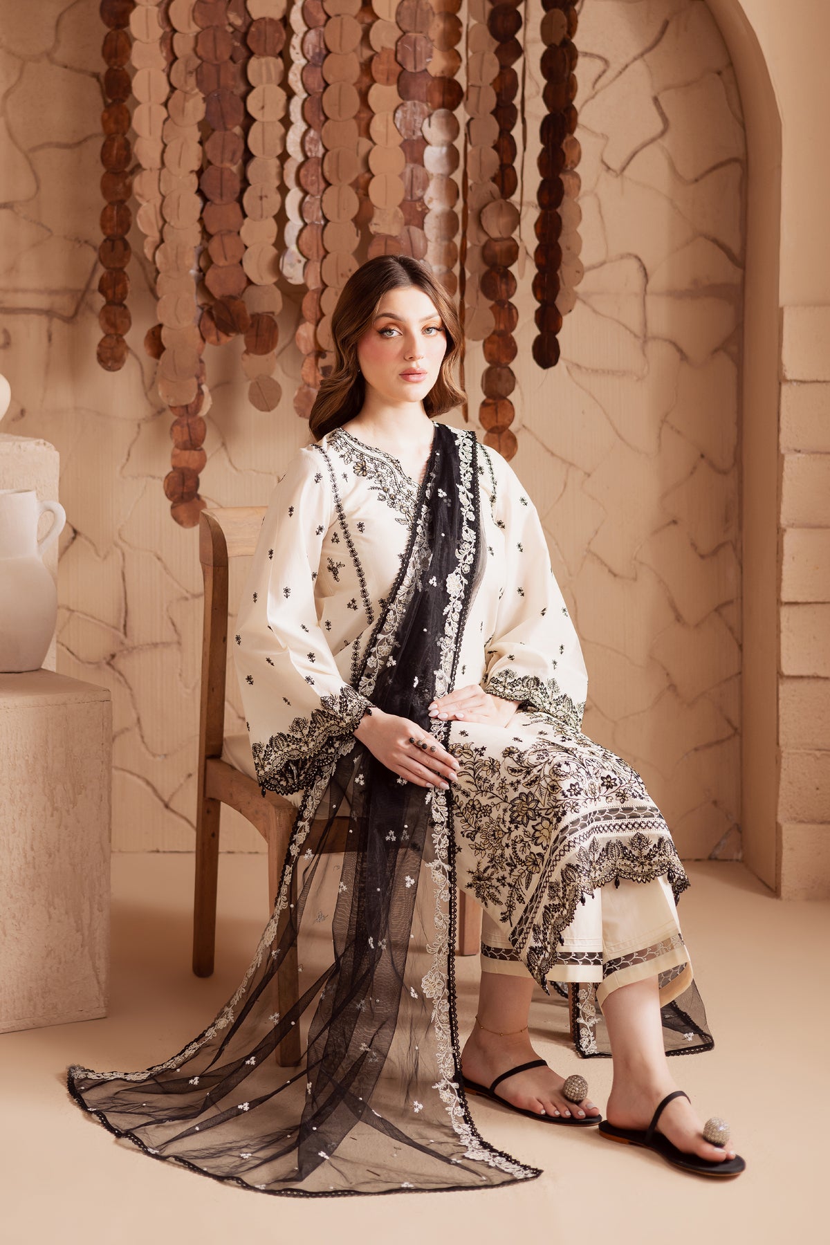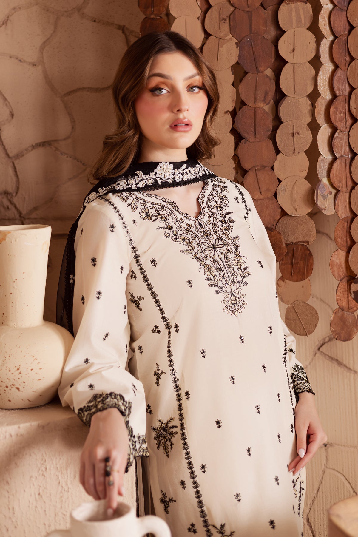 A graceful 3-piece ensemble featuring a off white long pima lawn shirt with a heavily composed embroidered hem that exudes timeless elegance. The shirt is further enhanced with an intricately embroidered neckline and delicately embroidered sleeves, adding texture and richness to the overall silhouette.