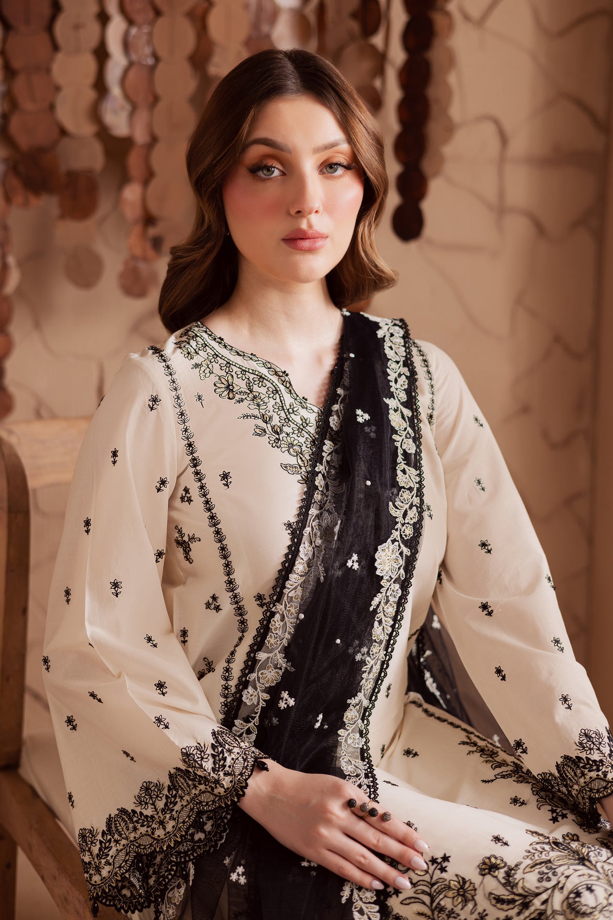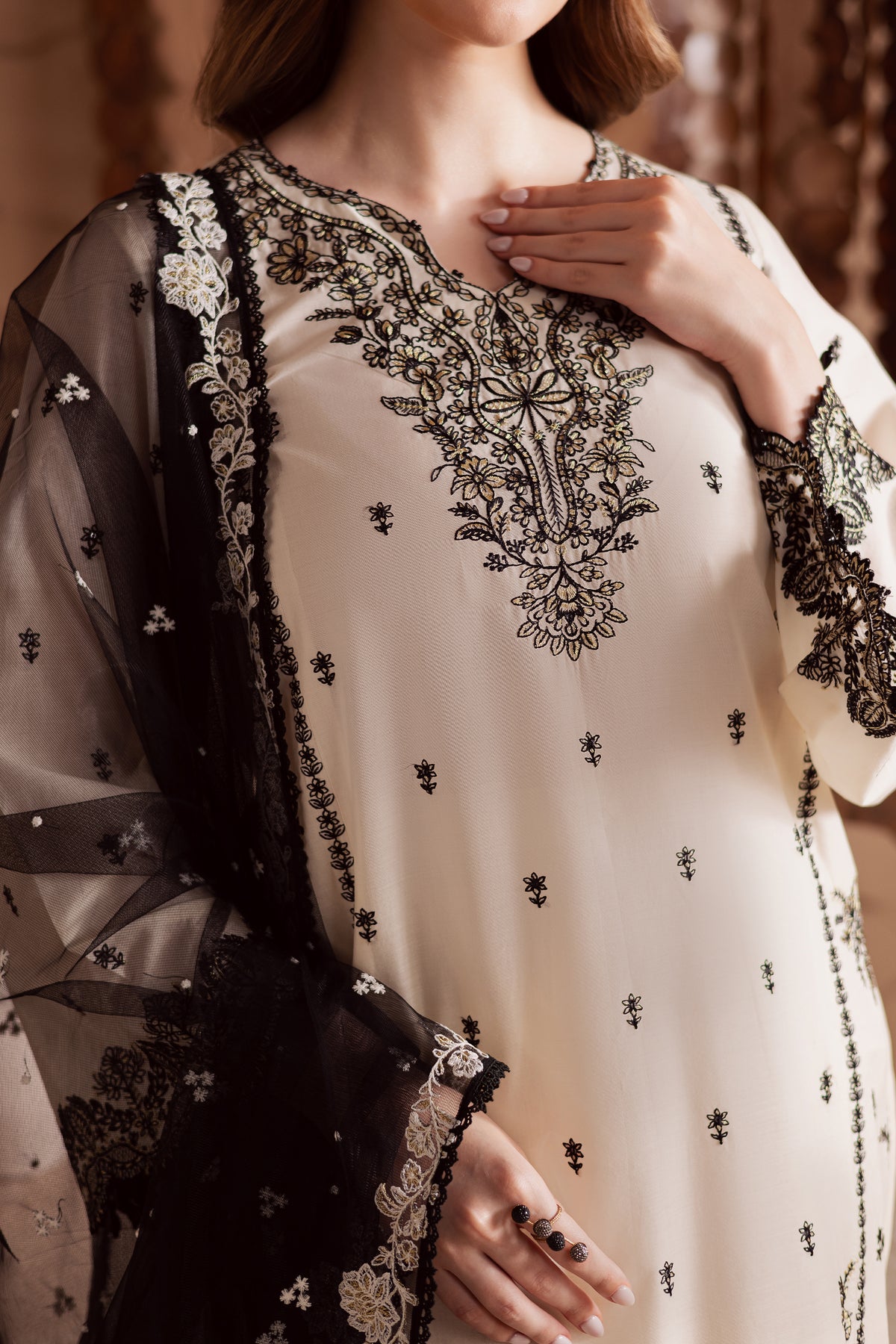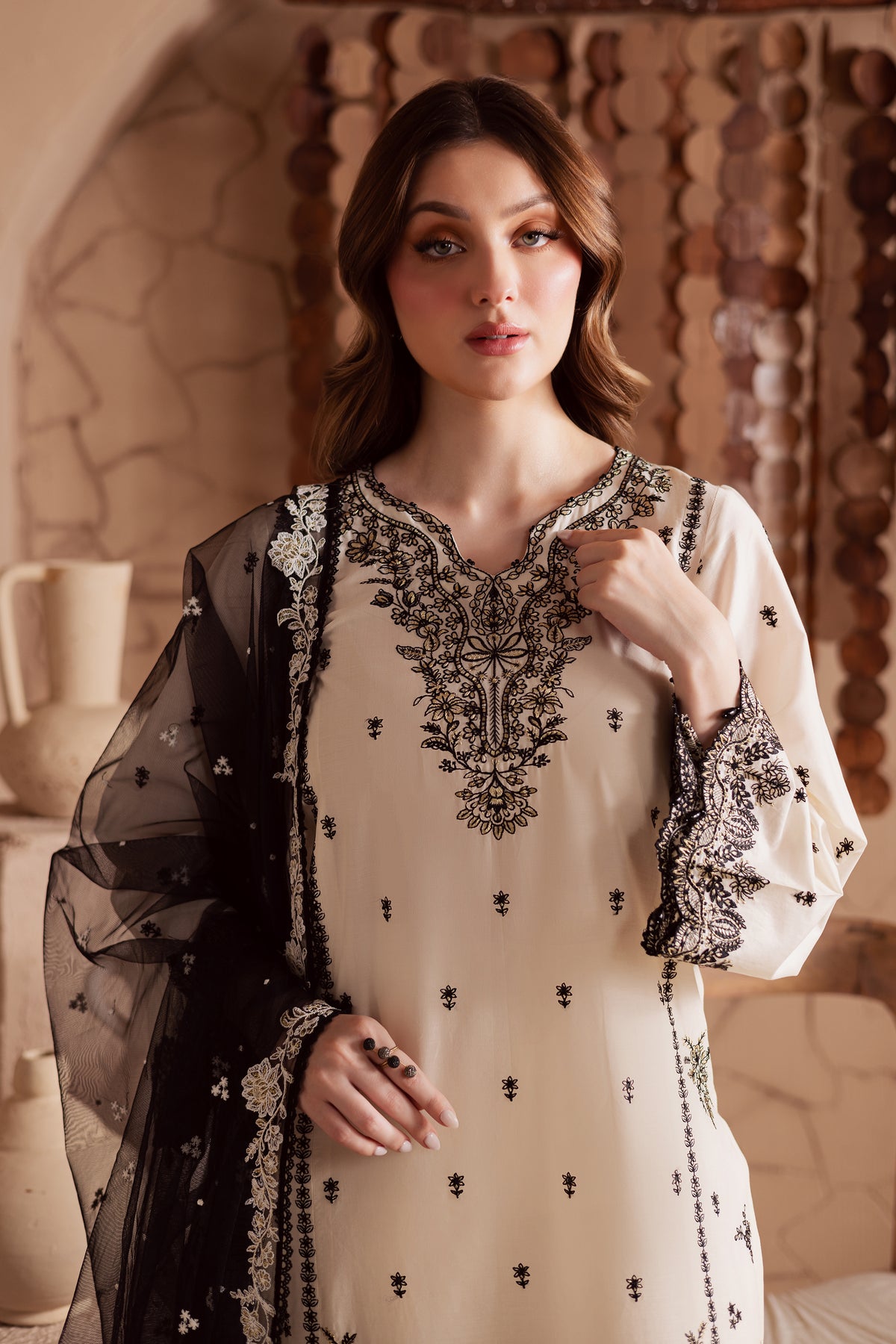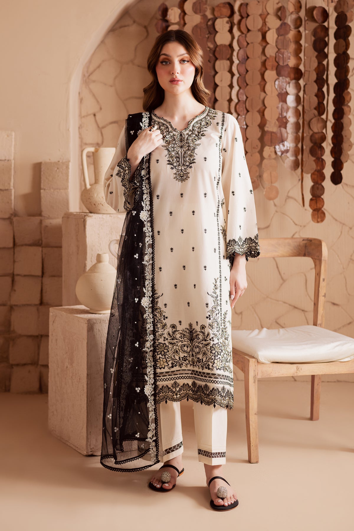 A graceful 3-piece ensemble featuring a off white long pima lawn shirt with a heavily composed embroidered hem that exudes timeless elegance. The shirt is further enhanced with an intricately embroidered neckline and delicately embroidered sleeves, adding texture and richness to the overall silhouette.
