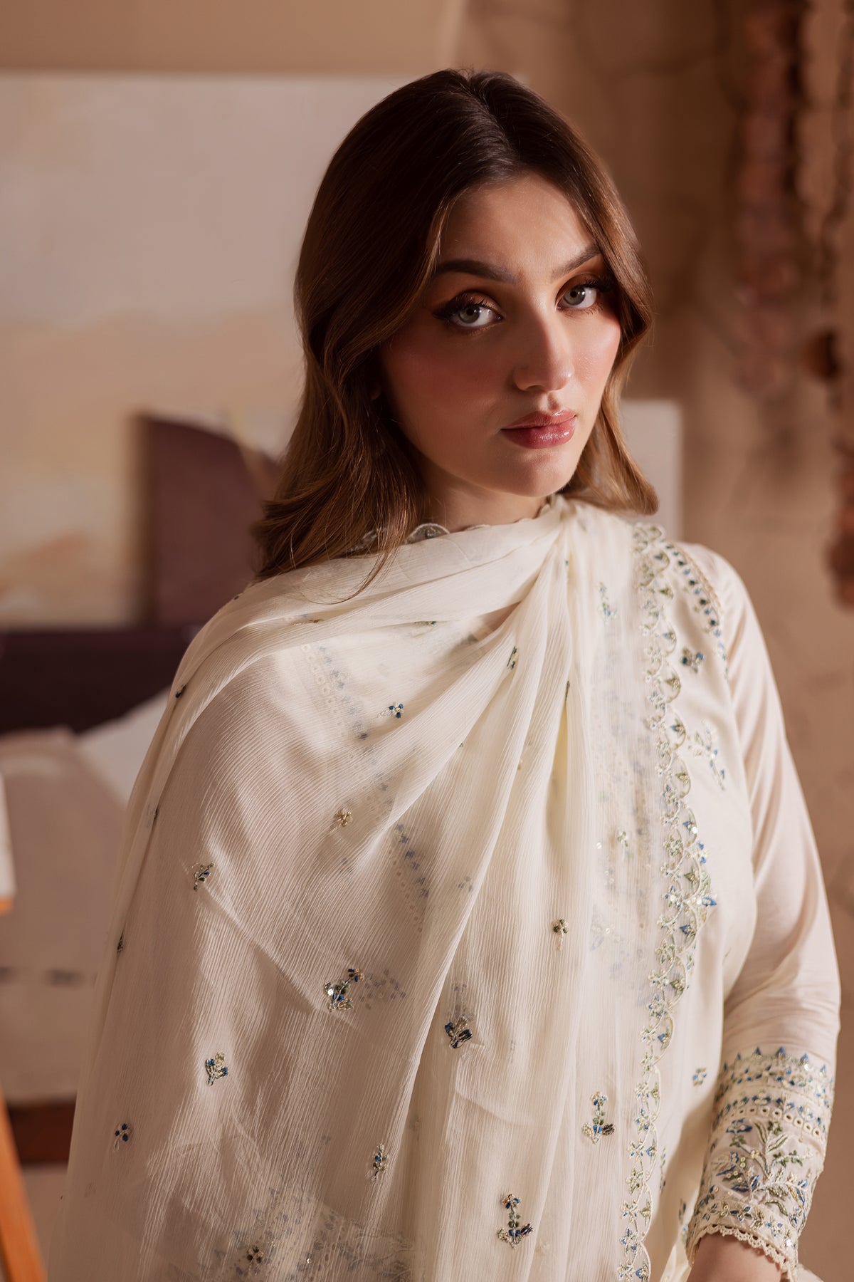 The ensemble is completed with a crinkle embroidered dupatta, adorned with a delicate spread and finished with scalloped embroidery on all four sides of the pallu, adding graceful movement and charm.
