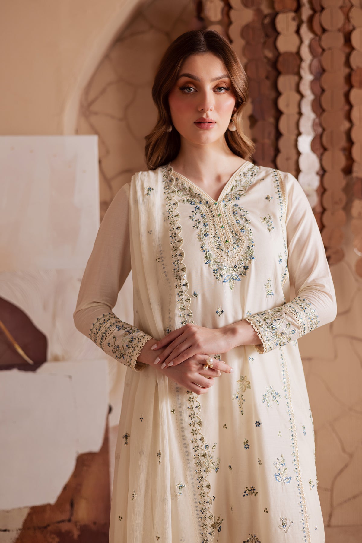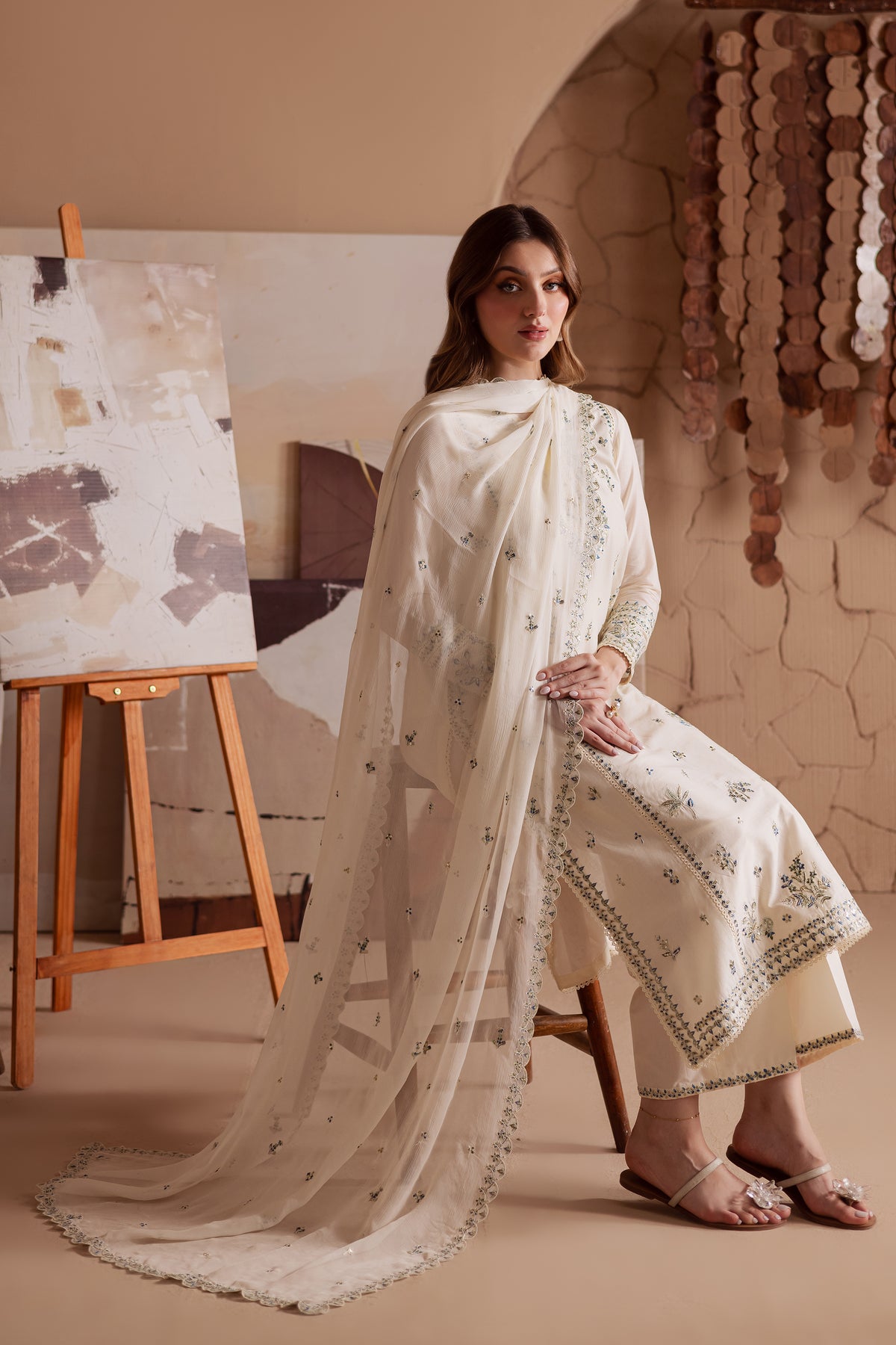 This elegant 3-piece outfit features a long pearl white pima lawn composed embroidered shirt, designed with intricate boring details along the neckline and side panels. The extended silhouette adds a touch of sophistication, while the embroidery offers a refined, textured look for both festive and semi-formal occasions.