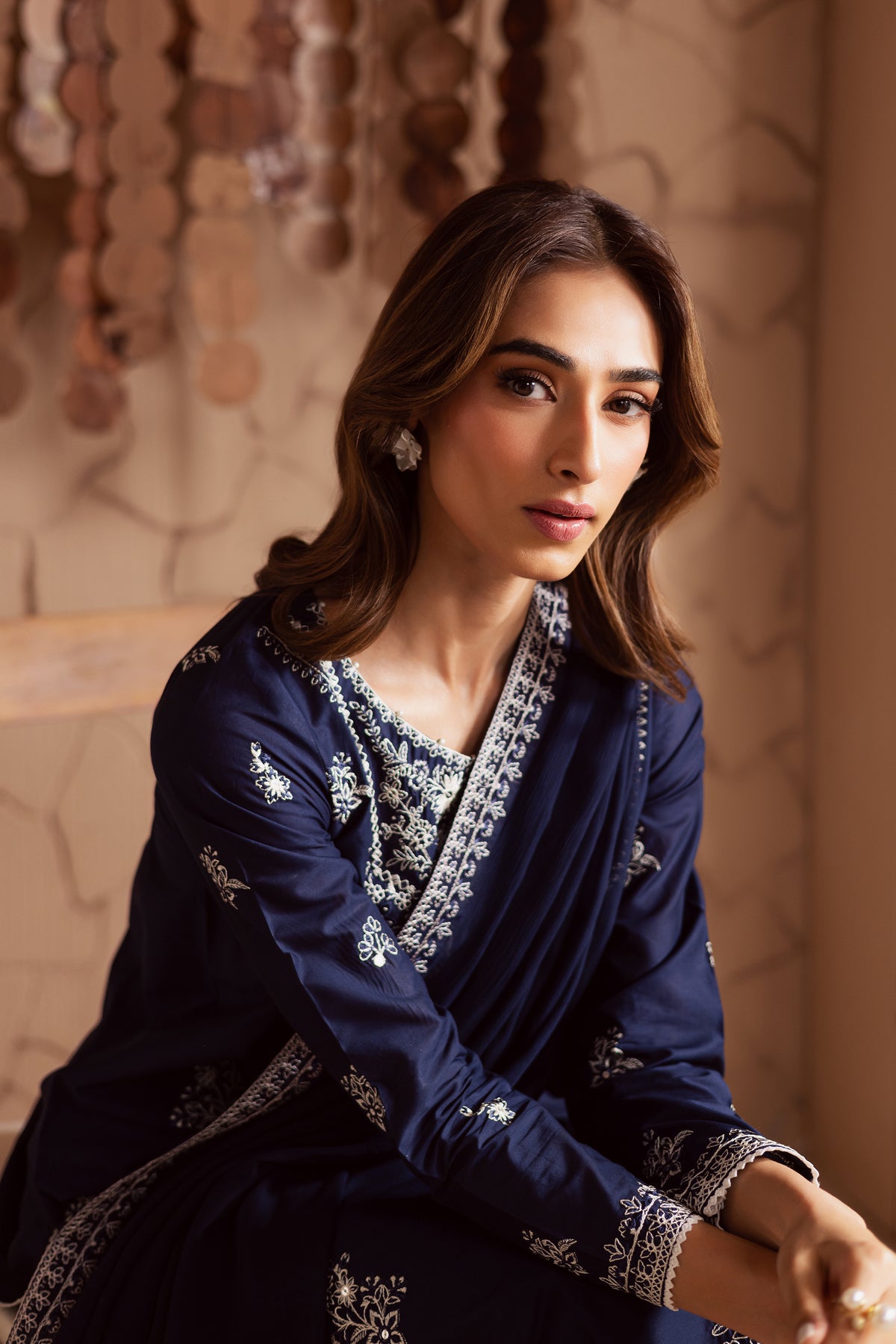 This 3-piece ensemble features a midnight blue straight long pima lawn shirt with a heavily embroidered neckline and spread, styled with a graceful boat neckline enhanced by a subtle V-cut. The embroidered sleeves with detailed borders are finished with delicate lace, adding a touch of refined elegance to the overall look.
