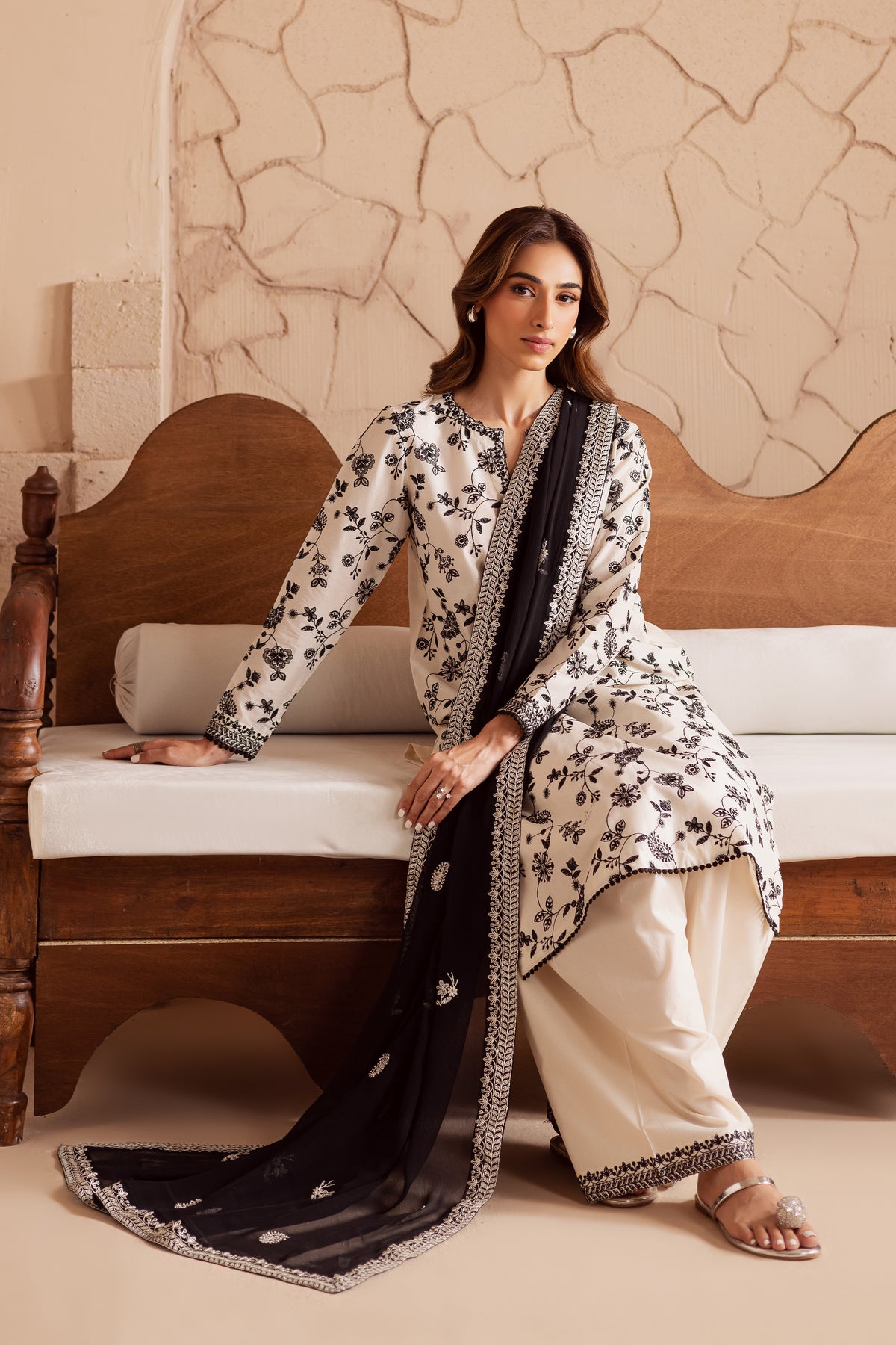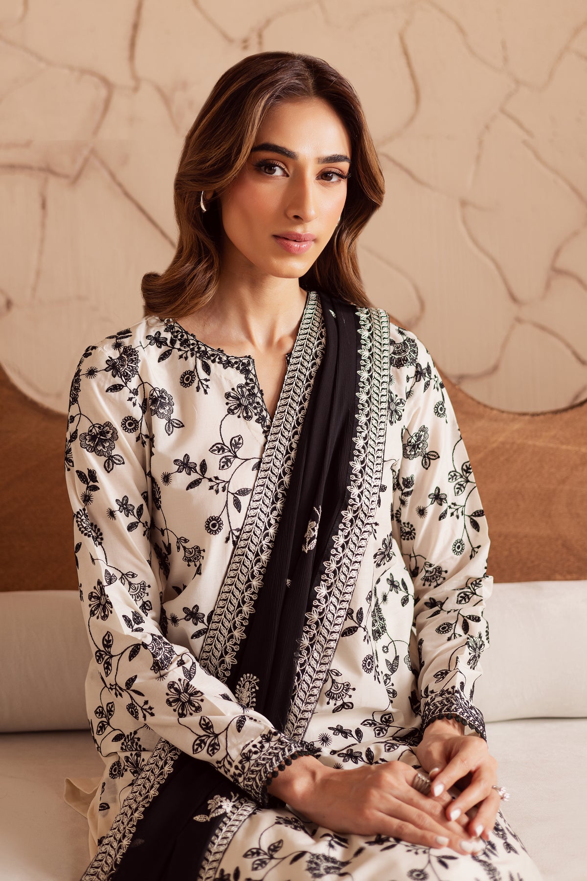 This 3-piece ensemble features a short off white pima lawn shirt adorned with an intricate embroidered jaal, styled with a flattering V-cut neckline and fitted sleeves for a sleek, modern silhouette. The delicate embroidery enhances its elegance, making it ideal for festive and semi-formal occasions.
