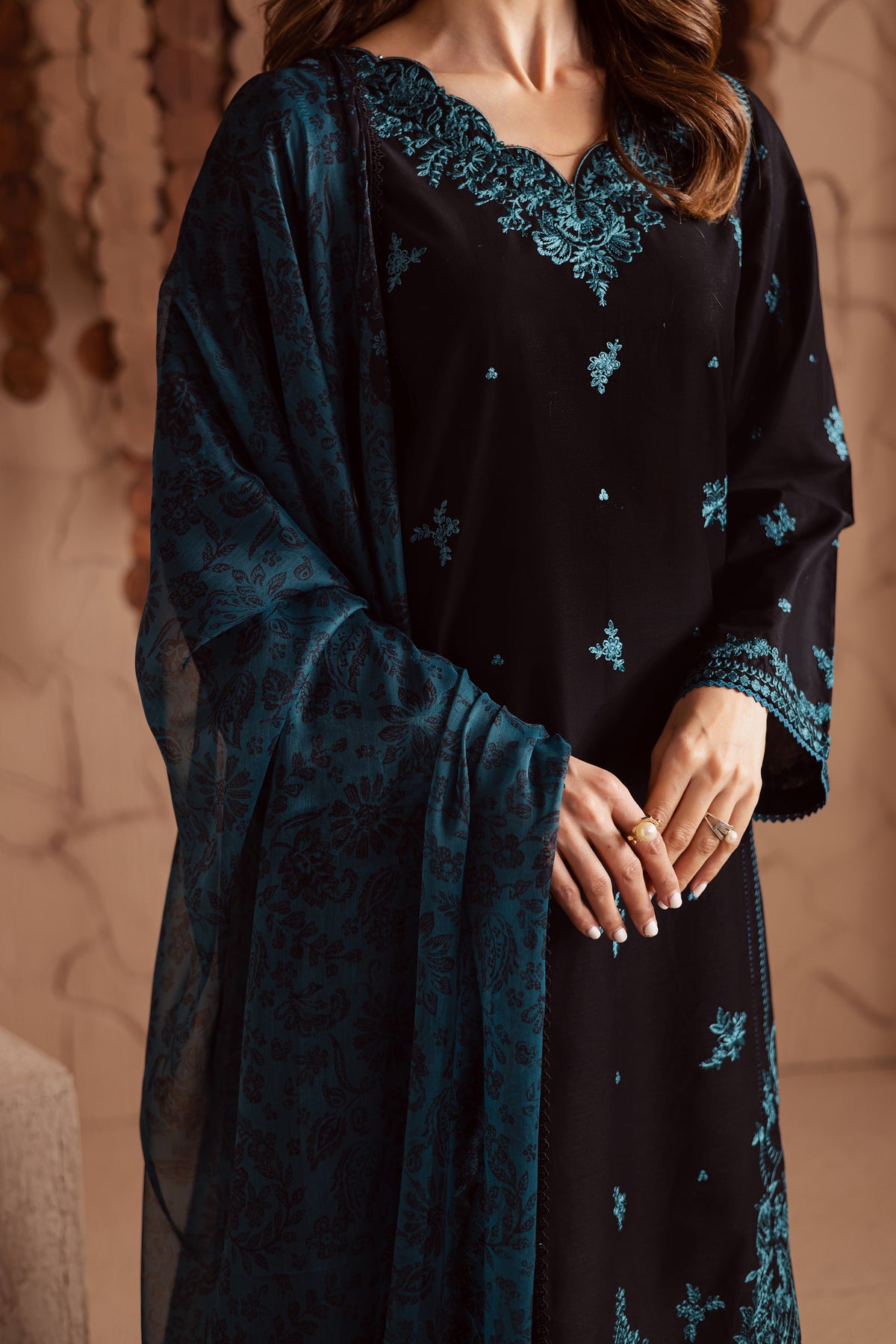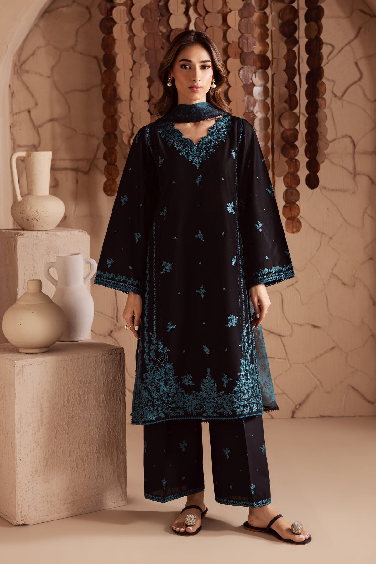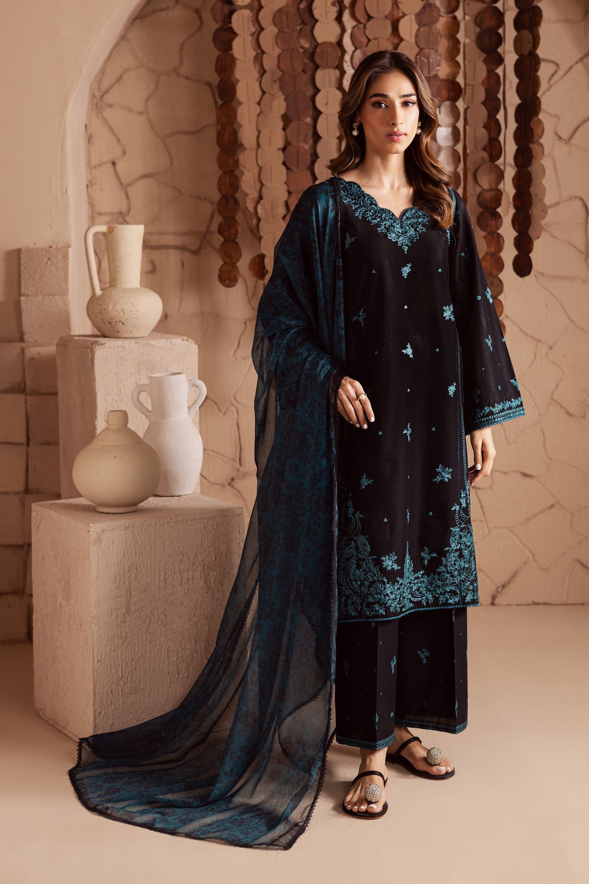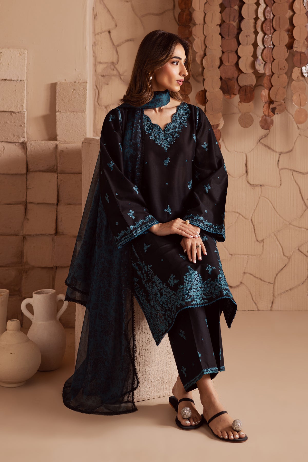 A radiant 3-piece outfit that blends tradition with contemporary charm. The black embroidered short pima lawn shirt features a heavily composed hem and intricate embroidery spread across the sleeves, creating a bold yet graceful statement.