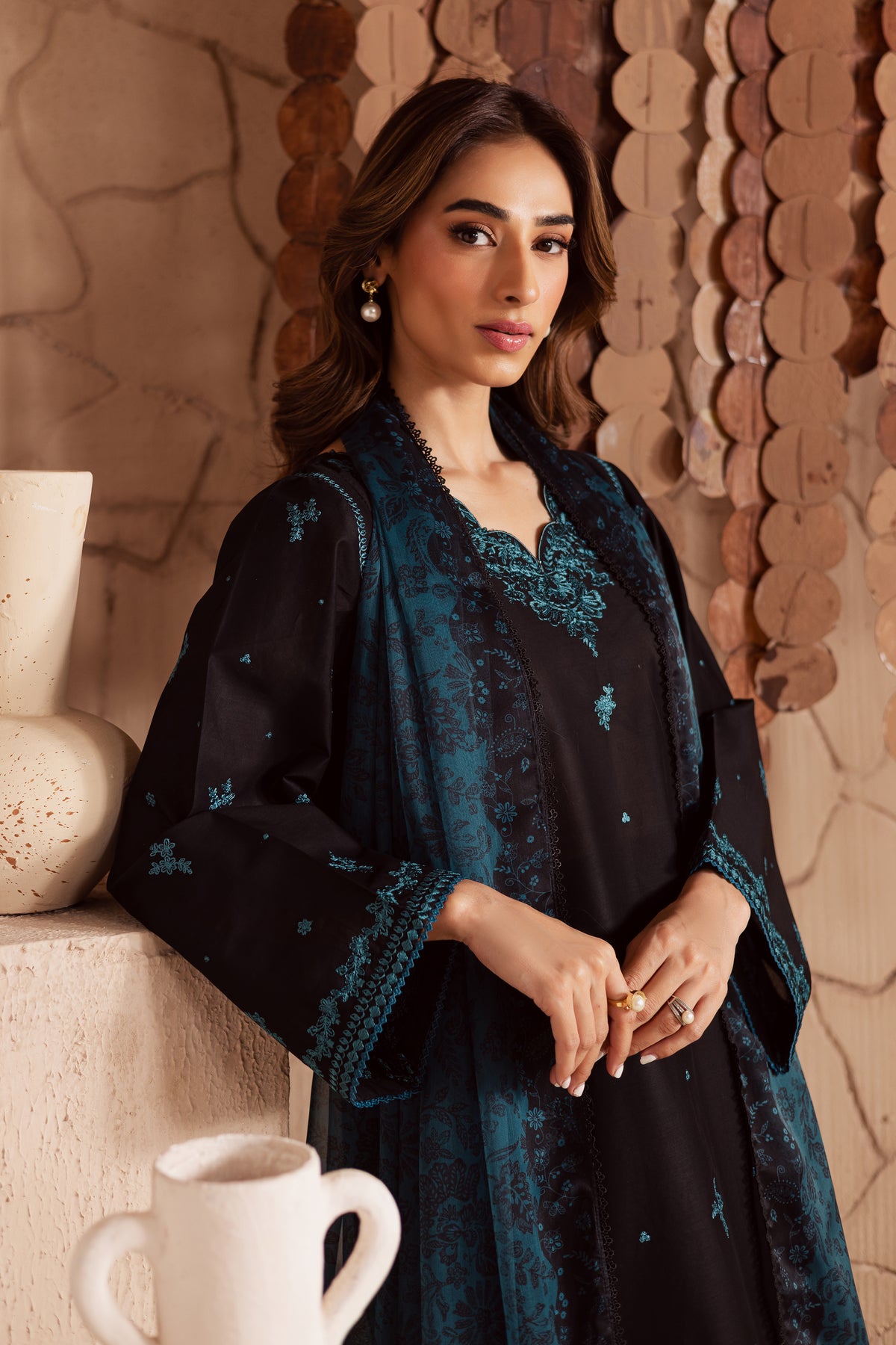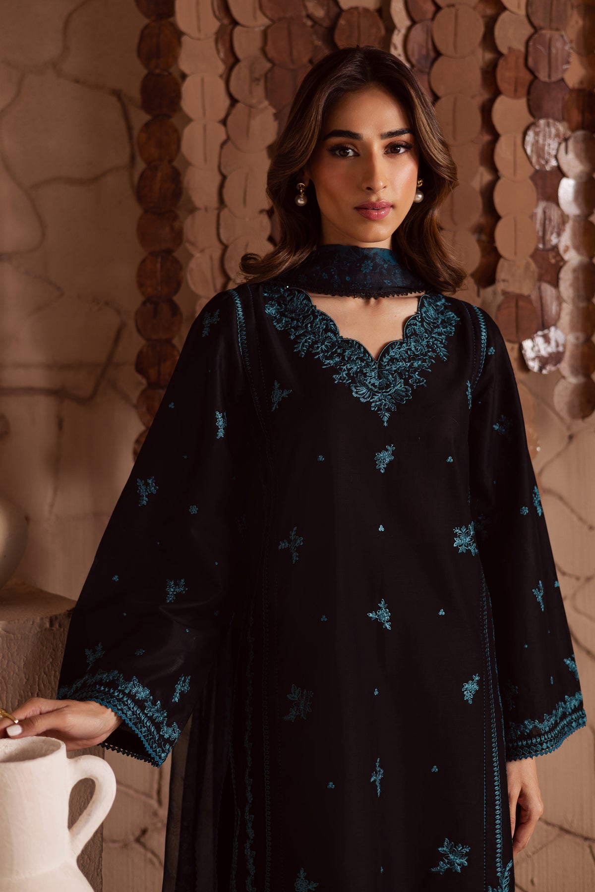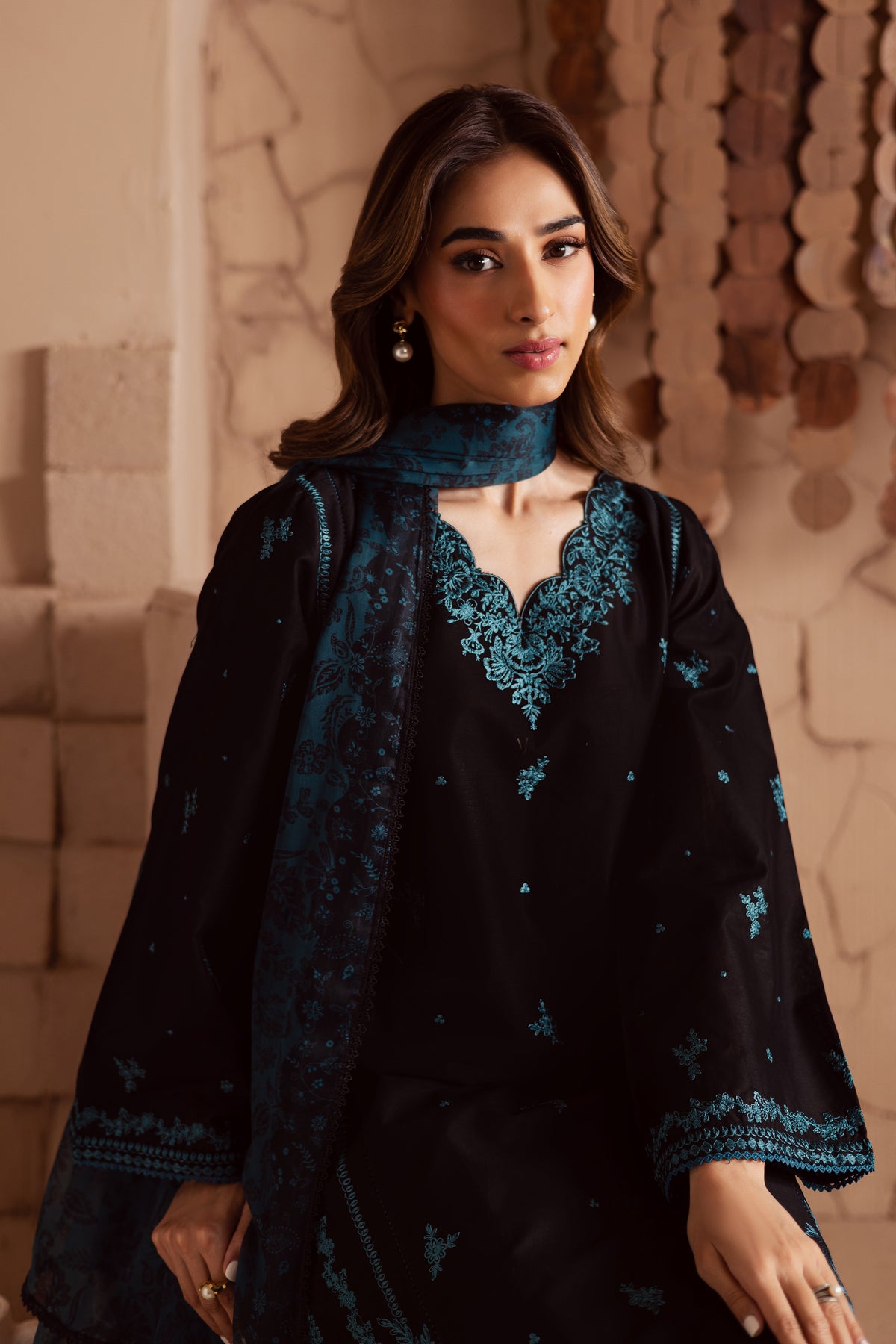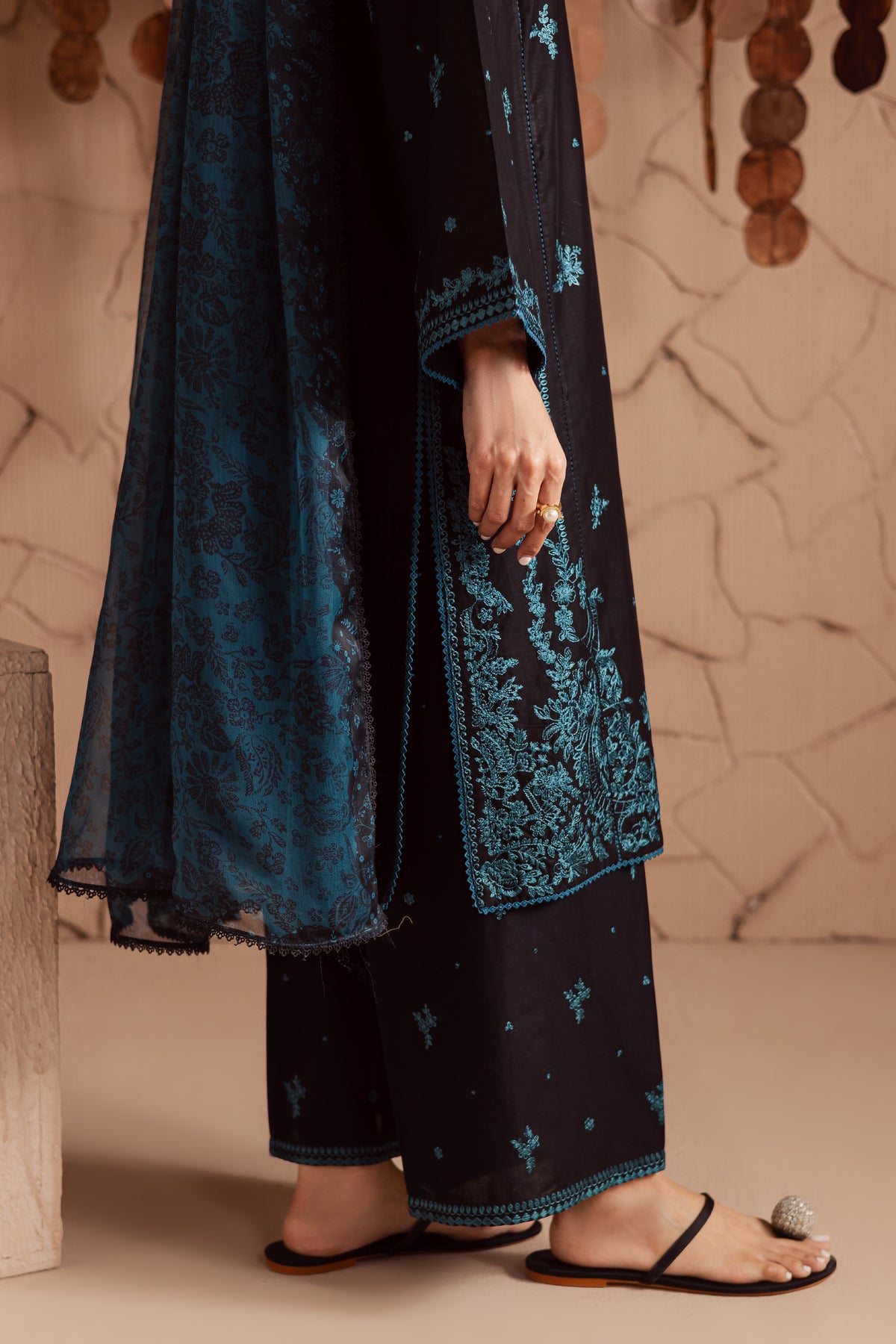 A radiant 3-piece outfit that blends tradition with contemporary charm. The black embroidered short pima lawn shirt features a heavily composed hem and intricate embroidery spread across the sleeves, creating a bold yet graceful statement.