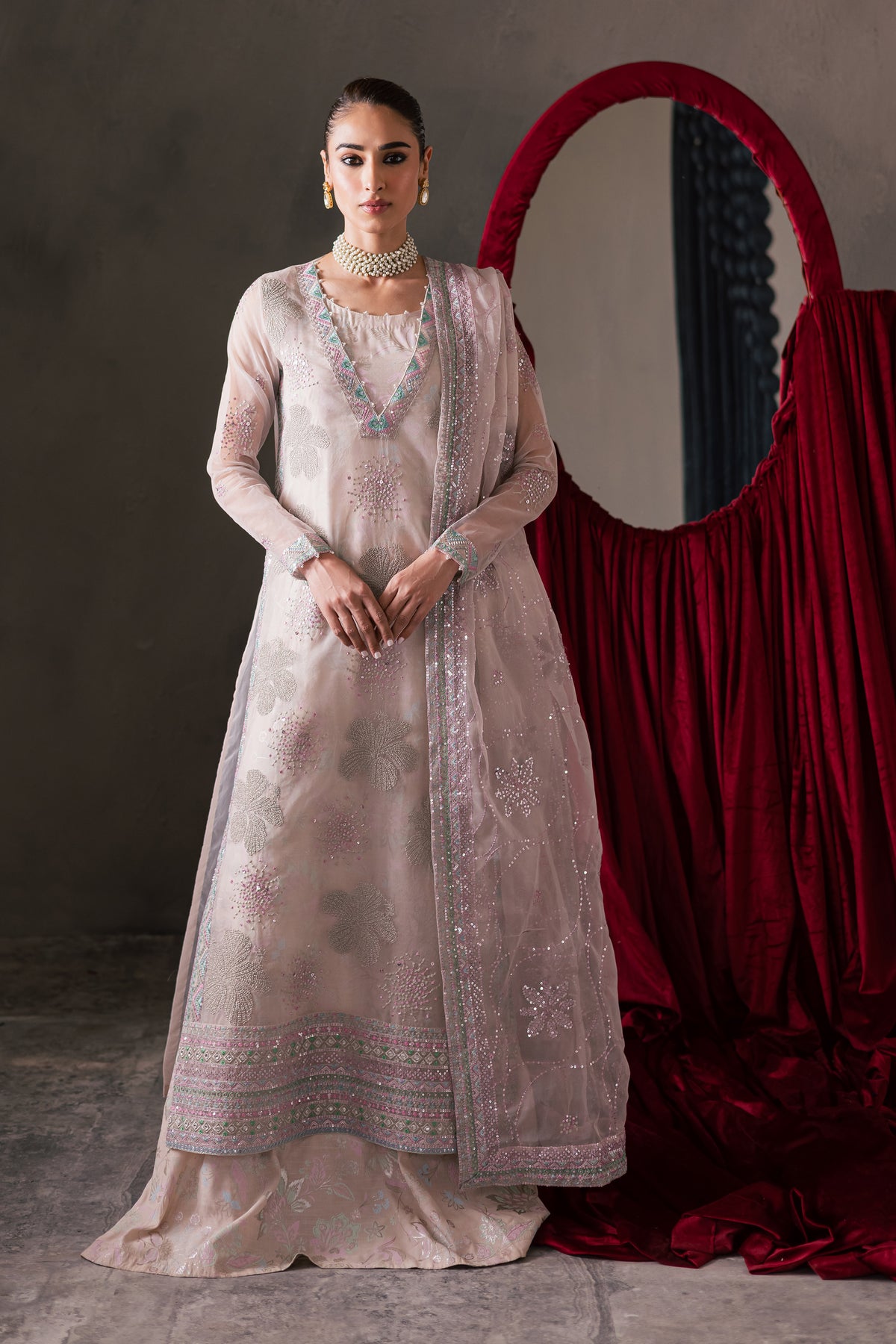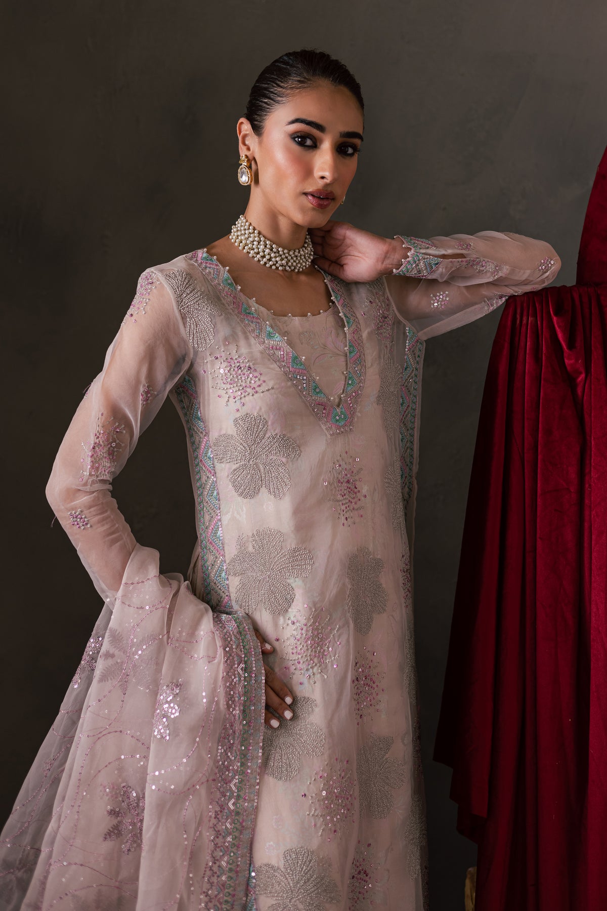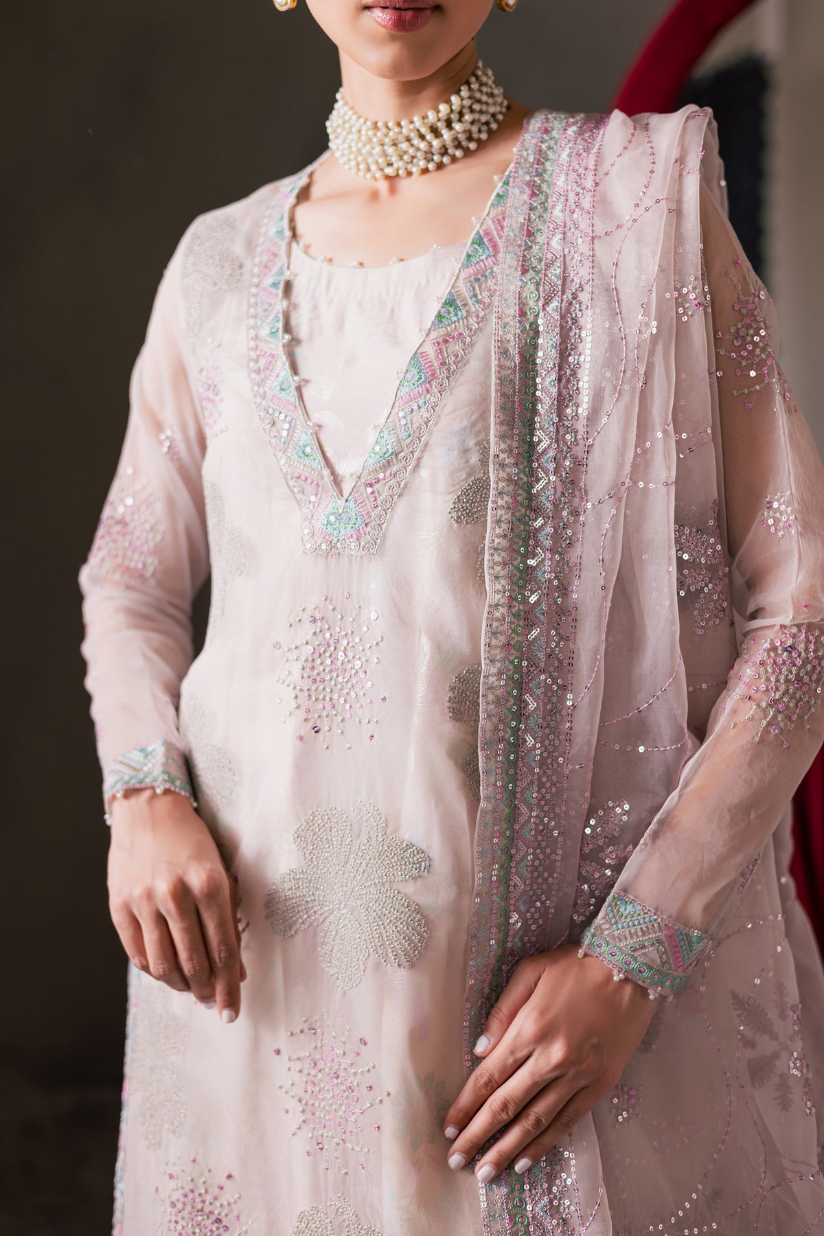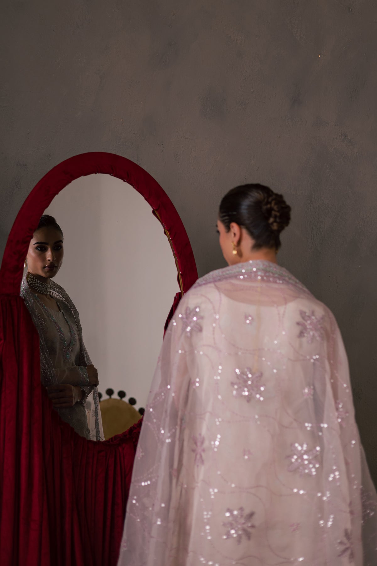 The ensemble is completed with an organza dupatta featuring delicate sequin embroidery, adding a hint of shimmer and sophistication to the overall look.