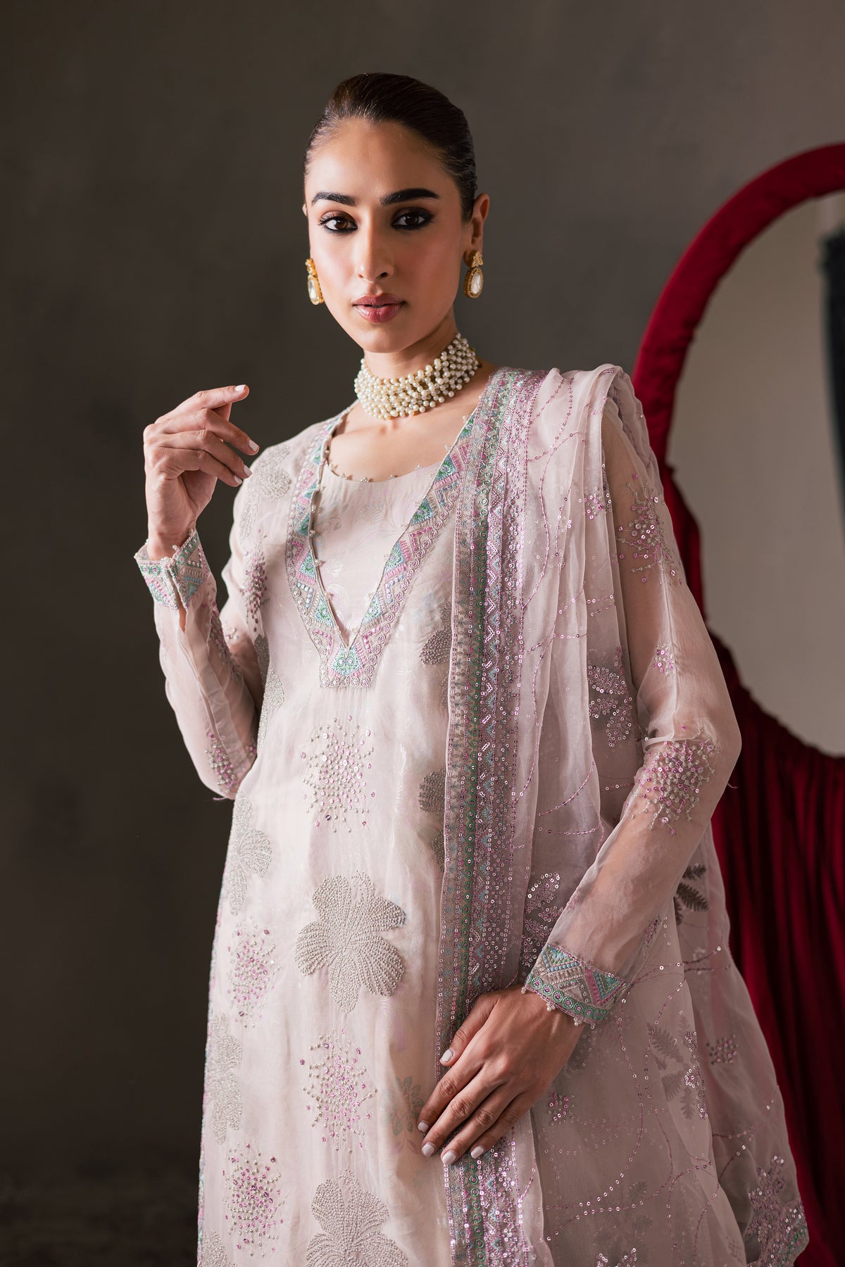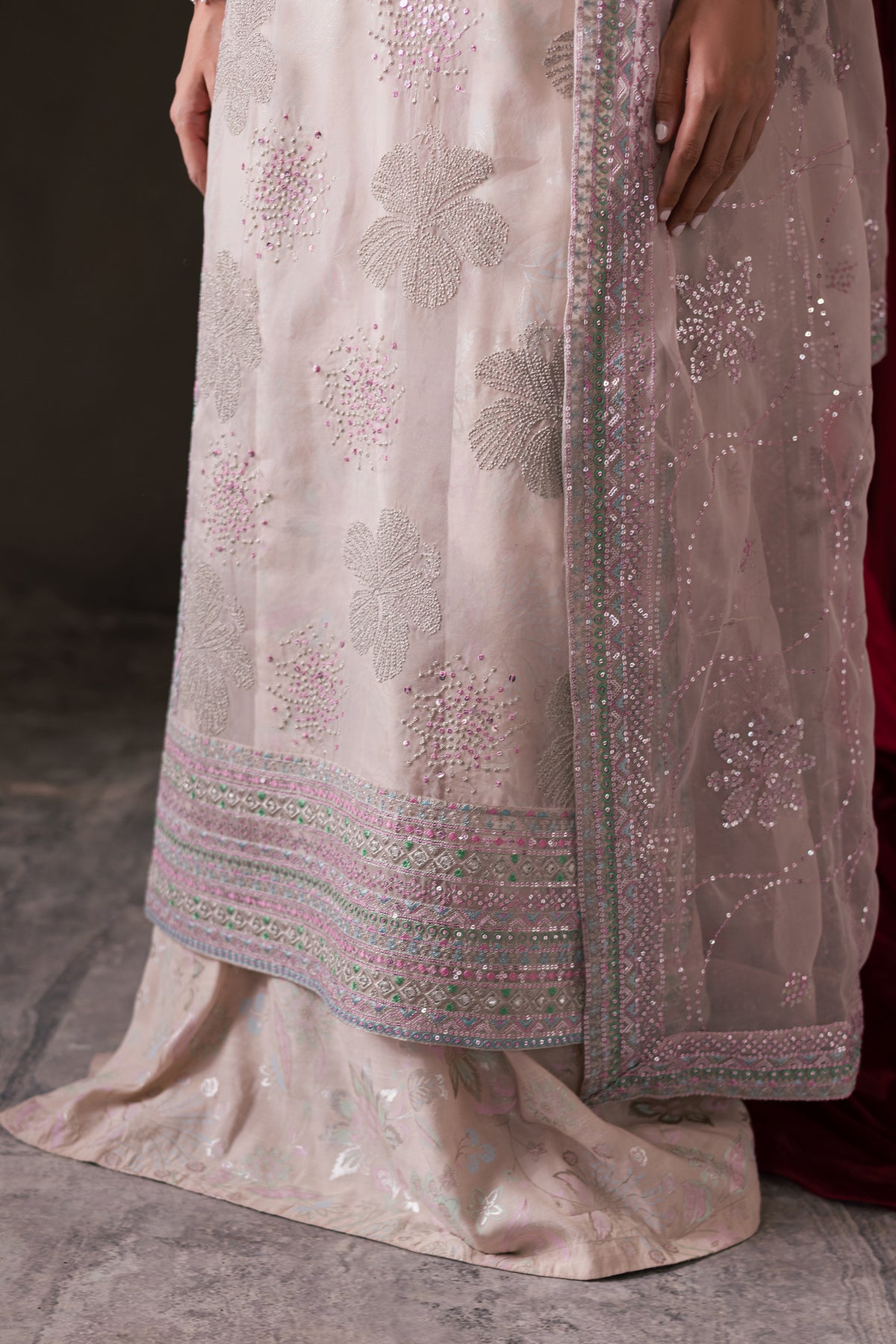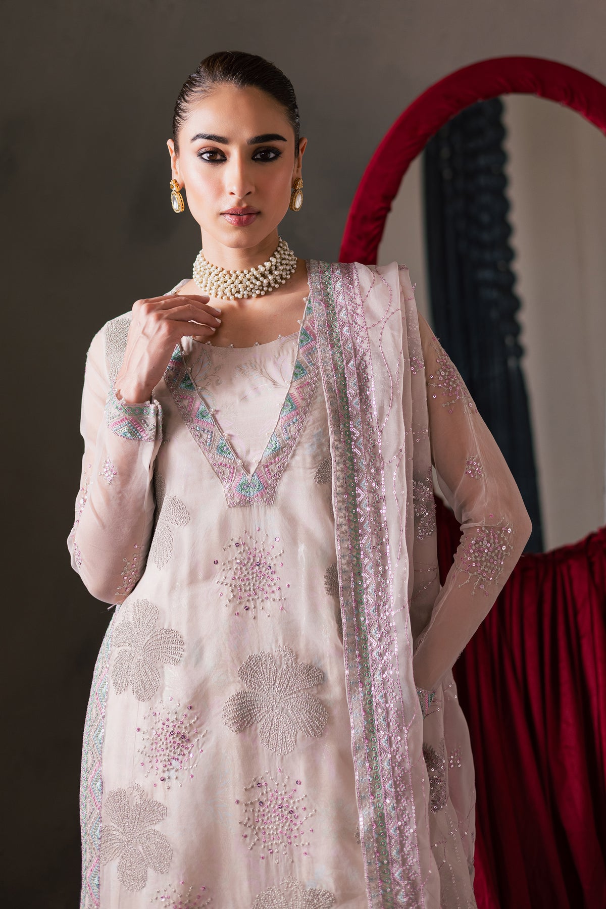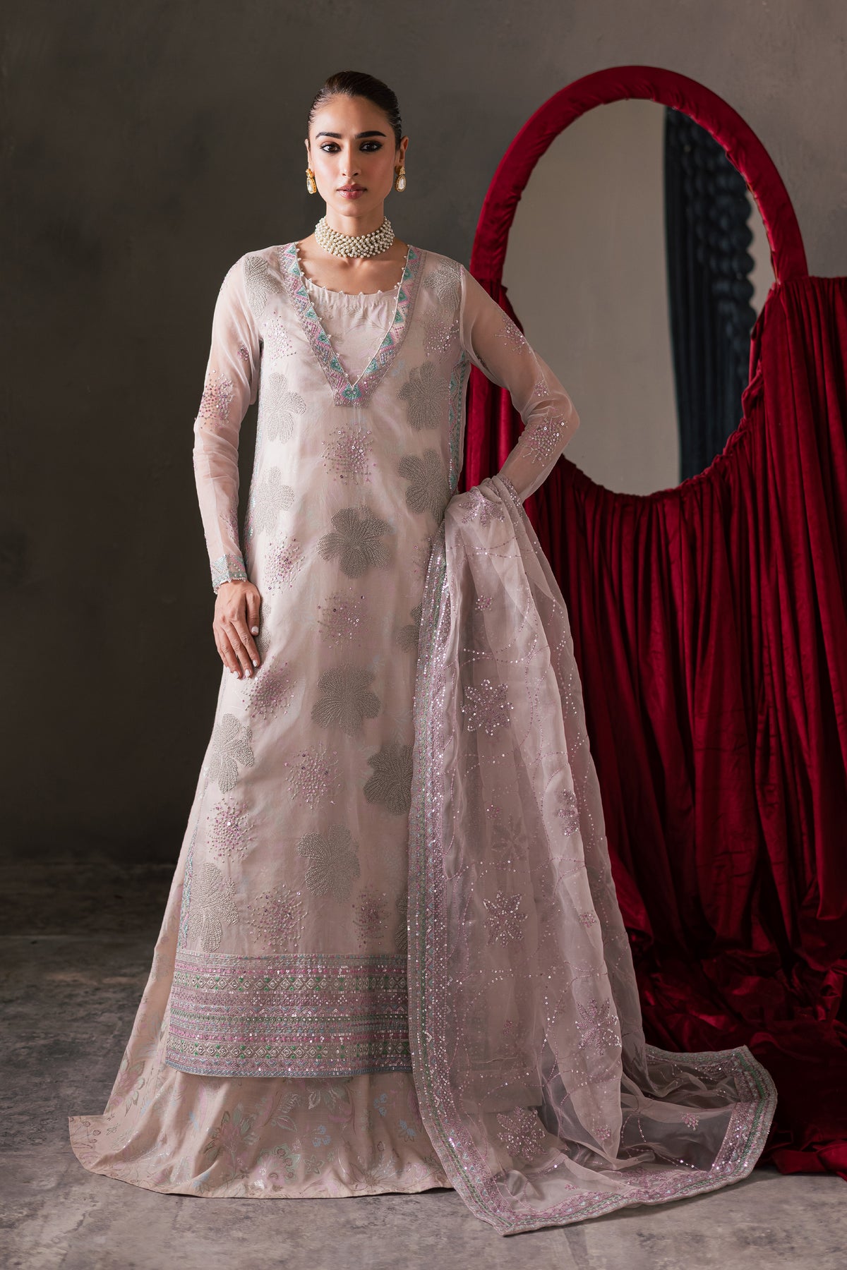 The ensemble is completed with an organza dupatta featuring delicate sequin embroidery, adding a hint of shimmer and sophistication to the overall look.