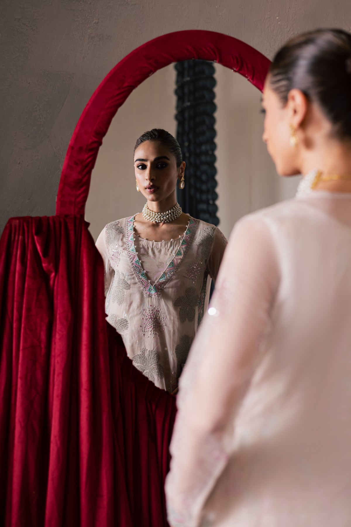 An embroidered organza straight shirt layered over a screen-printed inner frock creates a rich, multi-dimensional look. The top layer is enhanced with pearl detailing on the neckline and sleeves, and finished with an embroidered border along the hem for an elegant touch.