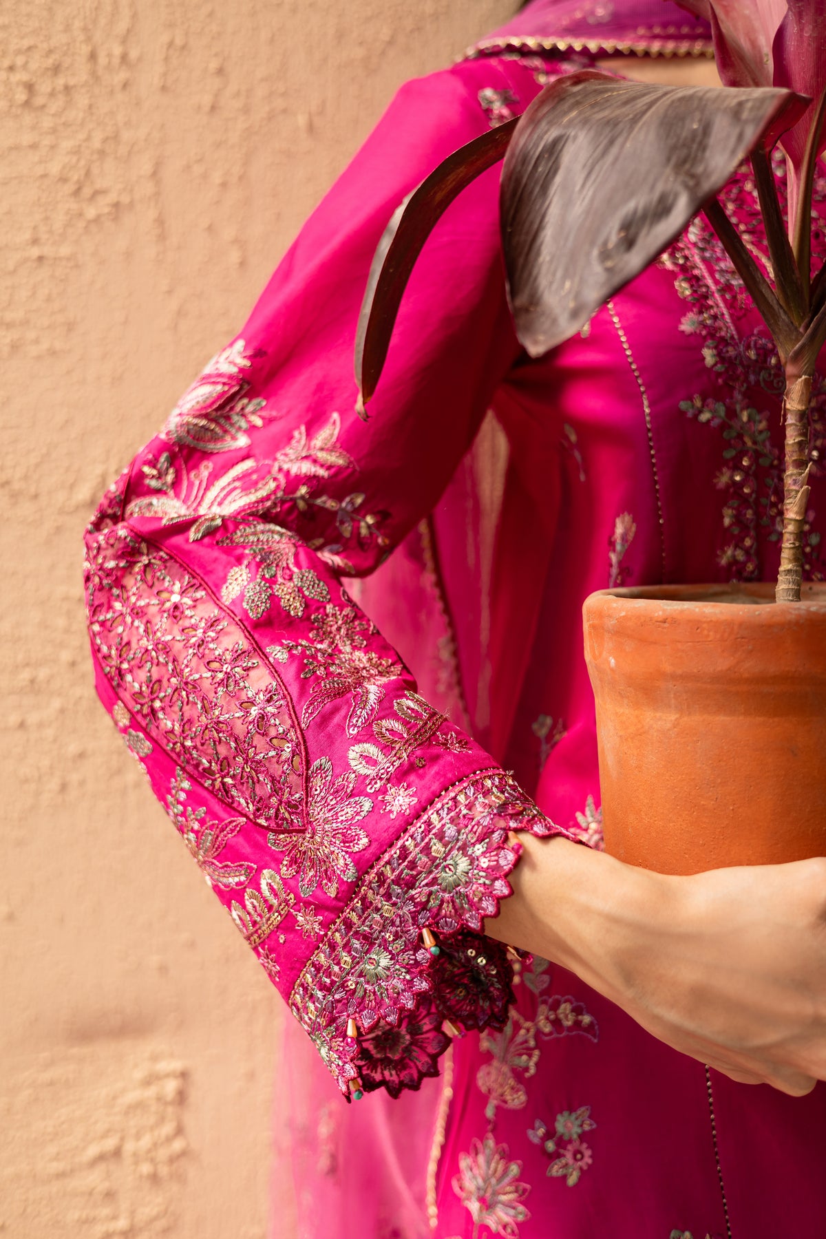 This pima lawn purple shirt features a long, front-open silhouette adorned with heavy embroidery throughout. The hem and neckline are beautifully composed with intricate detailing, including delicate bowring accents that adds a unique, feminine touch. The full-length sleeves are richly embroidered and finished with elegant borders on both the sleeve and shirt hems, making this piece truly stand out.