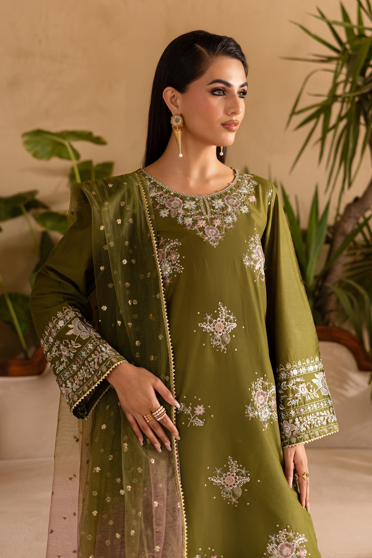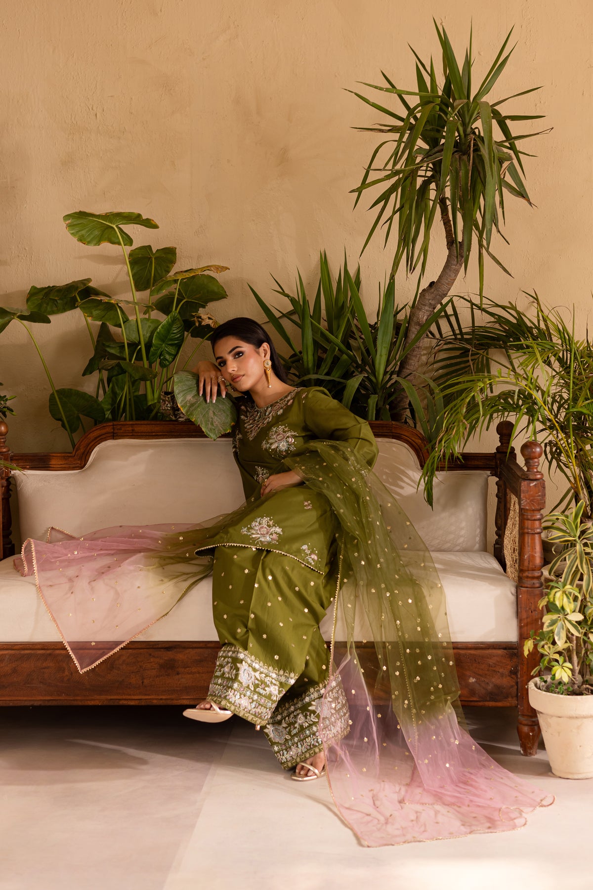 This mehndi green pima lawn short shirt is adorned with a rich embroidery spread, beautifully balanced by intricate detailing along the neckline, creating a refined focal point. The sleeves are framed with heavily embroidered borders, finished with delicate lace that adds a feminine and elegant touch.